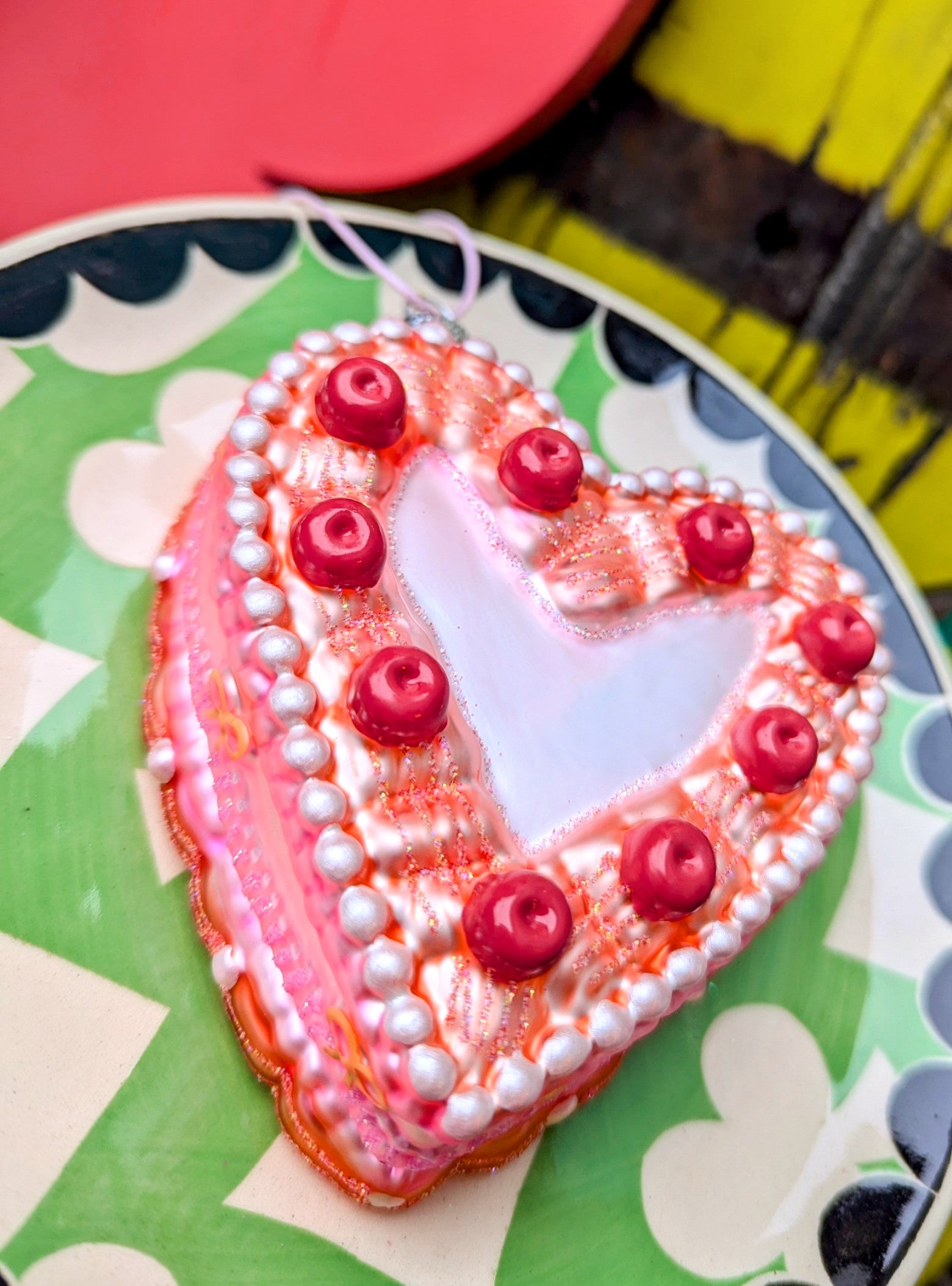 Back to the 1960's tinted colour cookbooks!!! This super, extra kitsch heart cake is bringing it, with cherries, bows and pink glitter a plenty! Hand painted and glittered glass bauble!!