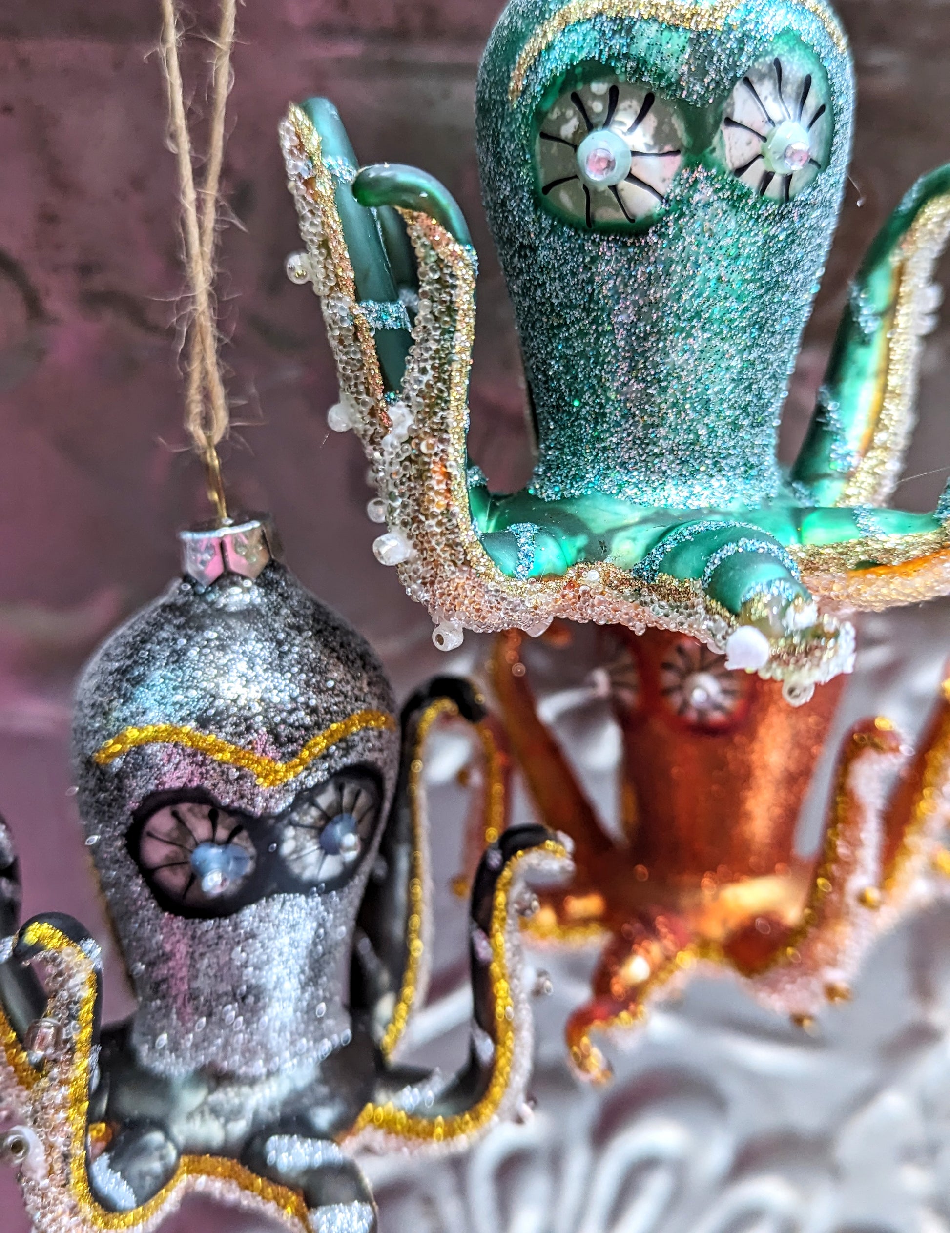 Kitsch octopus seaside christmas bauble. This hand blown Octopus ornament is a great addition to your Christmas tree or festive holiday display.