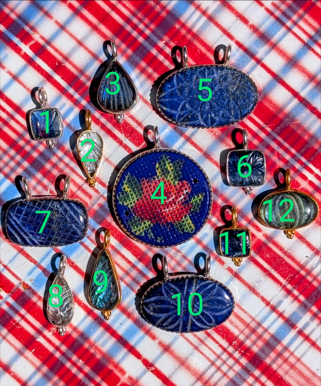 A gorgeous selection of hand carved stones we collected in Jaipur, Rajasthan, and a fabulous vintage glass, hand painted French rosey brooch finding, all set in fancy silver bezel or bobbles to make loveliest pendants, some we had gold plated, and some we left silver, something for everyone!