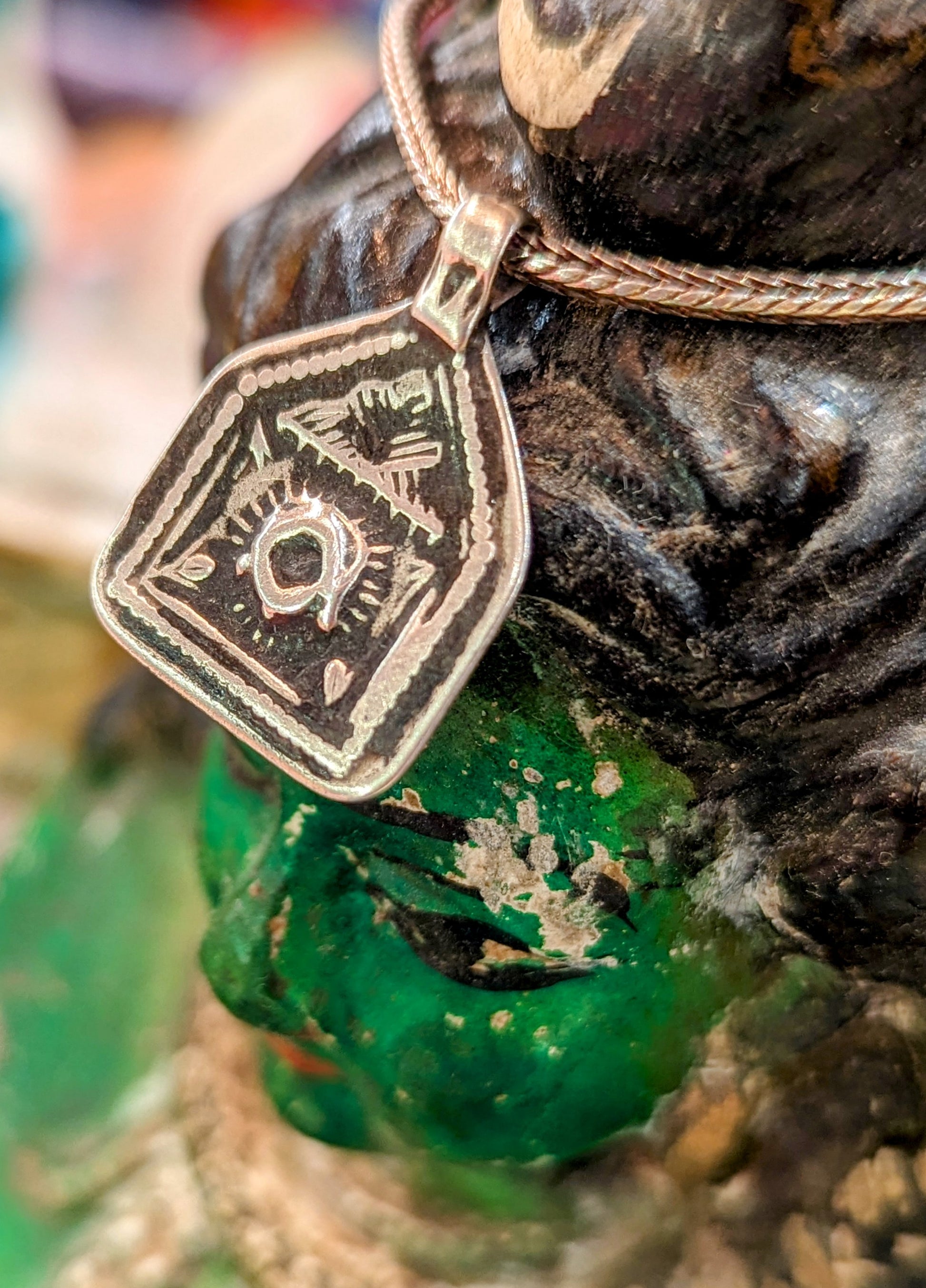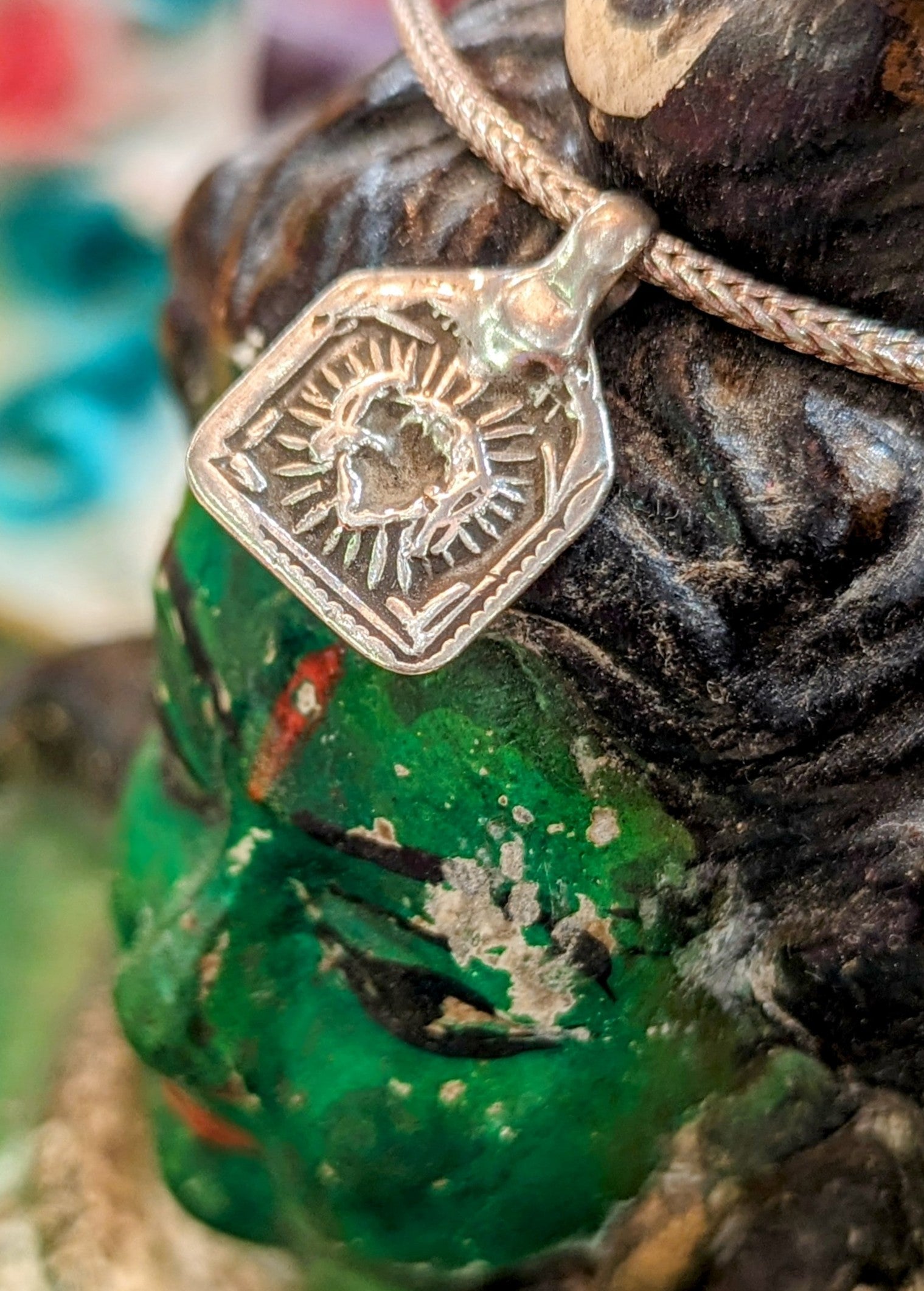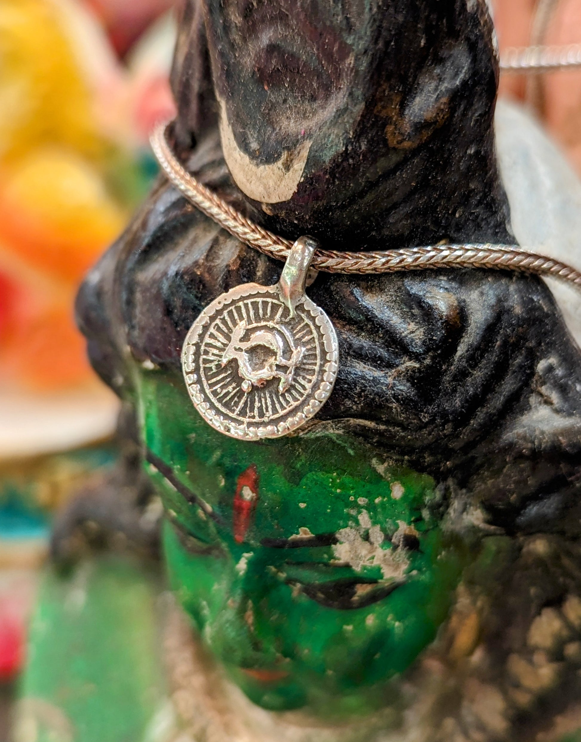 Beautiful Indian amulet pendants depicting Surya, worshipped for his powers in dispelling darkness, curing disease, and heating and illuminating the world.