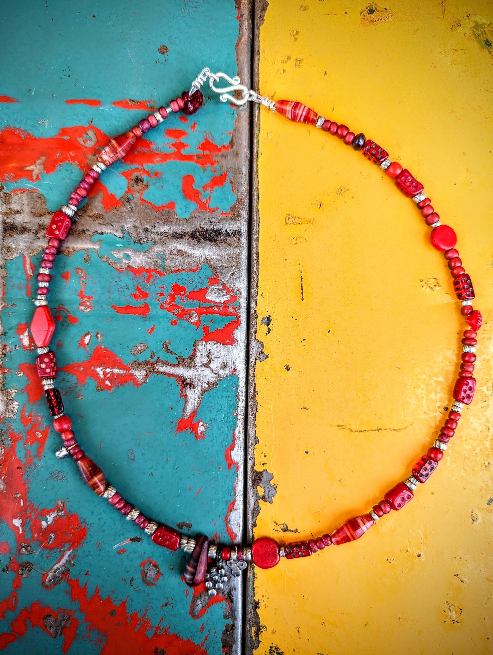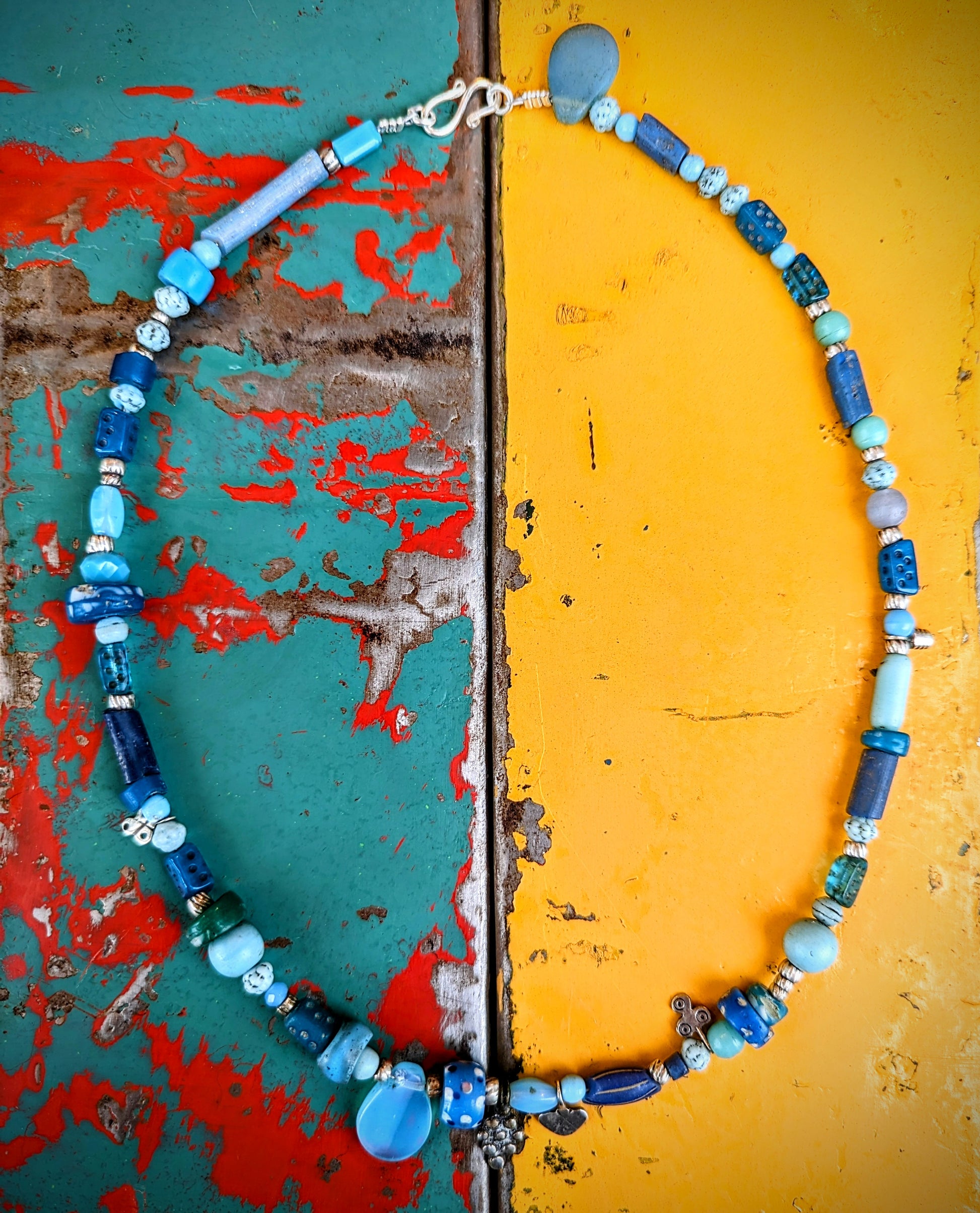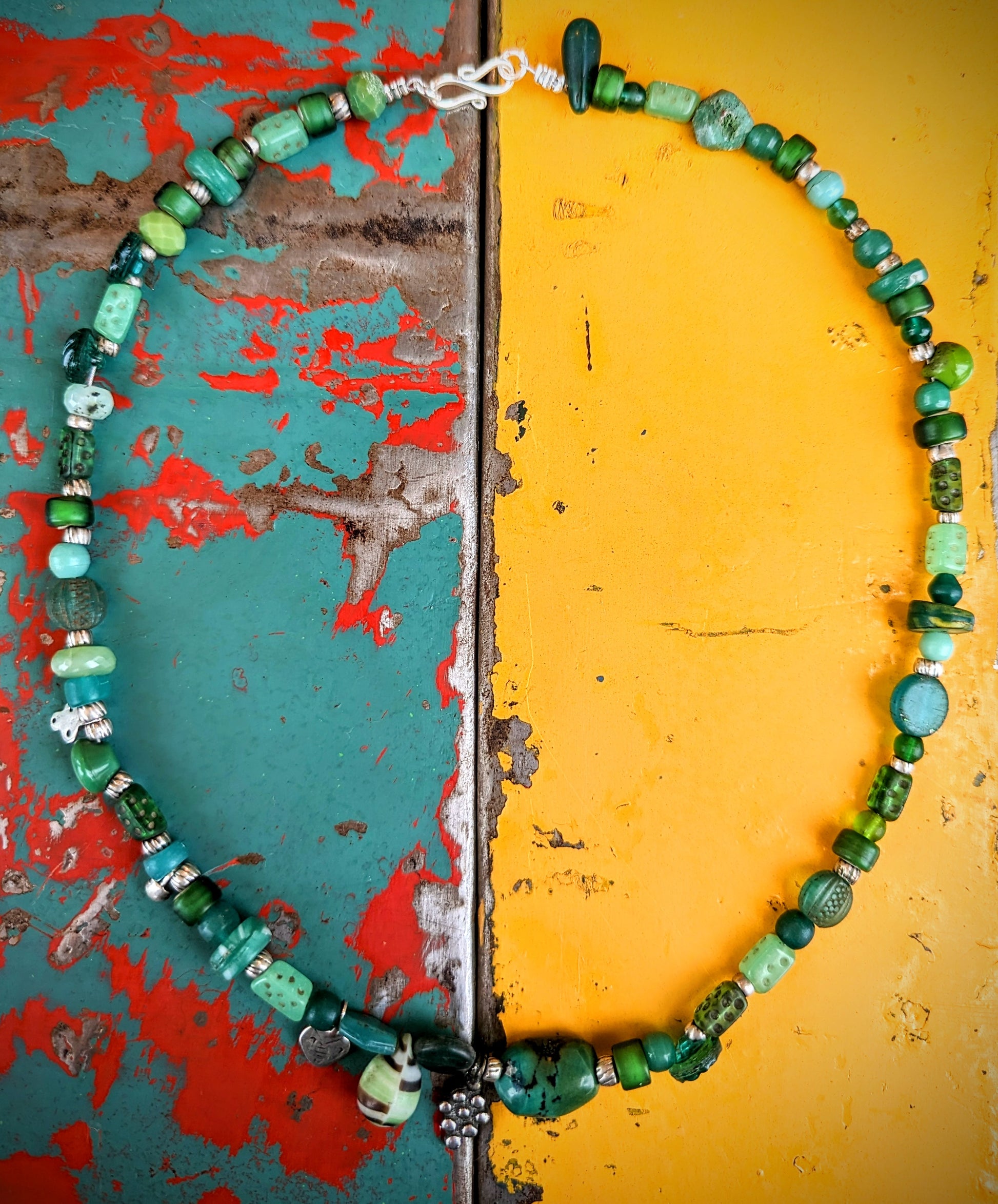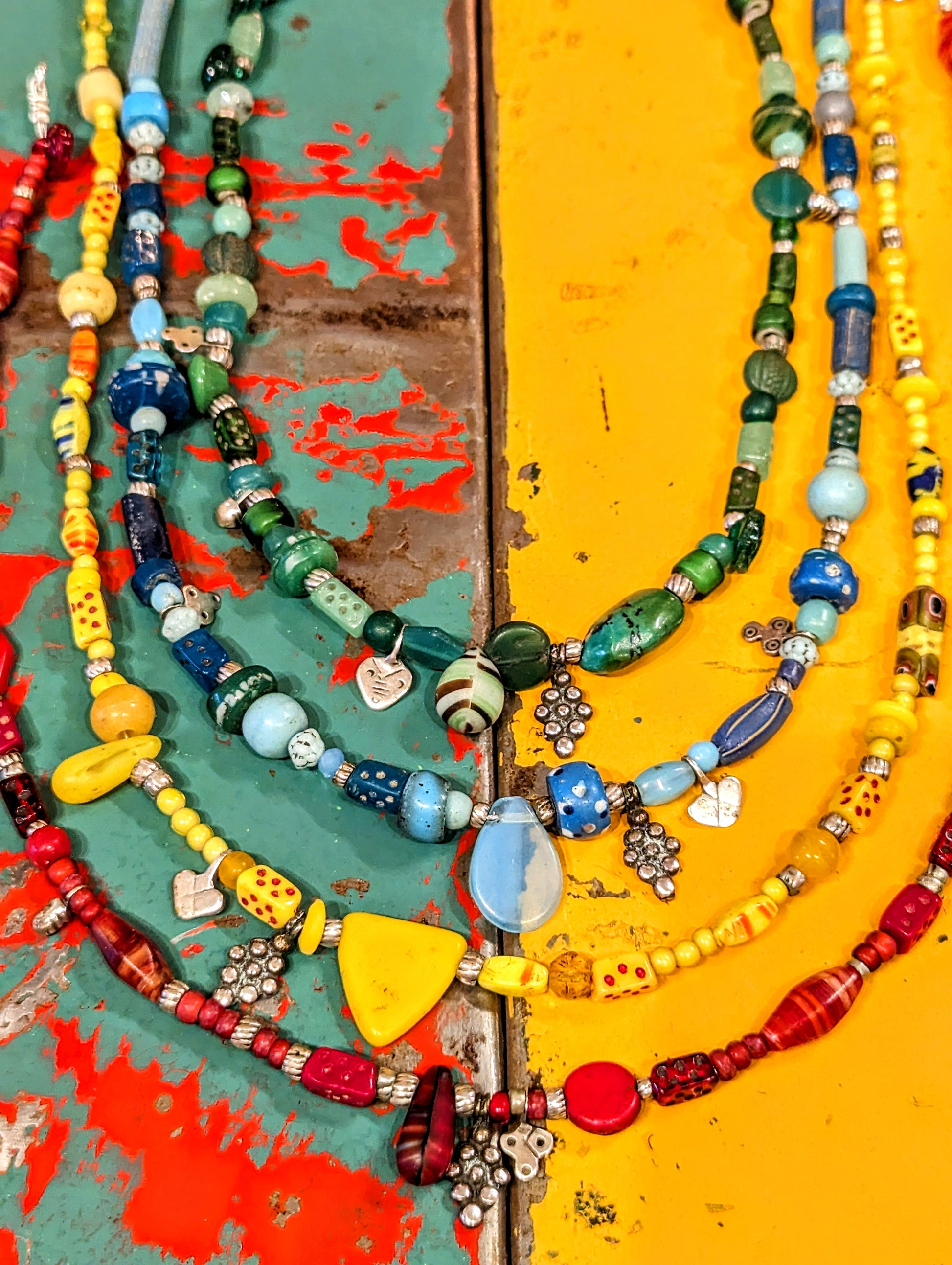 Antique and vintage Bohemian and Venetian glass trade beads all different shapes and sizes, including beautiful delicate dice beads, threaded with all different, all unique, antique Saharan Africa silver pendants and beads.