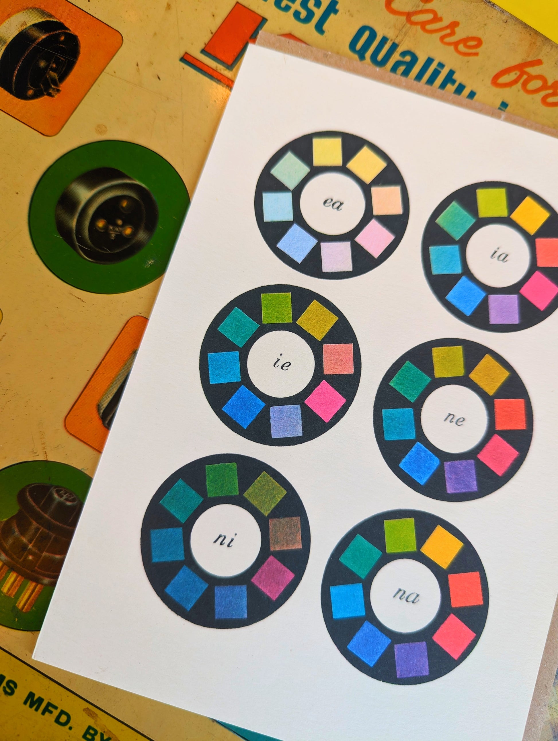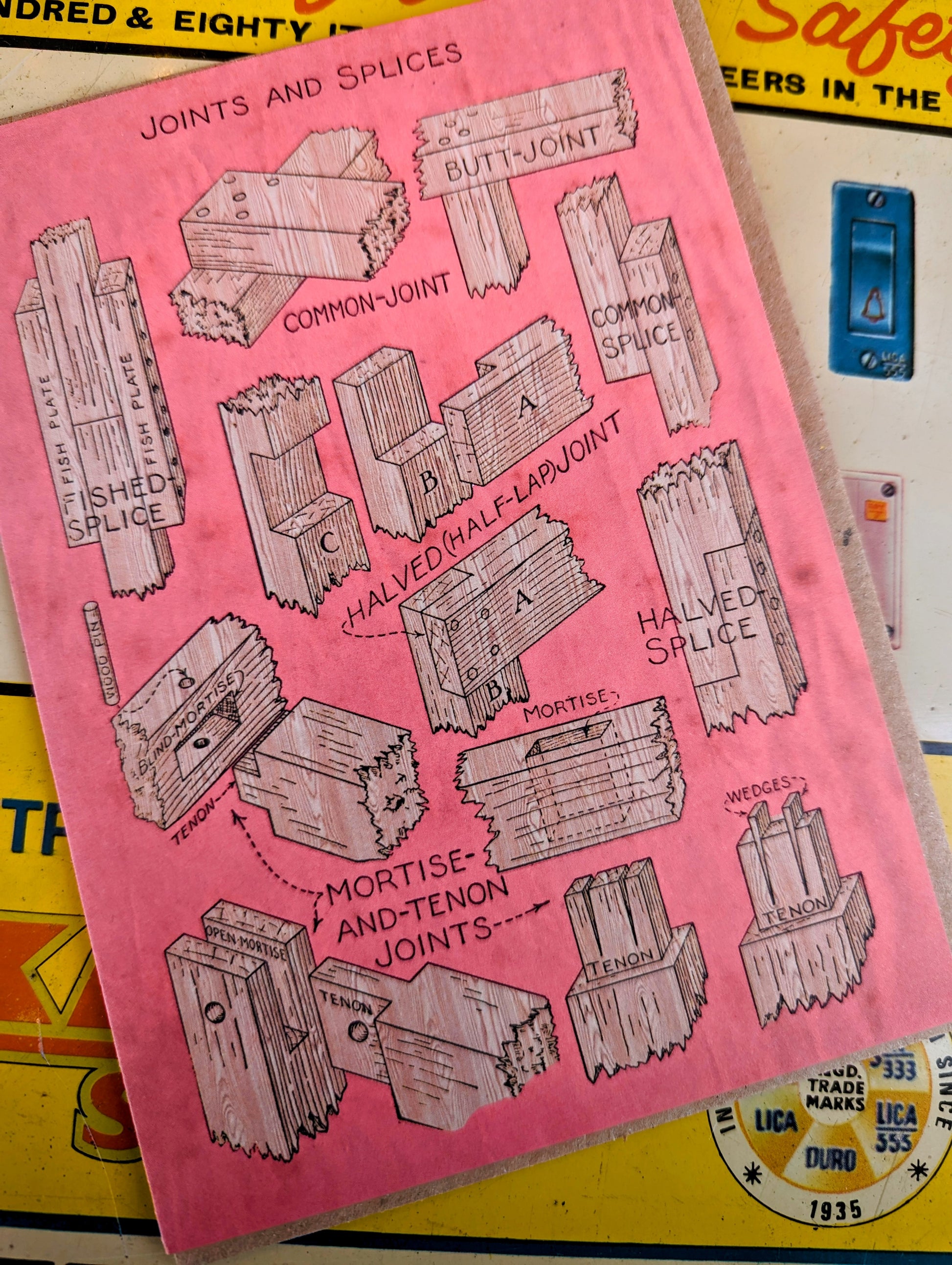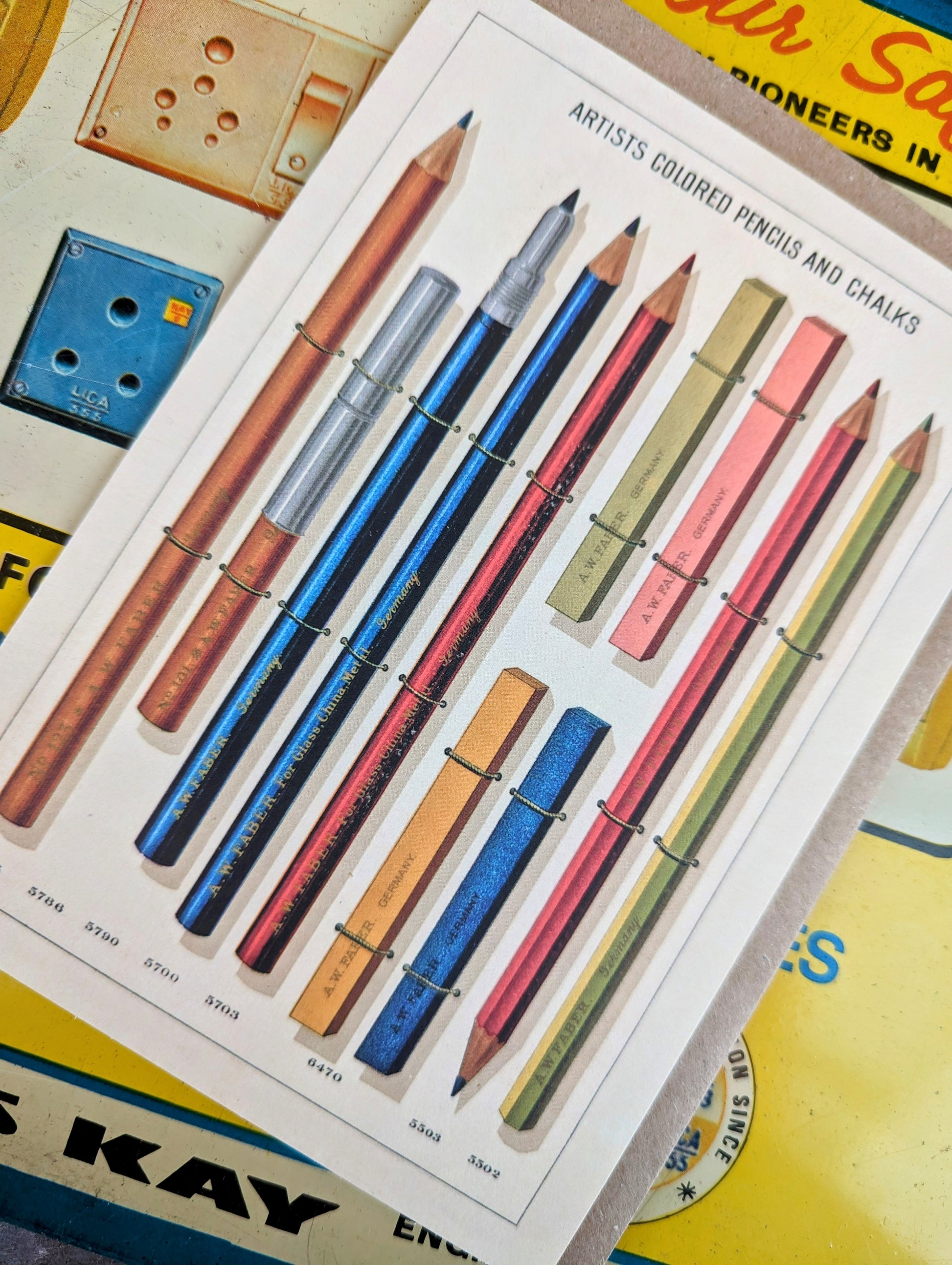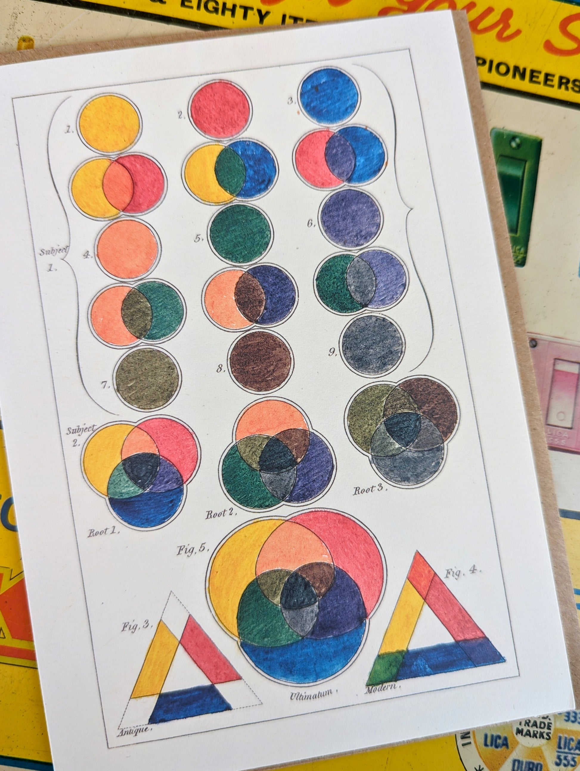 Set of 5 beautifully printed cards featuring Victorian illustrations of artists equipment, colour theory and woodworking joints!