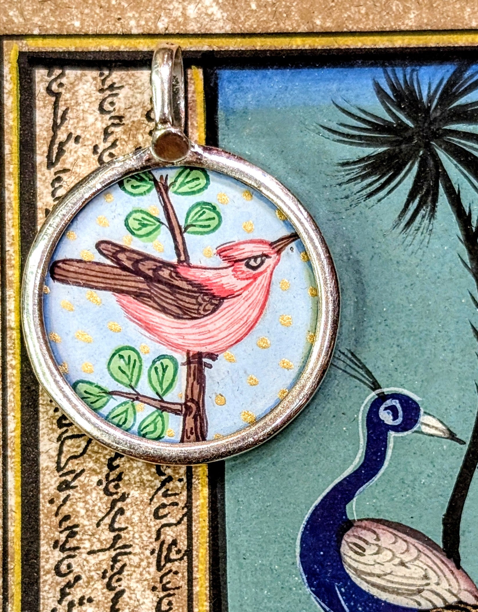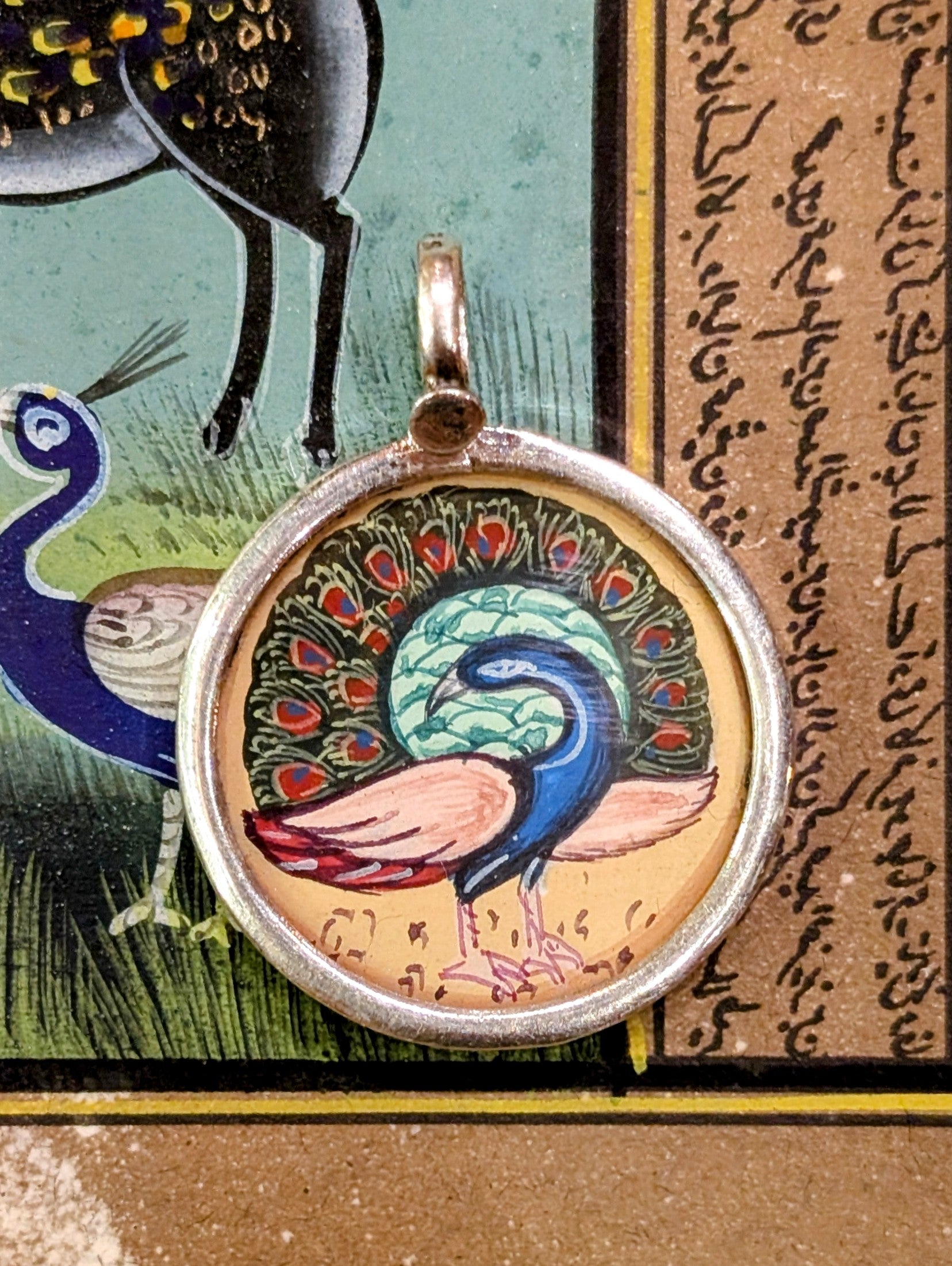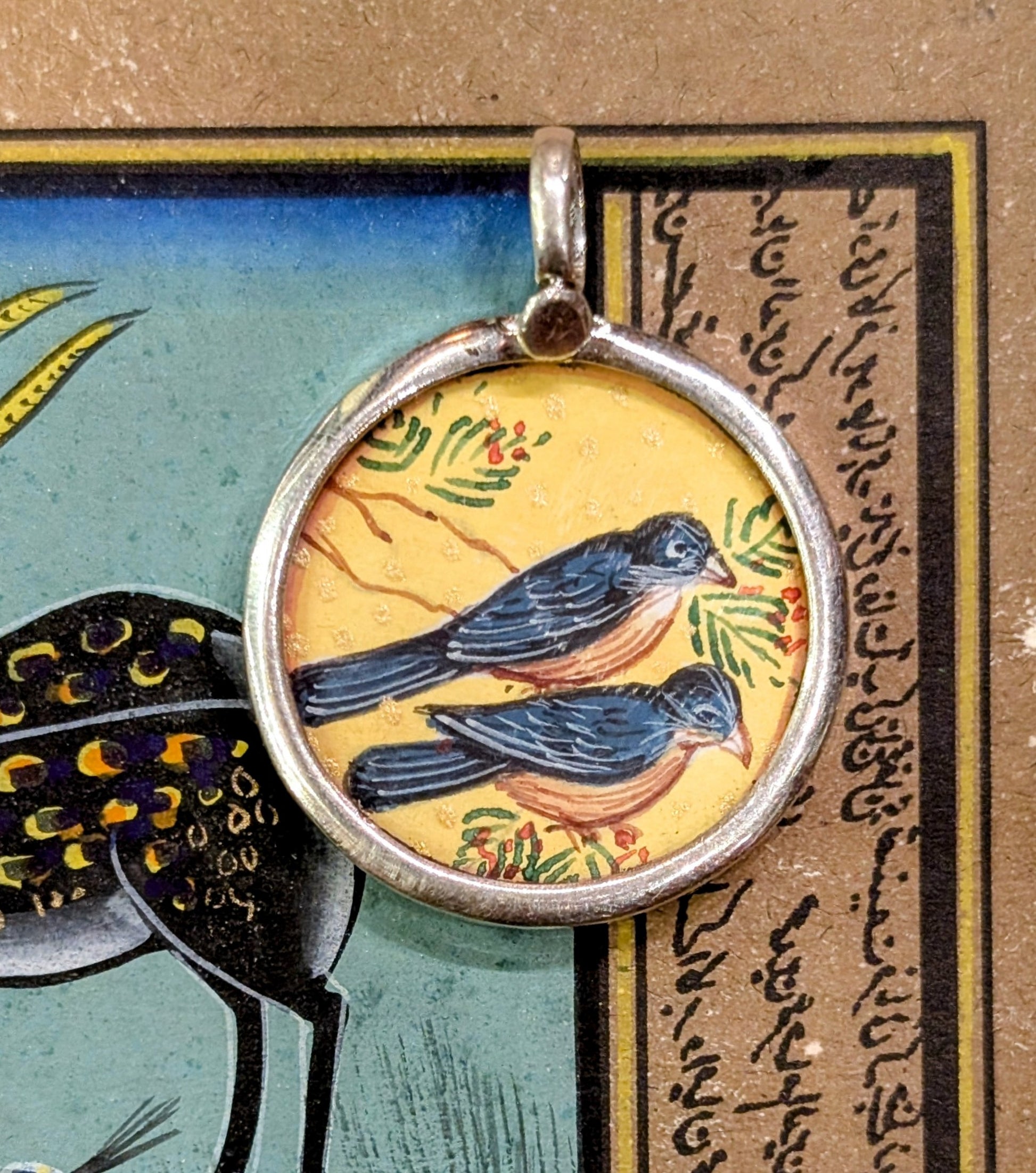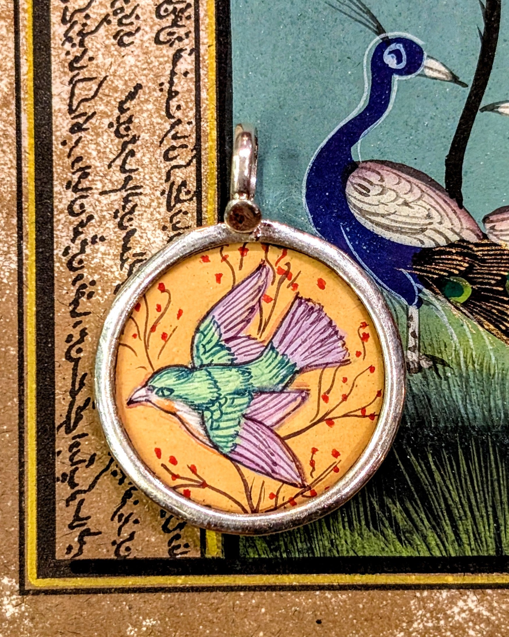Made in Rajasthan, these pendants are crafted from sterling silver, glass and hand painted images on paper. The fine craftsmanship in these paintings is mind blowing, painting with single paint brush bristles!!!