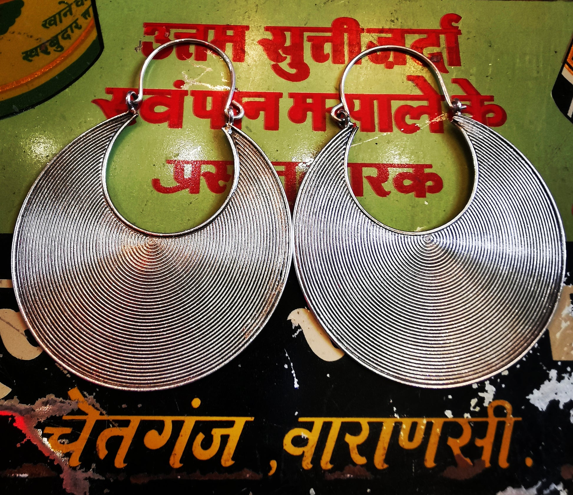 Handmade Burmese Karen spiral hoop earrings, cast design with a traditional Karen tribe fitting.