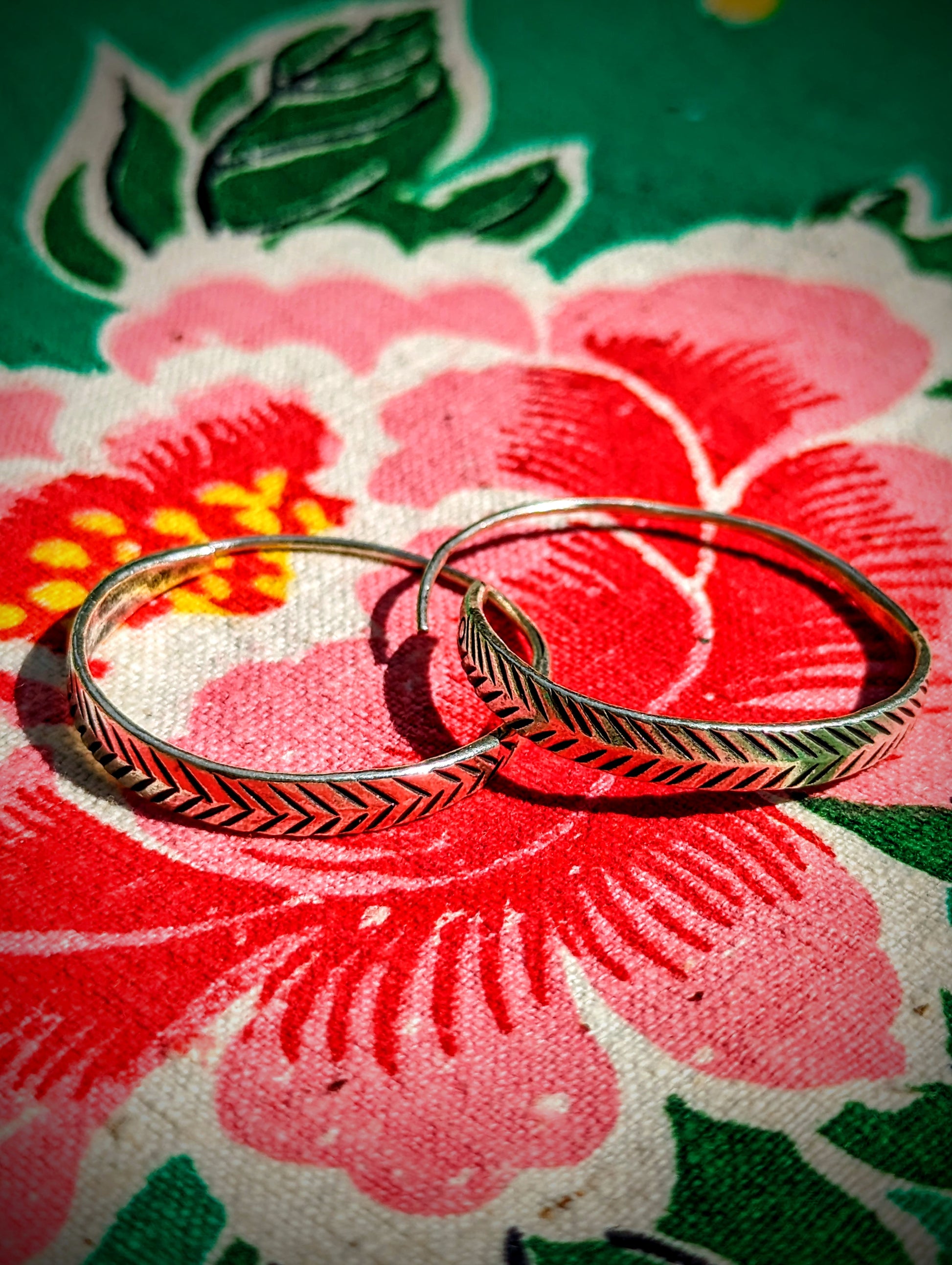 Handmade Burmese Karen chevron stamped hoop earrings, design with a traditional Karen tribe simplicity.