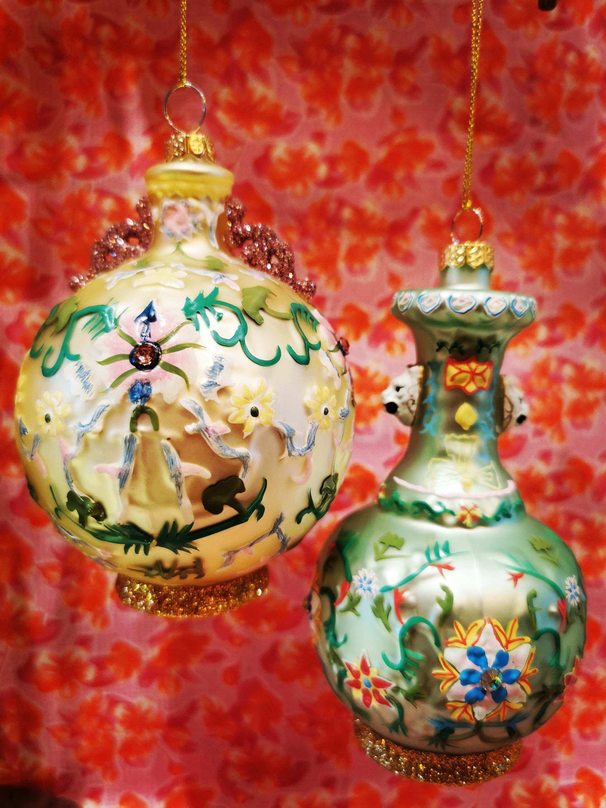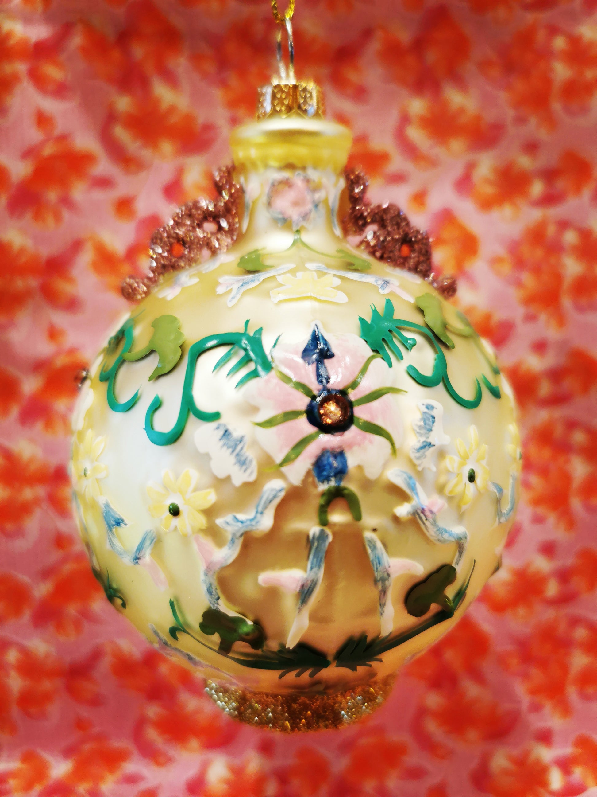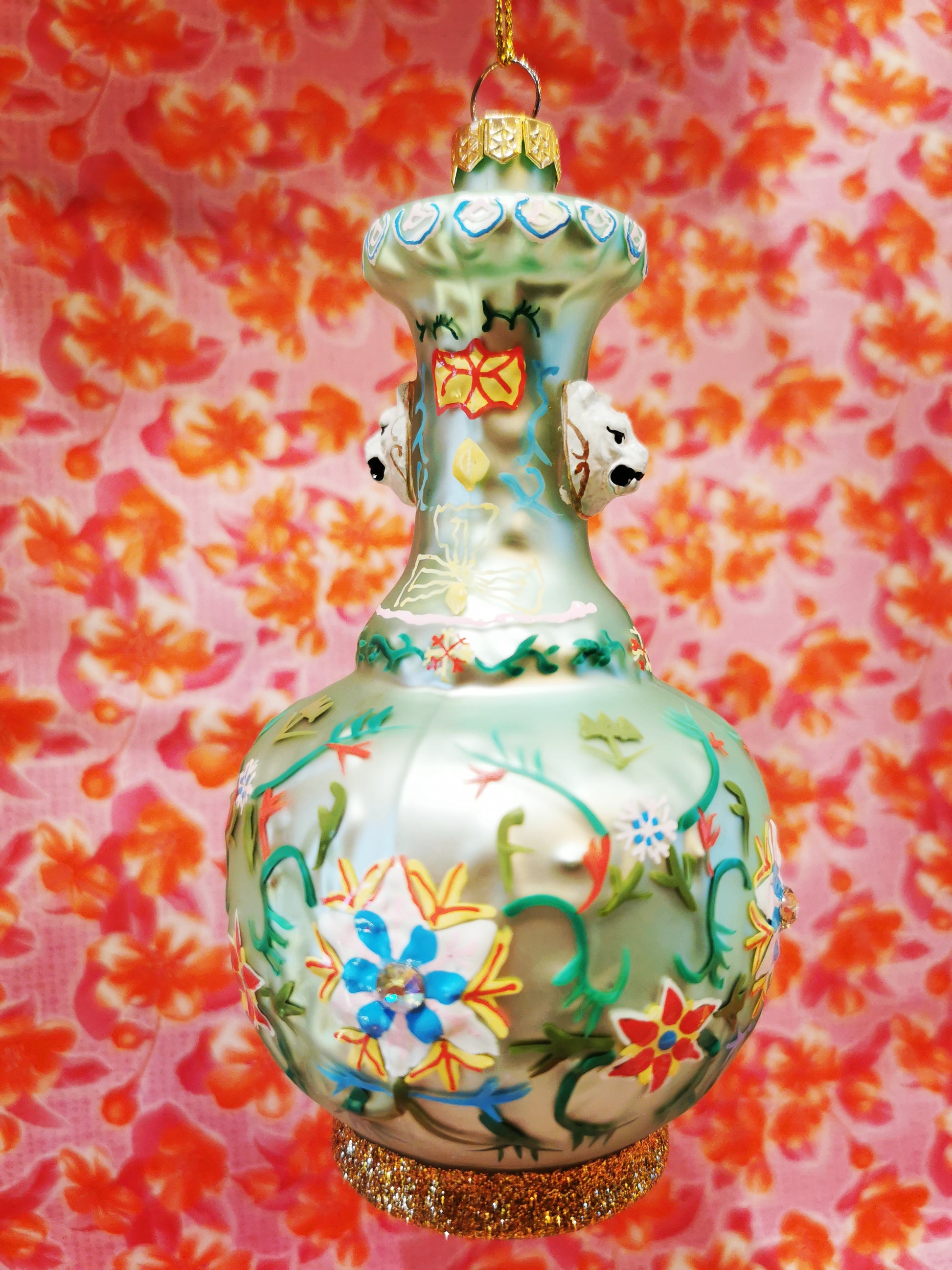 Exquisite hand painted and glittered glass bauble in the shape of a super pretty pastel yellow Chinese vase.