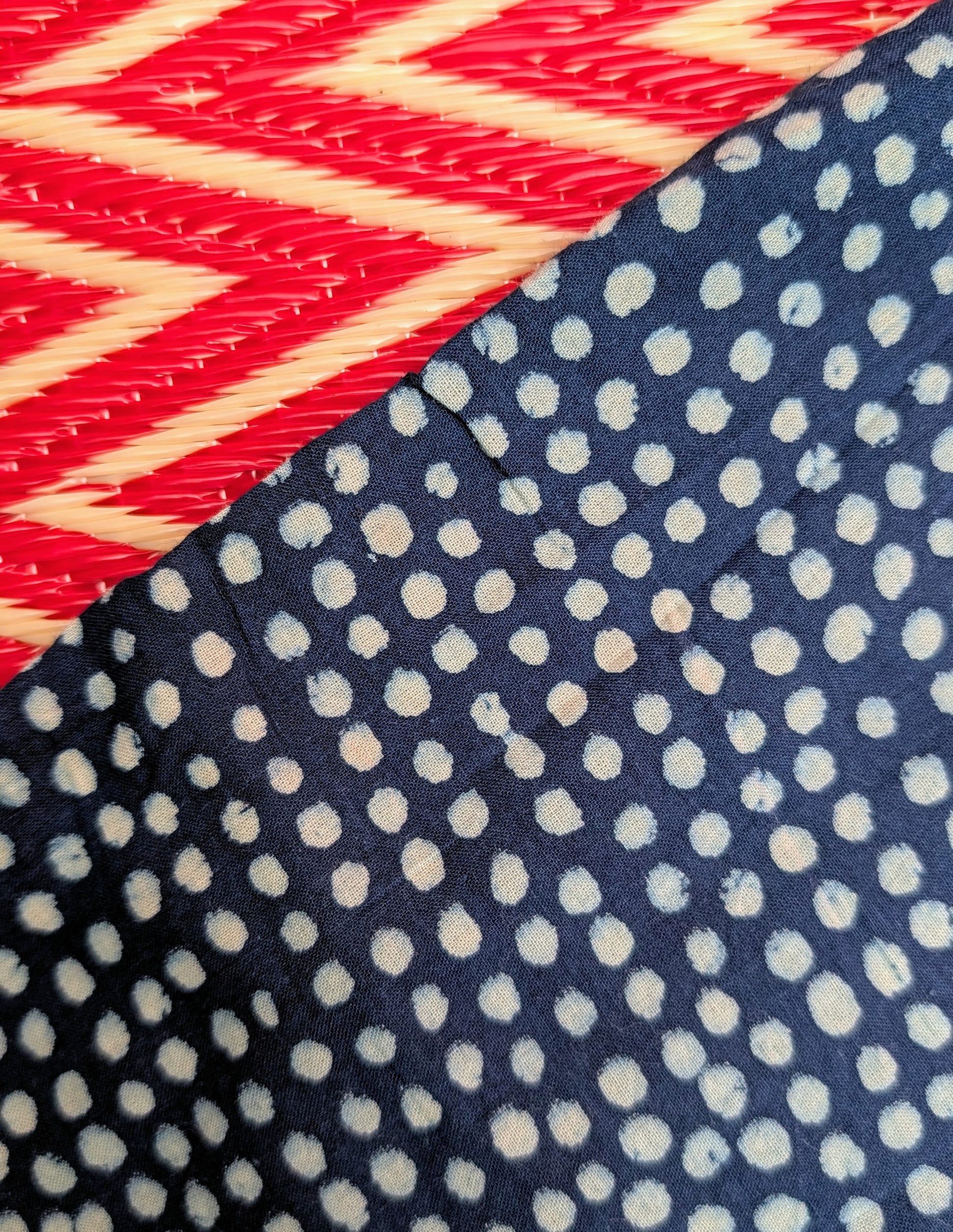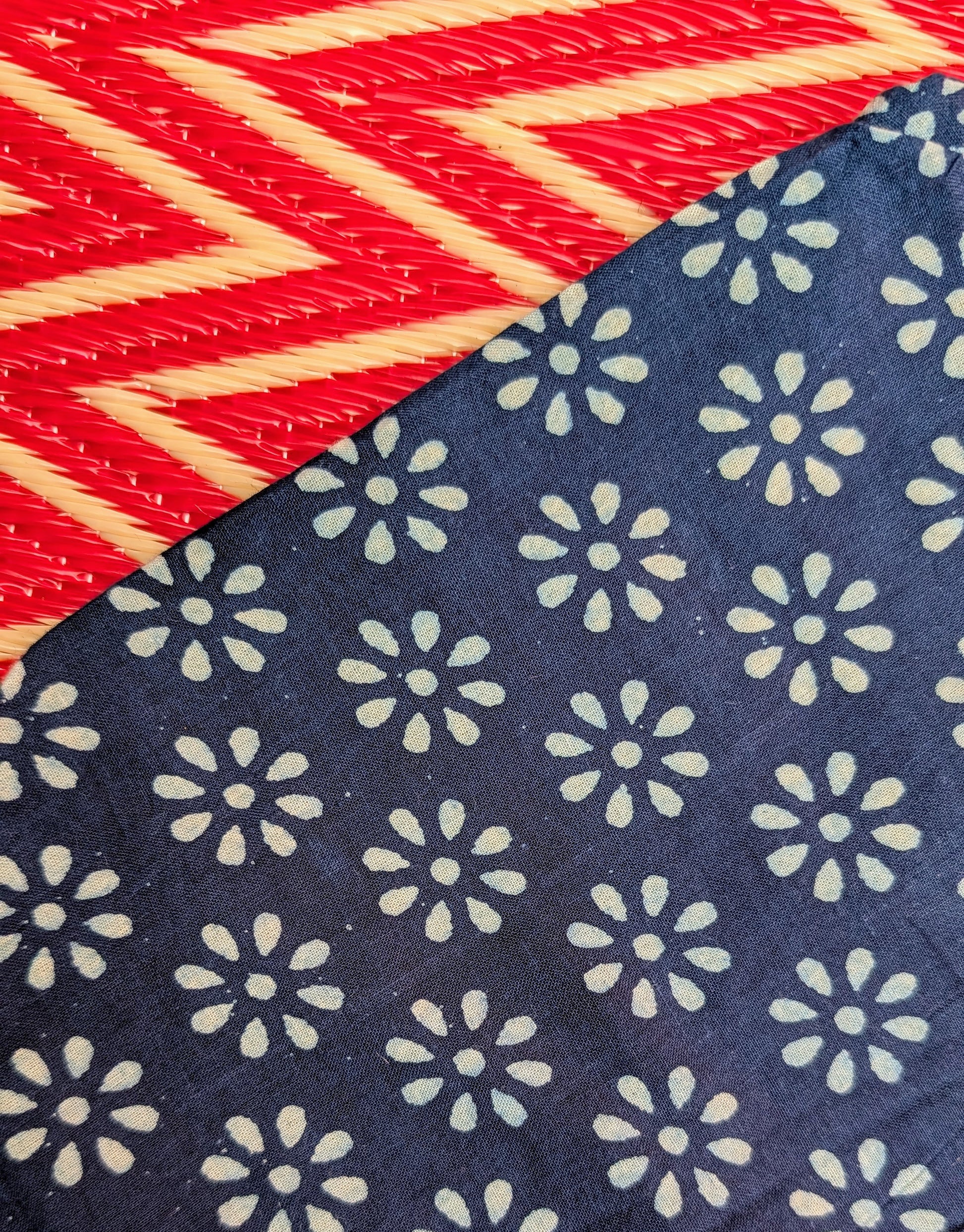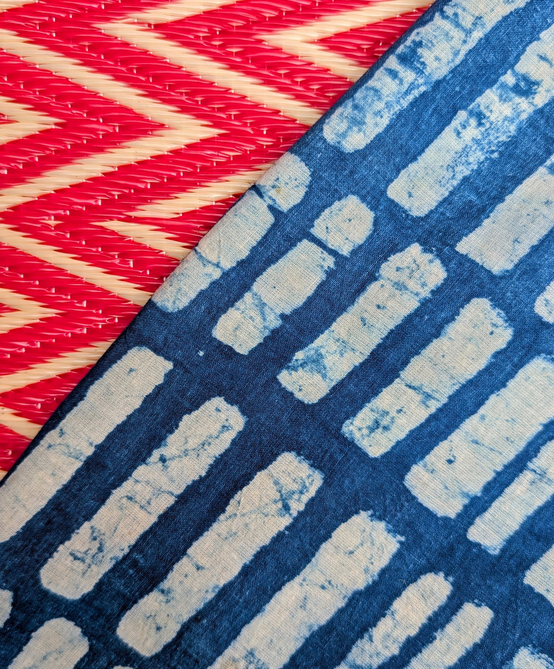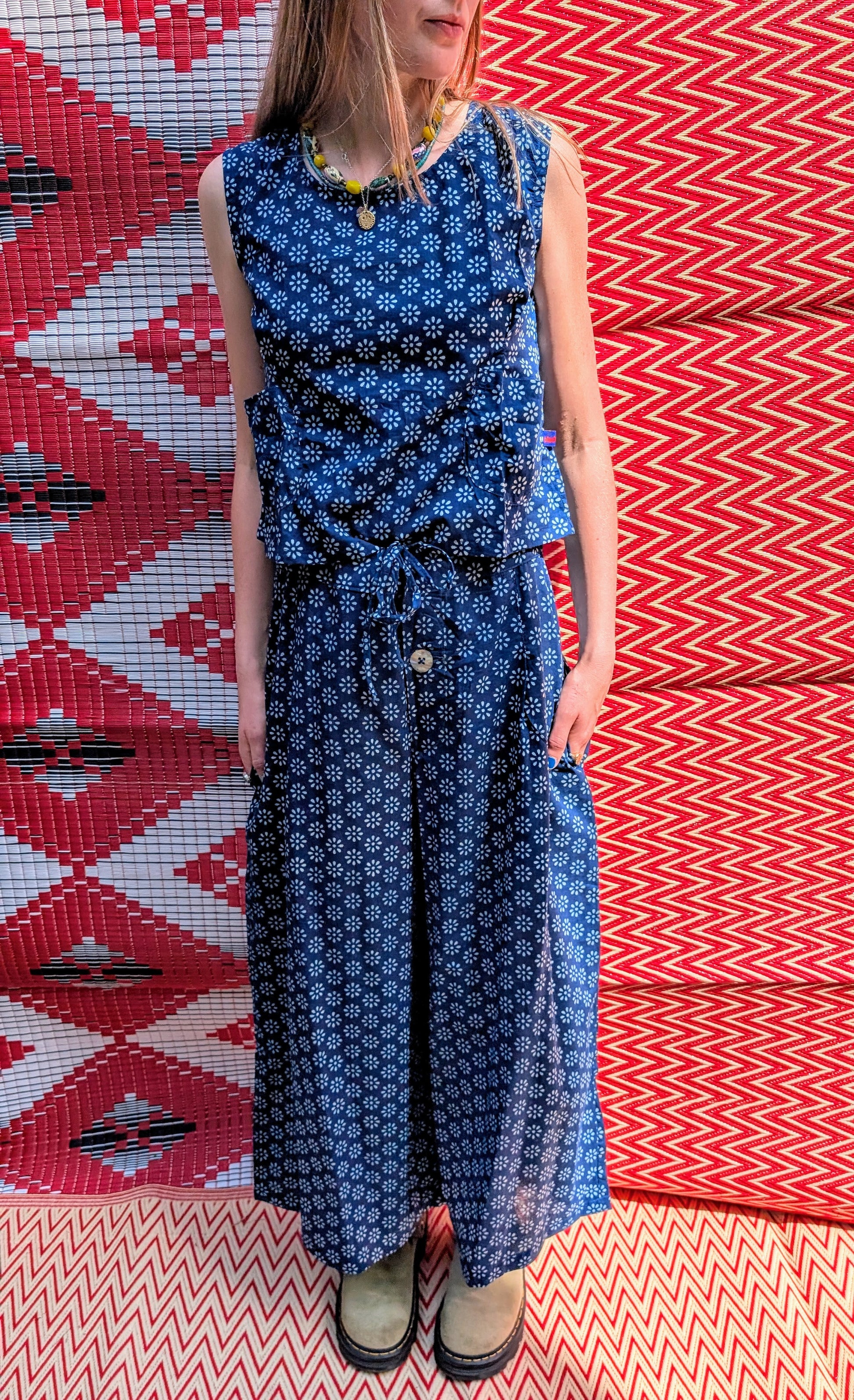 Gorgeous soft fine cotton , hand resist-dyed in natural indigo using block prints, the fabric is handmade in India, then it is taken and.made in Thailand working with the same family of seamstresses for 25 years. Patterns and sampling made here in the UK by our founder Anna Moody.
