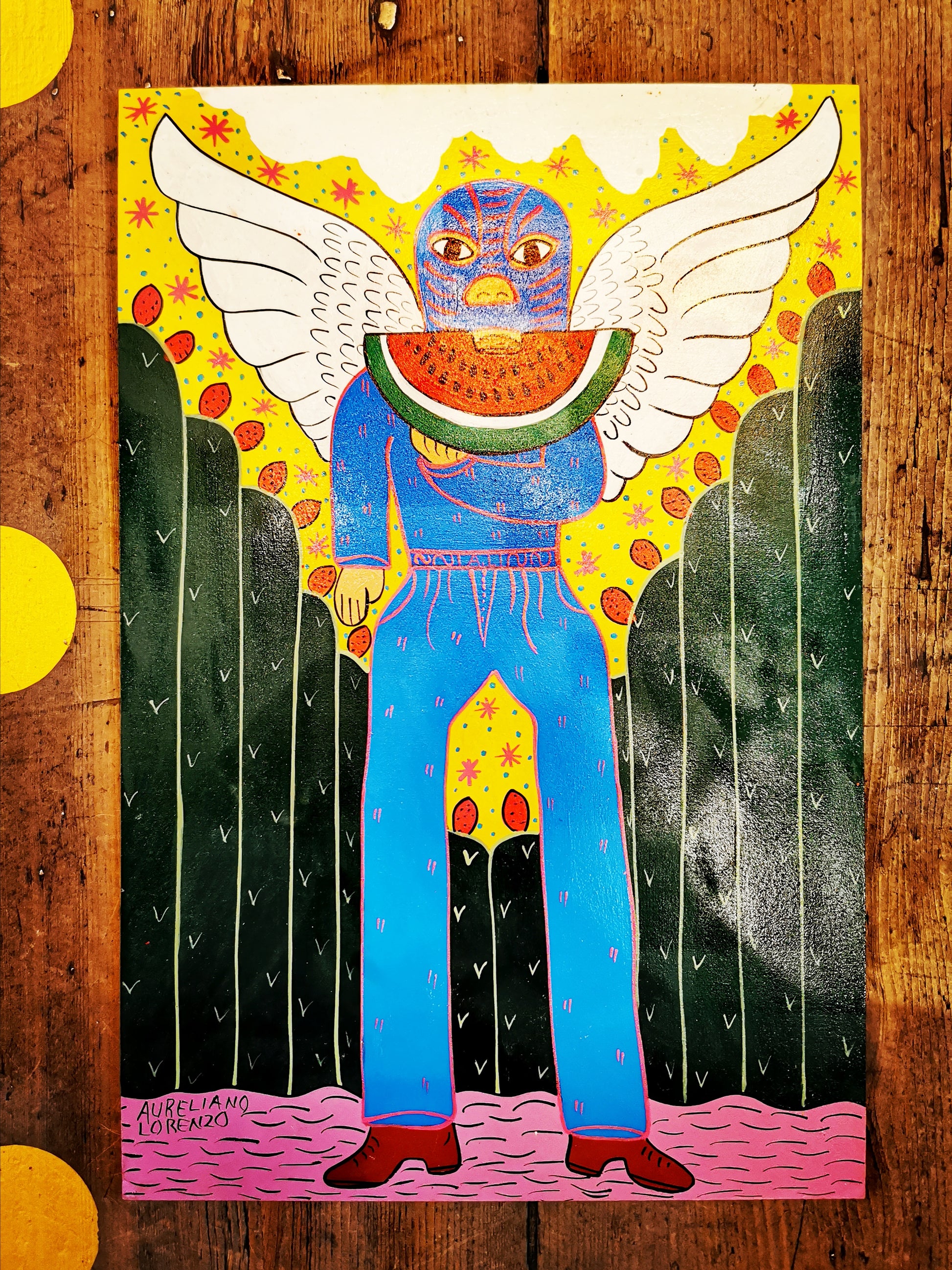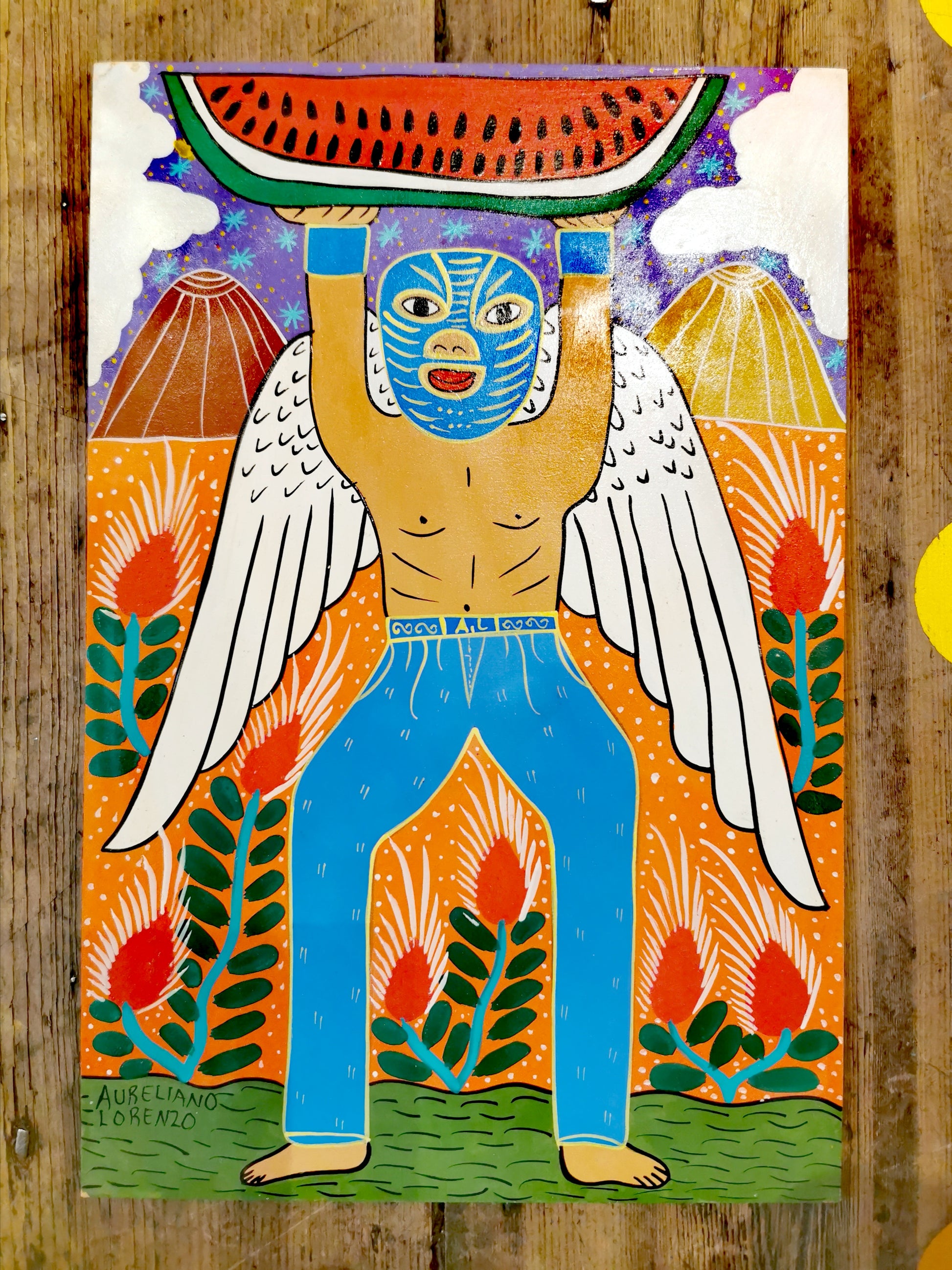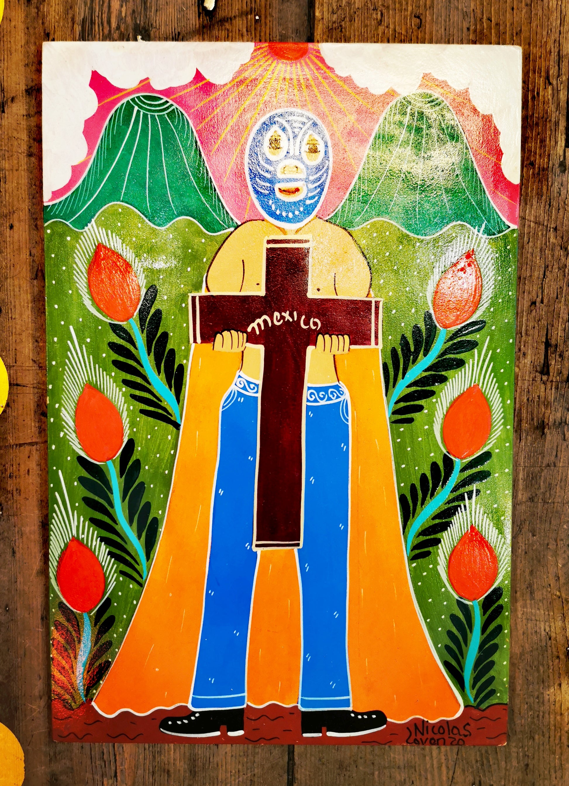 Folk art created by the Lorenzo Family in Mexico. Four generations of the family paint, hence why they are signed with different names! We buy them from the Grandson, Fernando Lorenzo. These are original paintings inspired by the tradition of retablo painting, which tell a multitude of stories. In the Luchador series, the family take inspiration from the wrestling traditions of Mexican culture, dating back to 1863. The Luche libre is a national sport and weekly event for many Mexicans. Its popularity is now international and is very much a part of pop culture. The de-masking is part of the mystery and magic surrounding the luchadors, they fight to keep there identity hidden, should they loose in certain contests they will have to fight mask-less in future contests!