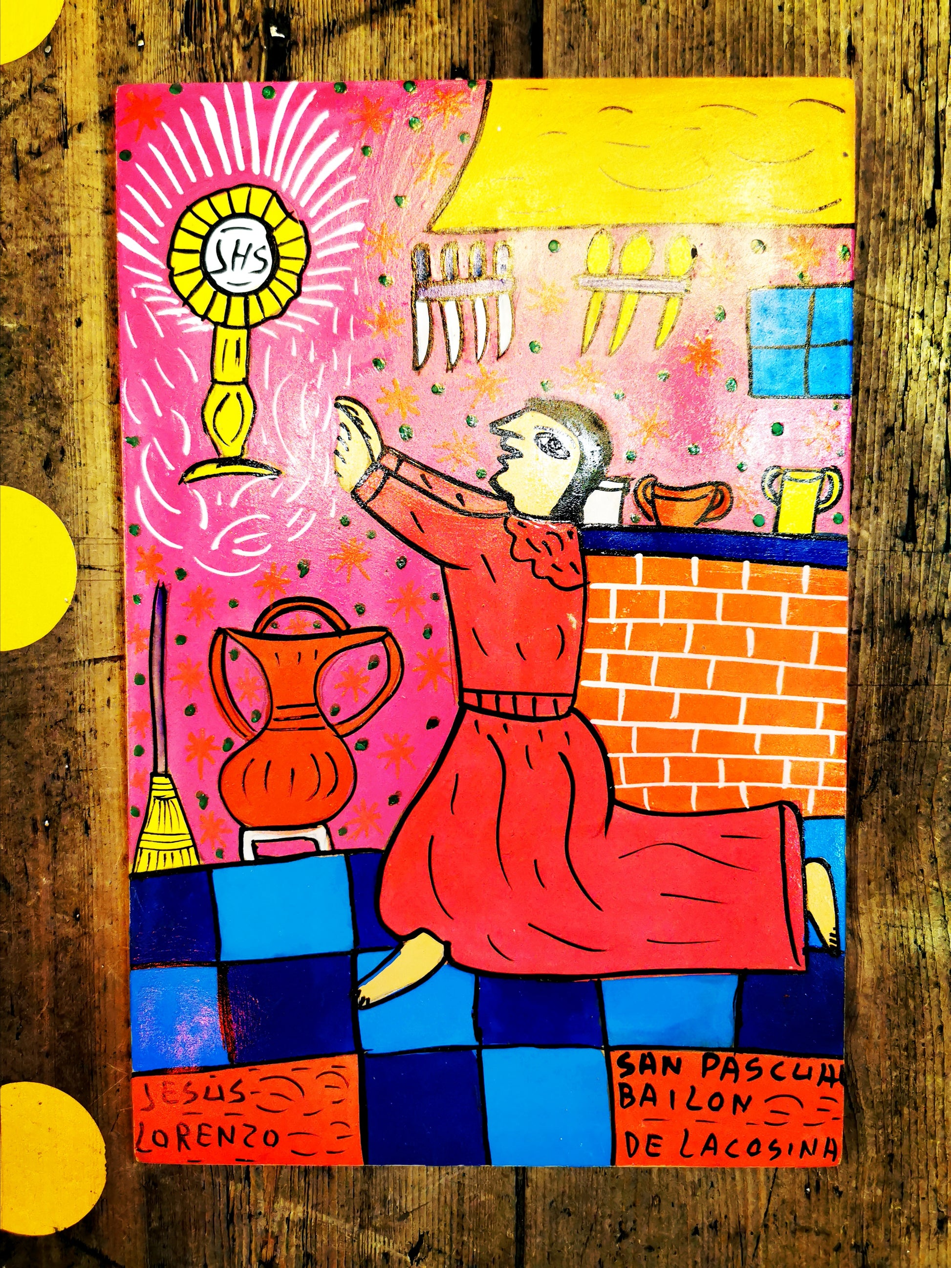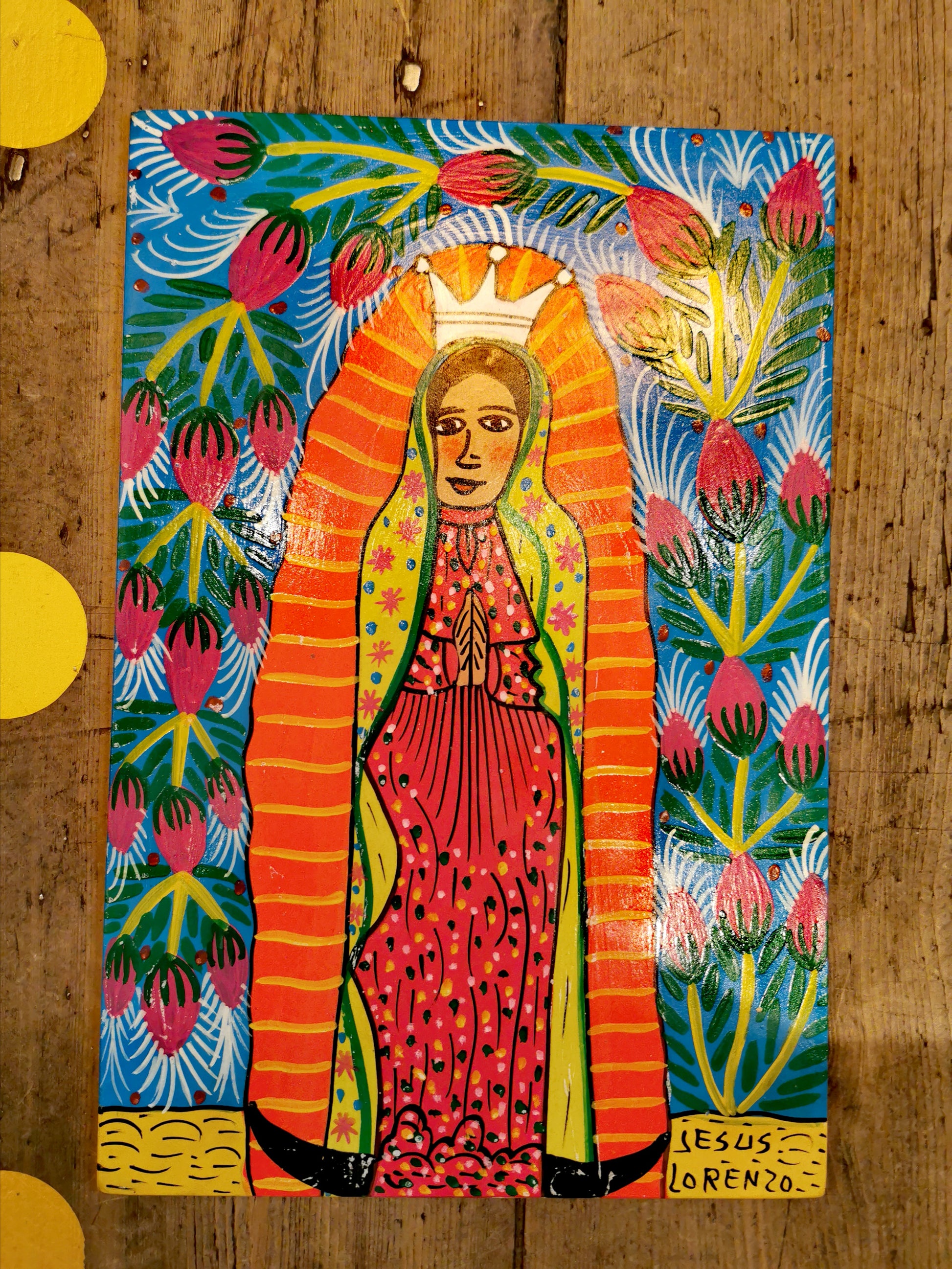 Folk art created by the Lorenzo Family in Mexico. Four generations of the family paint, hence why they are signed with different names! We buy them from the Grandson, Fernando Lorenzo. These are original paintings inspired by the tradition of retablo painting, which tell a multitude of stories. In the religious series, the family take inspiration from the Catholic traditions of Mexican culture. Catholicism is a key component of everyday life and features heavily throughout mexico, every corner you turn there are images and shrines to various saints, particularly, our lady of Guadalupe.