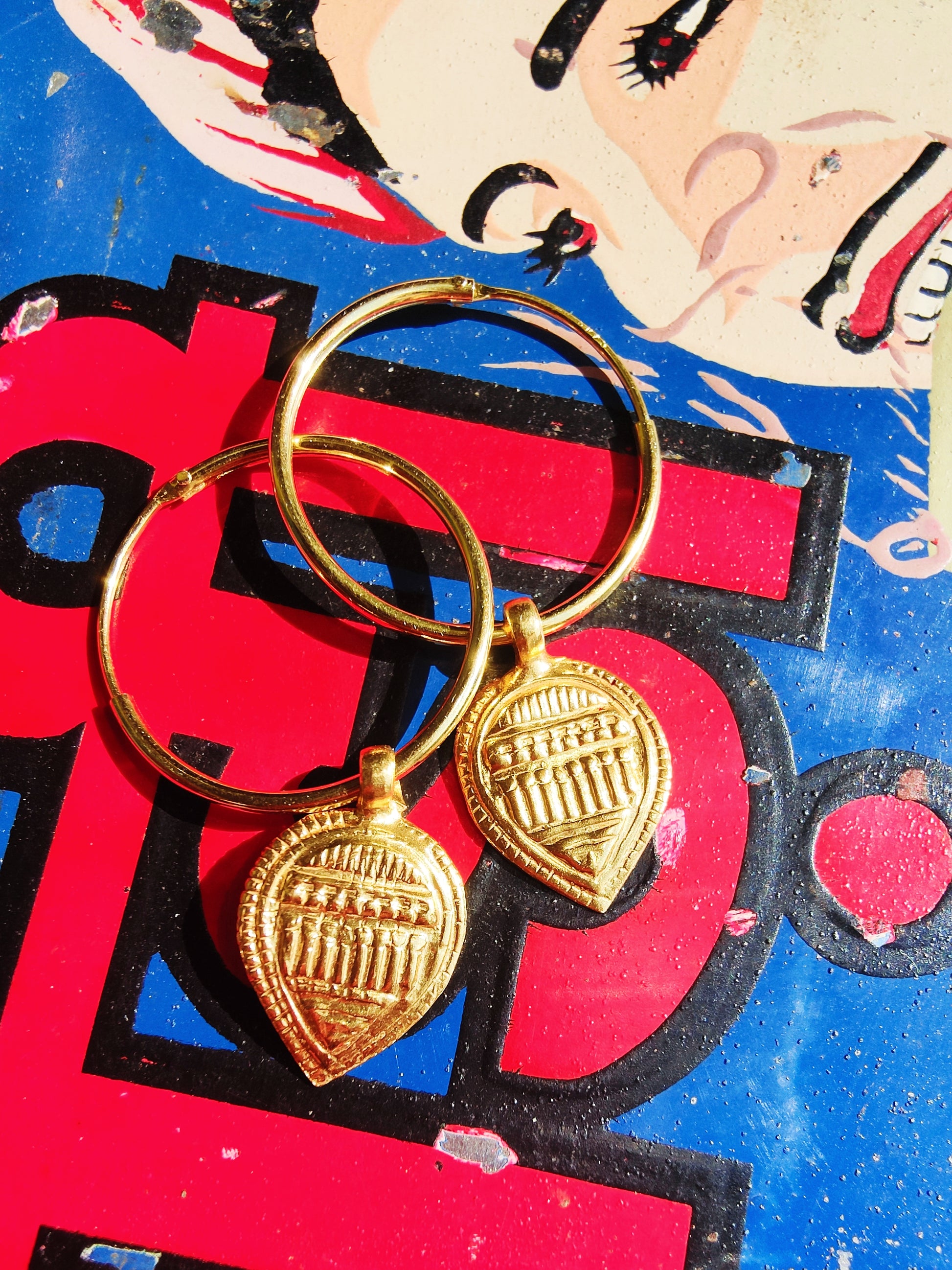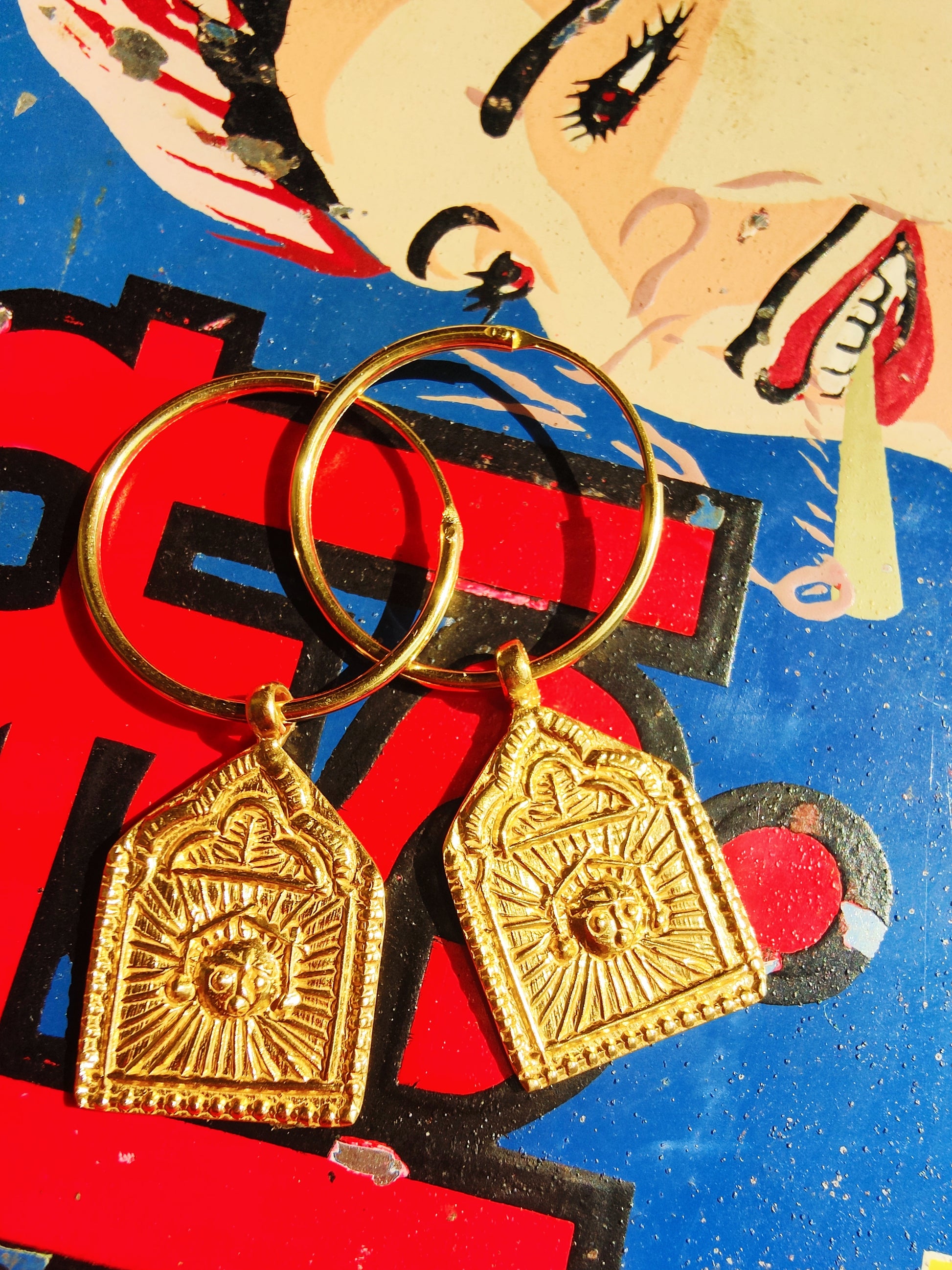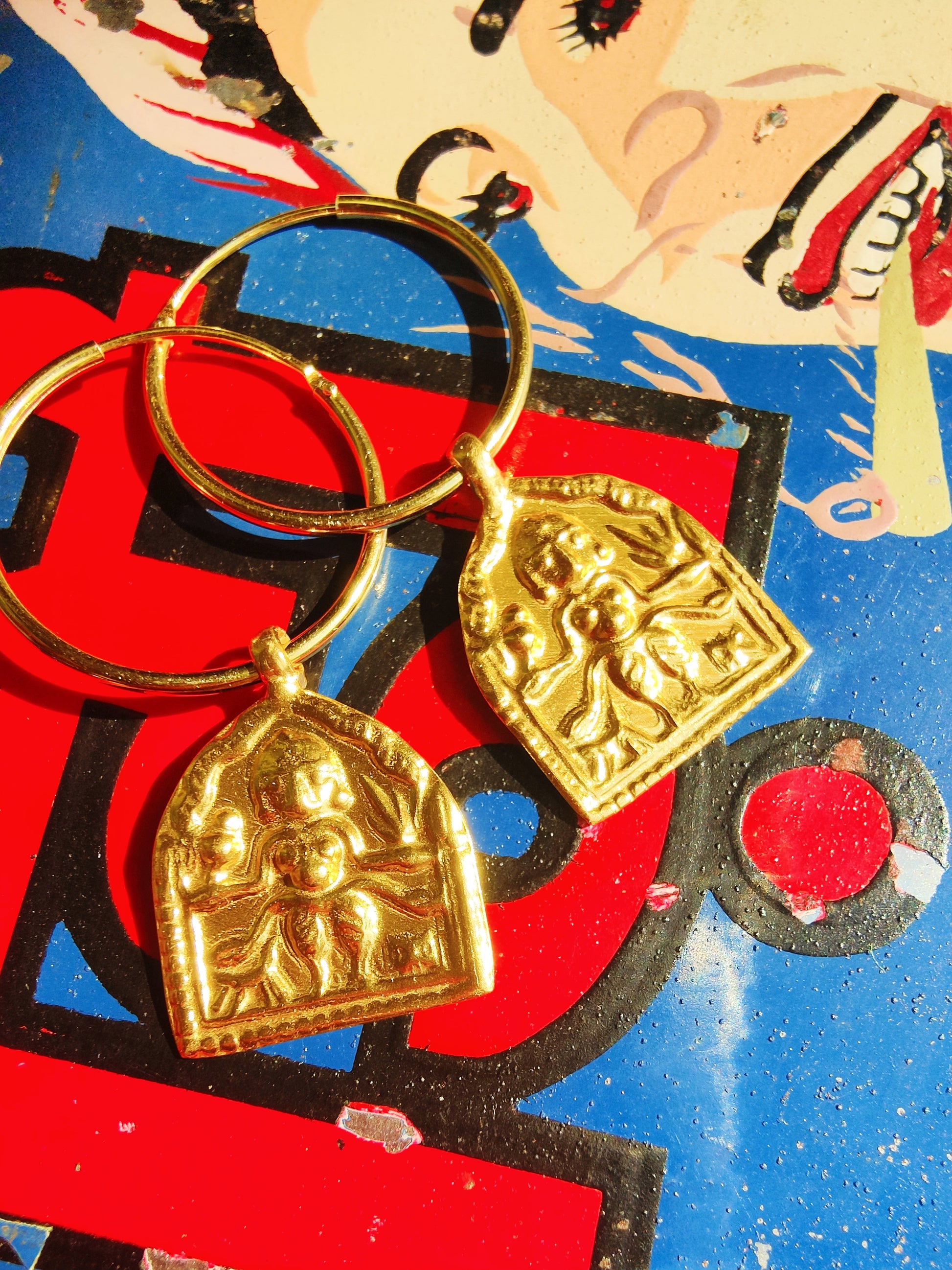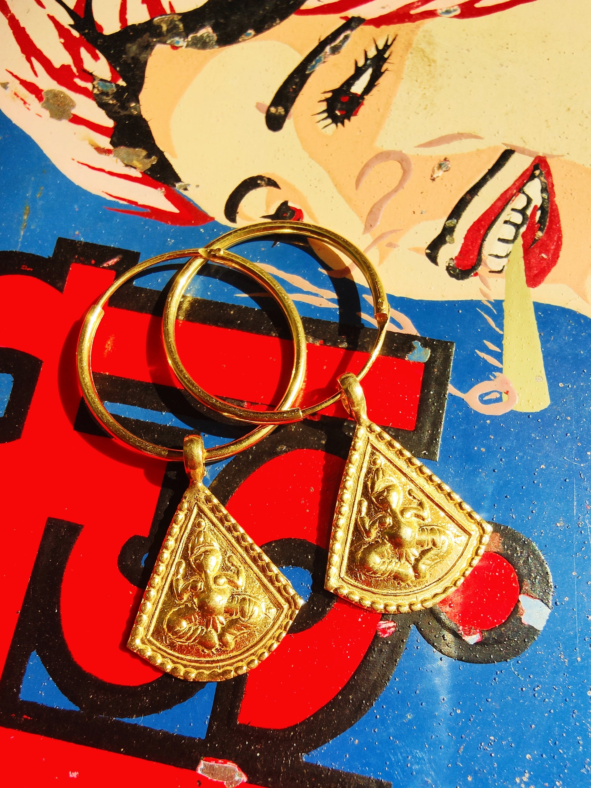 Rajasthani Hindu gods amulet hoop earrings,handmade in rich,buttery goldest,gold plated silver