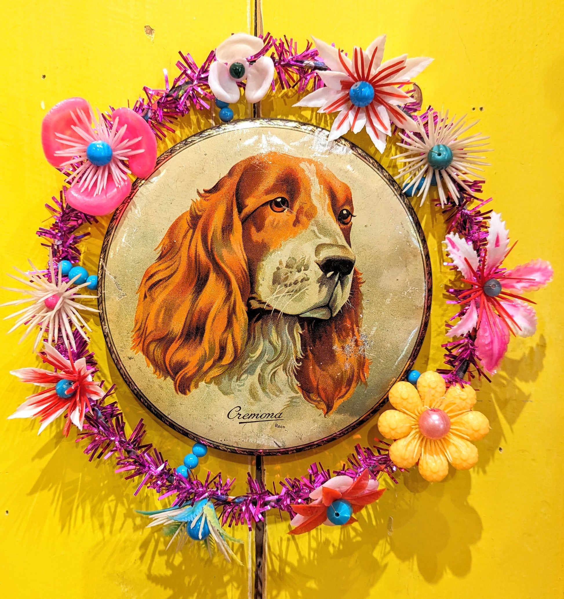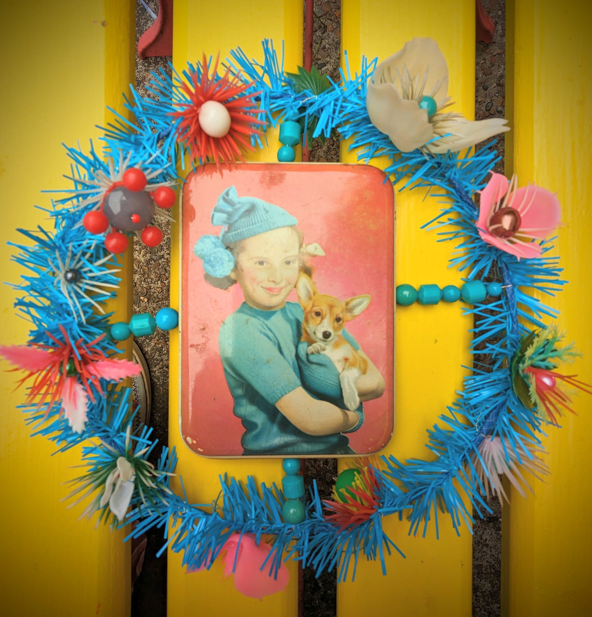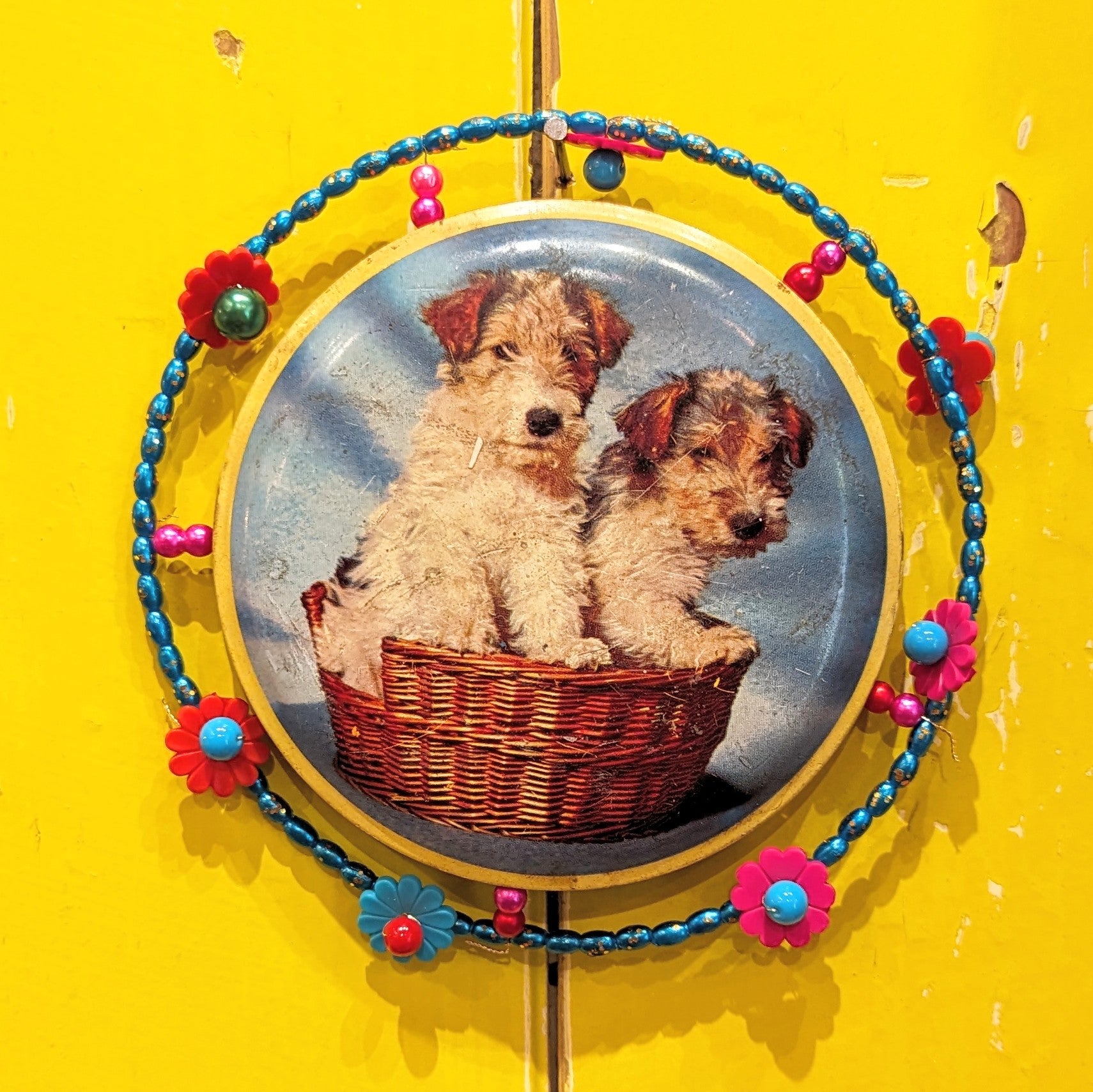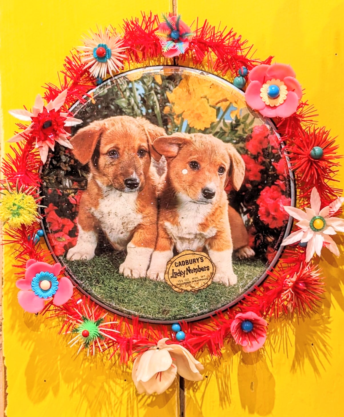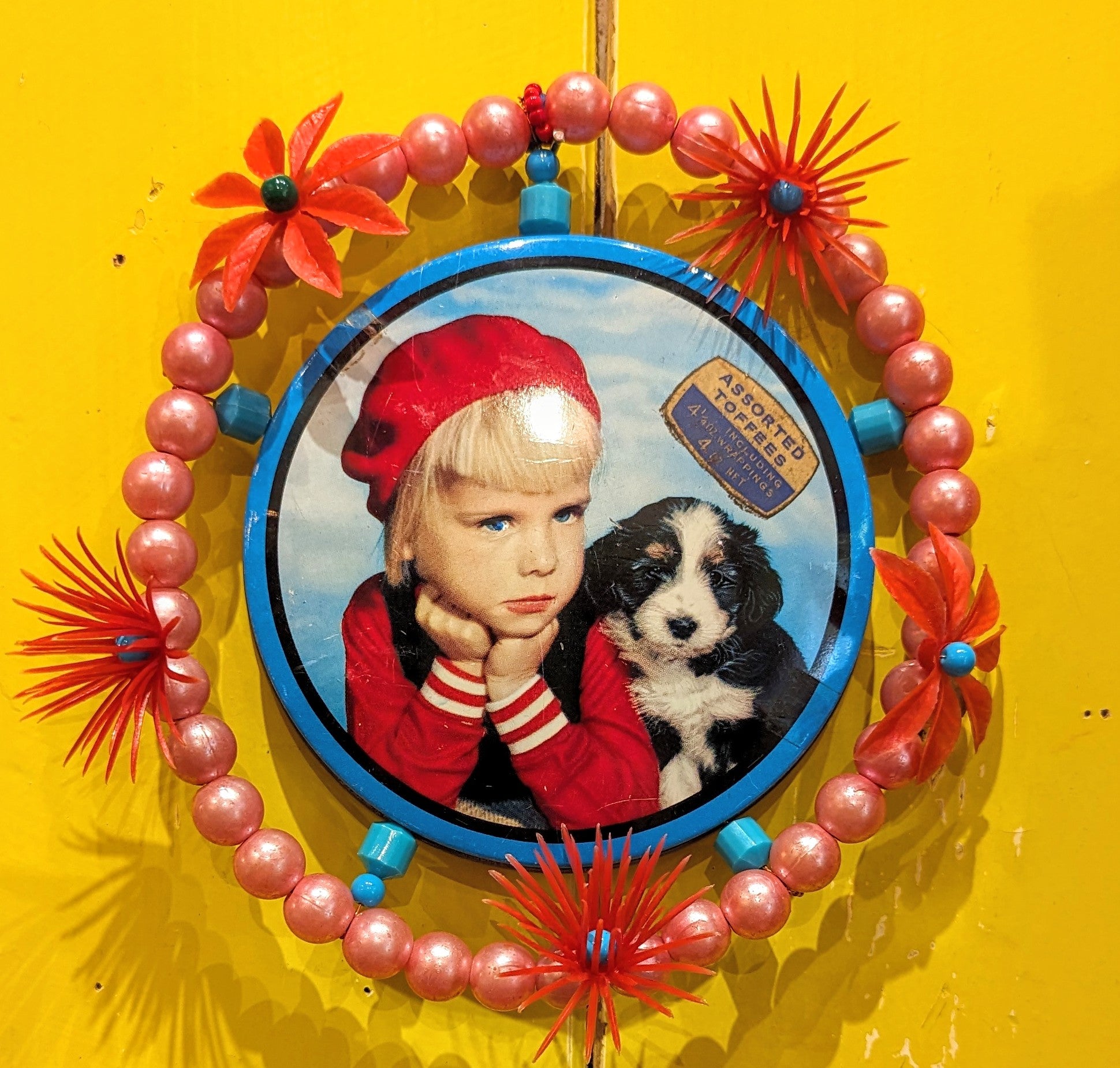 Lovingly festooned vintage kitsch toffee tin lid and vintage flower decorations by local artist and Blackout Shop girl extraordinary Jane Frances Deans.