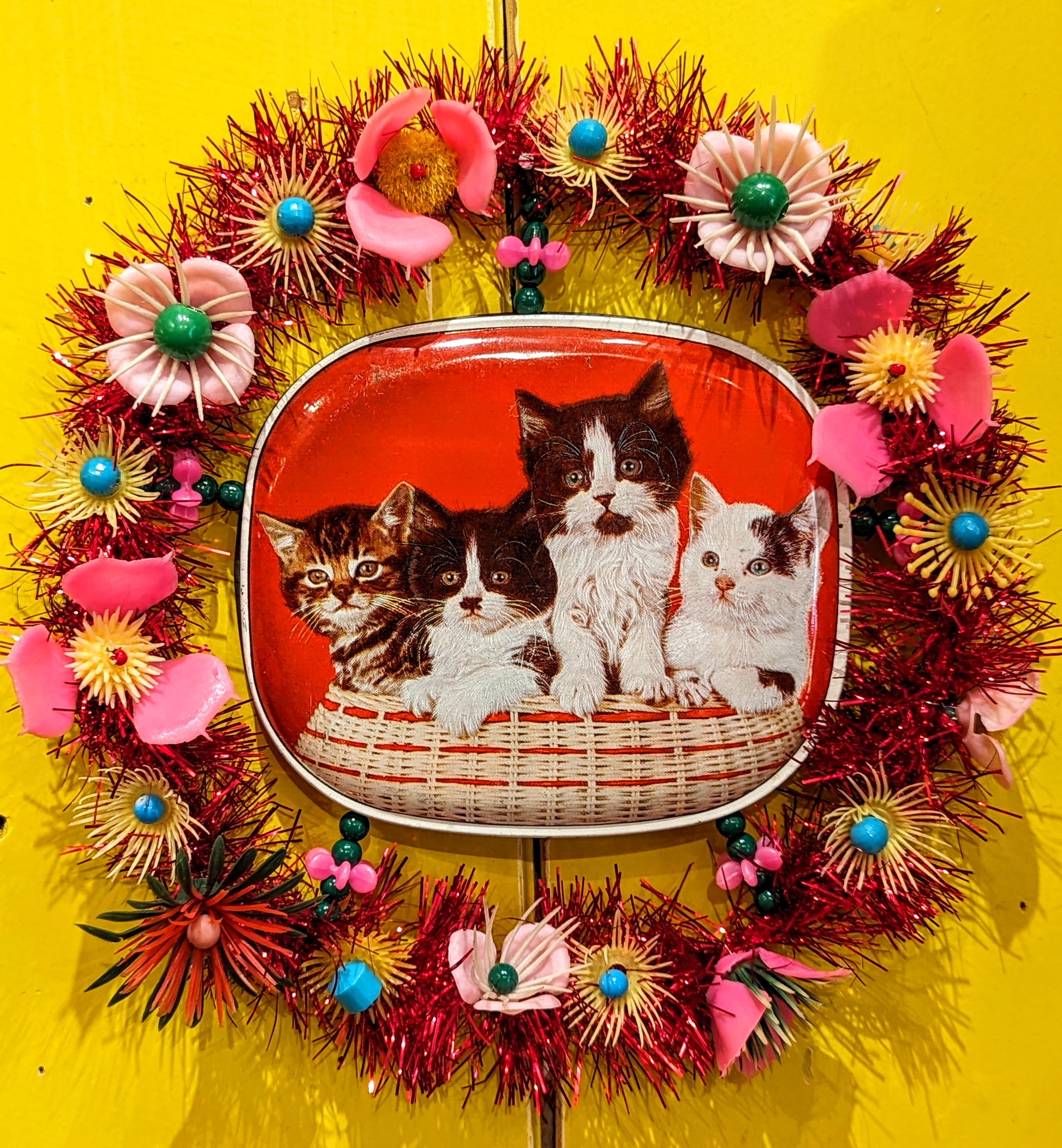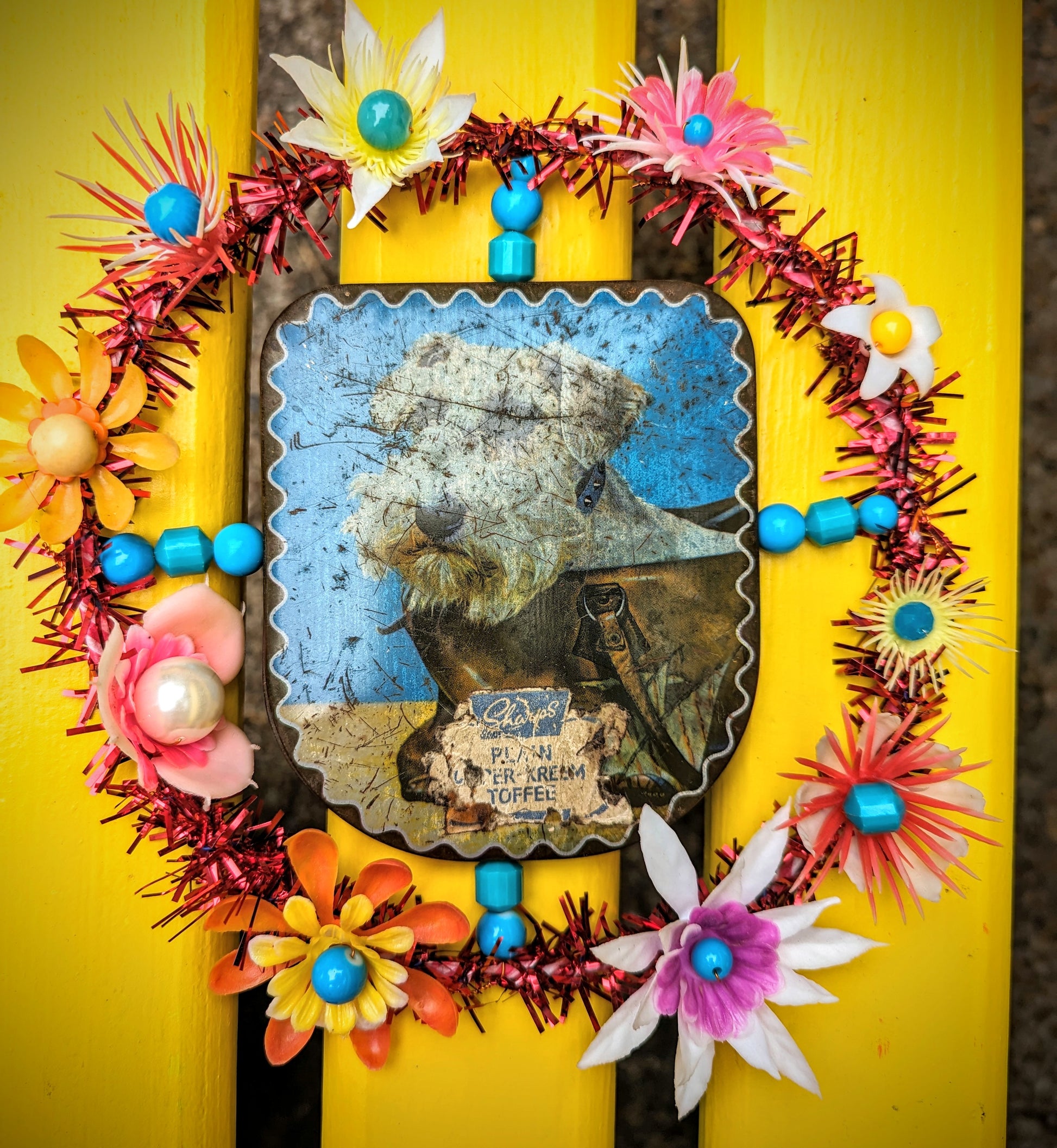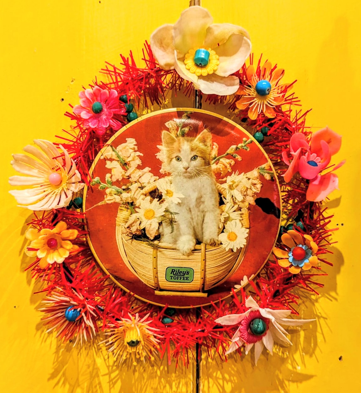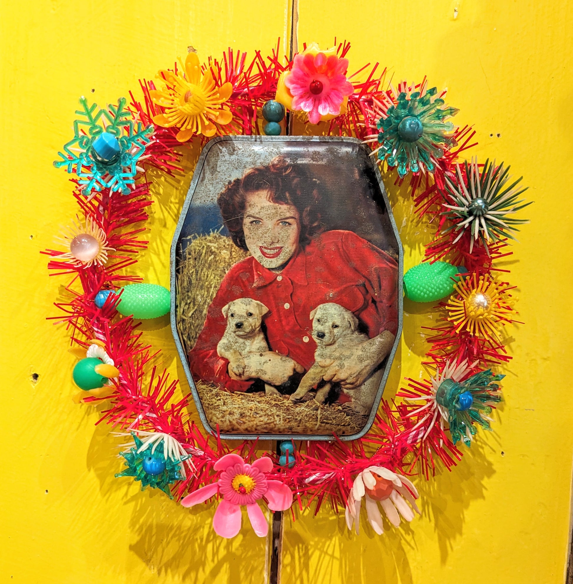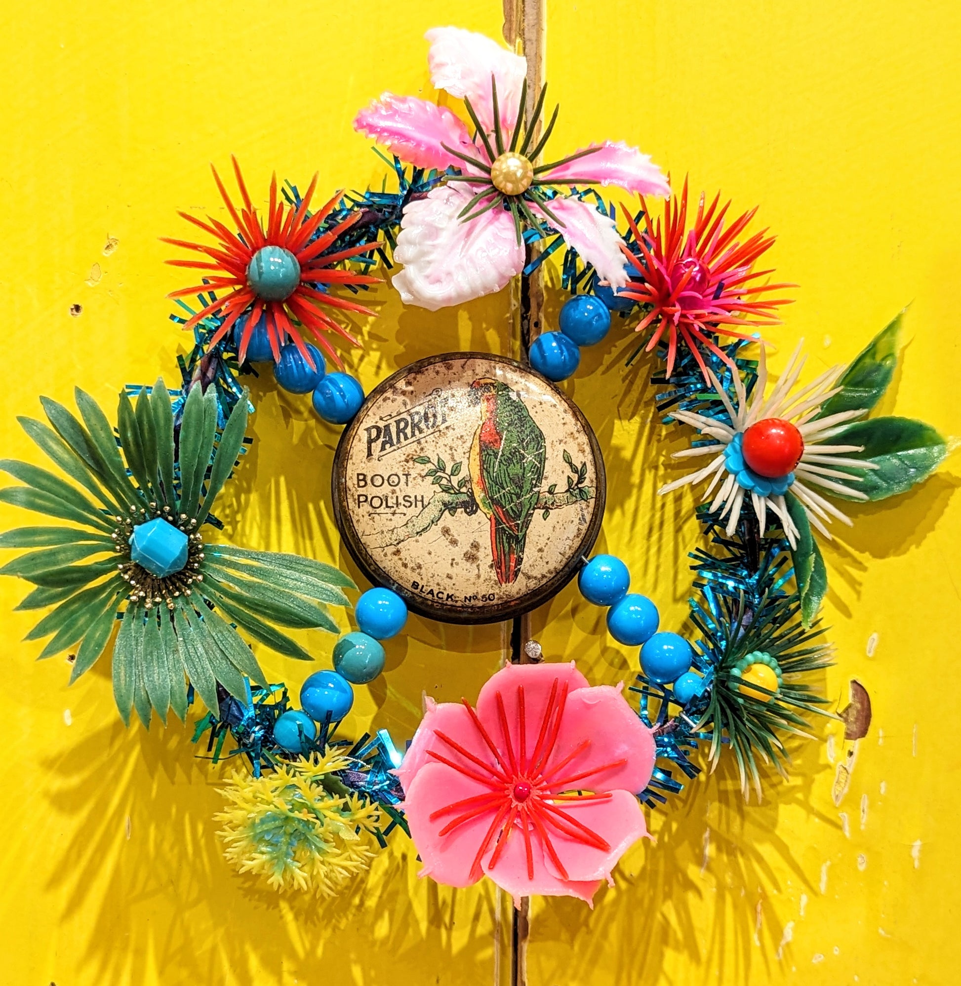 Lovingly festooned vintage kitsch toffee tin lid and vintage flower decorations by local artist and Blackout Shop girl extraordinary Jane Frances Deans.