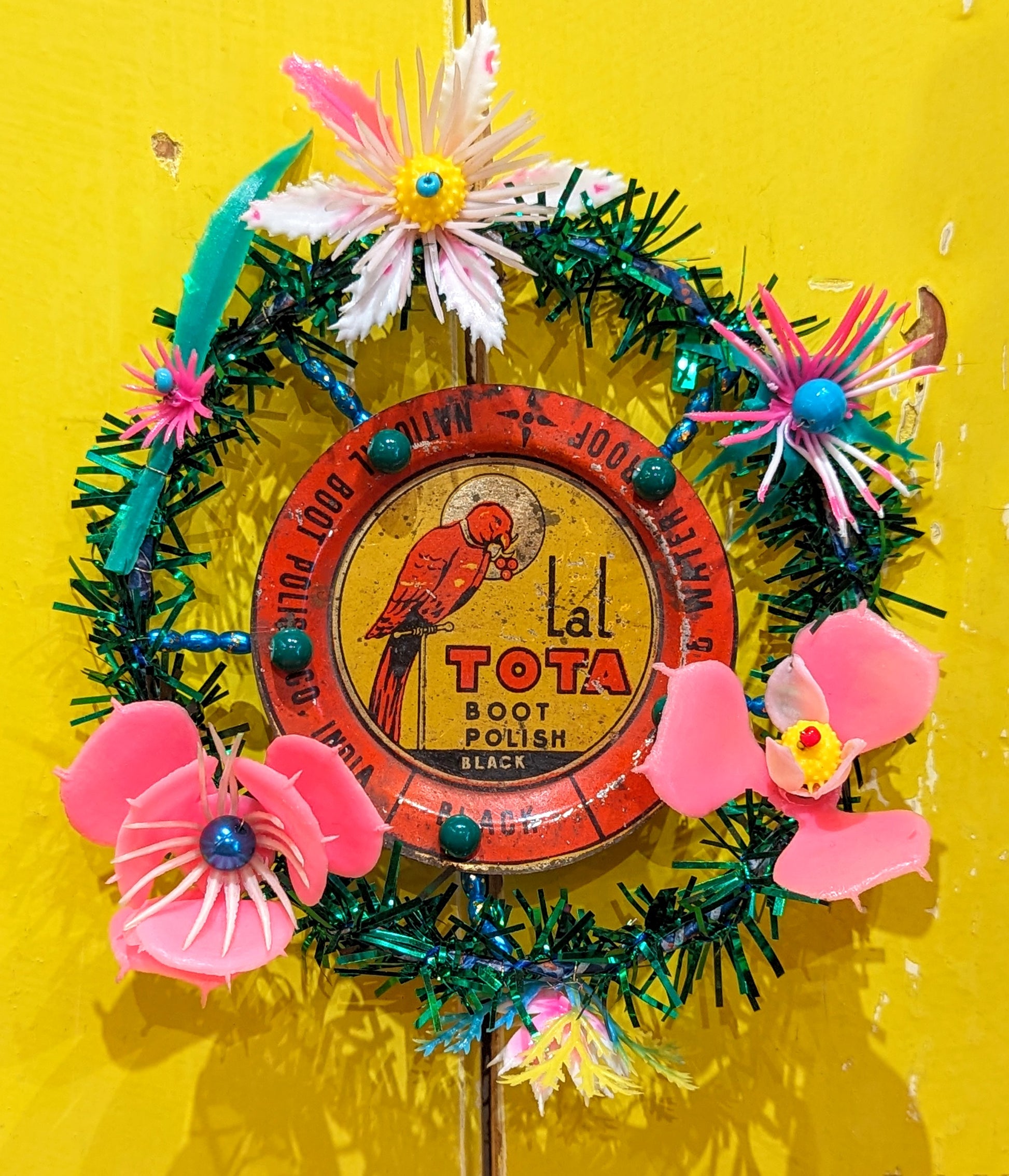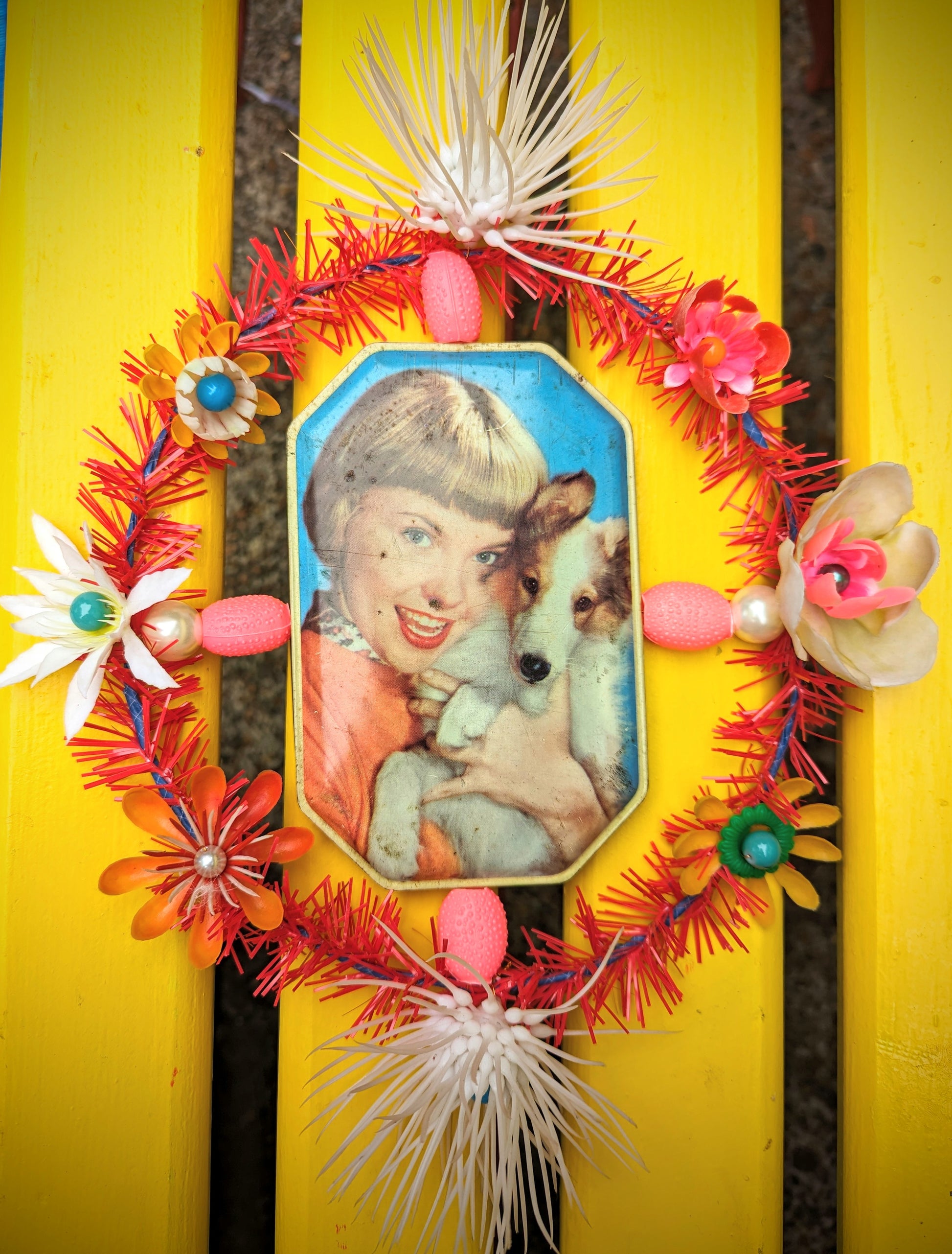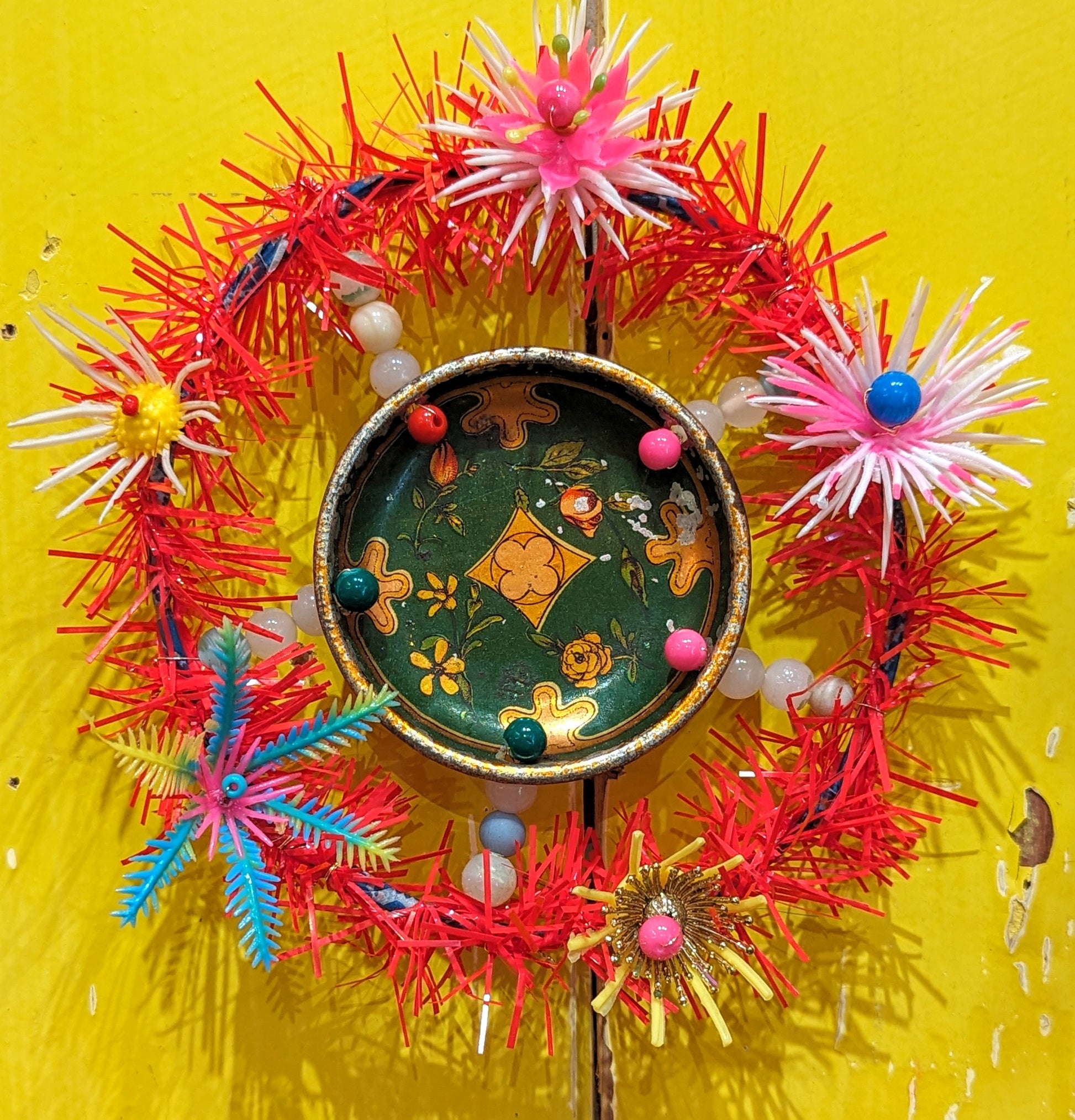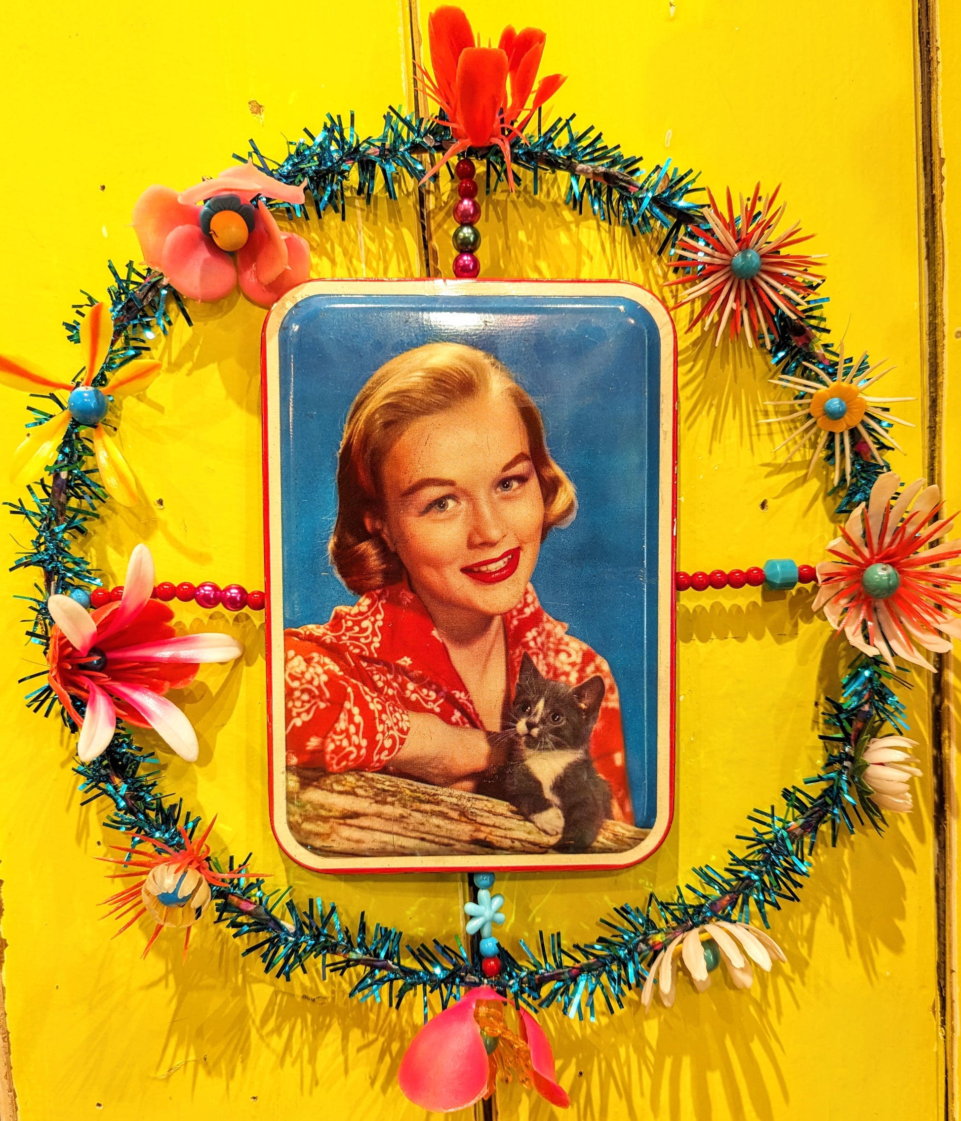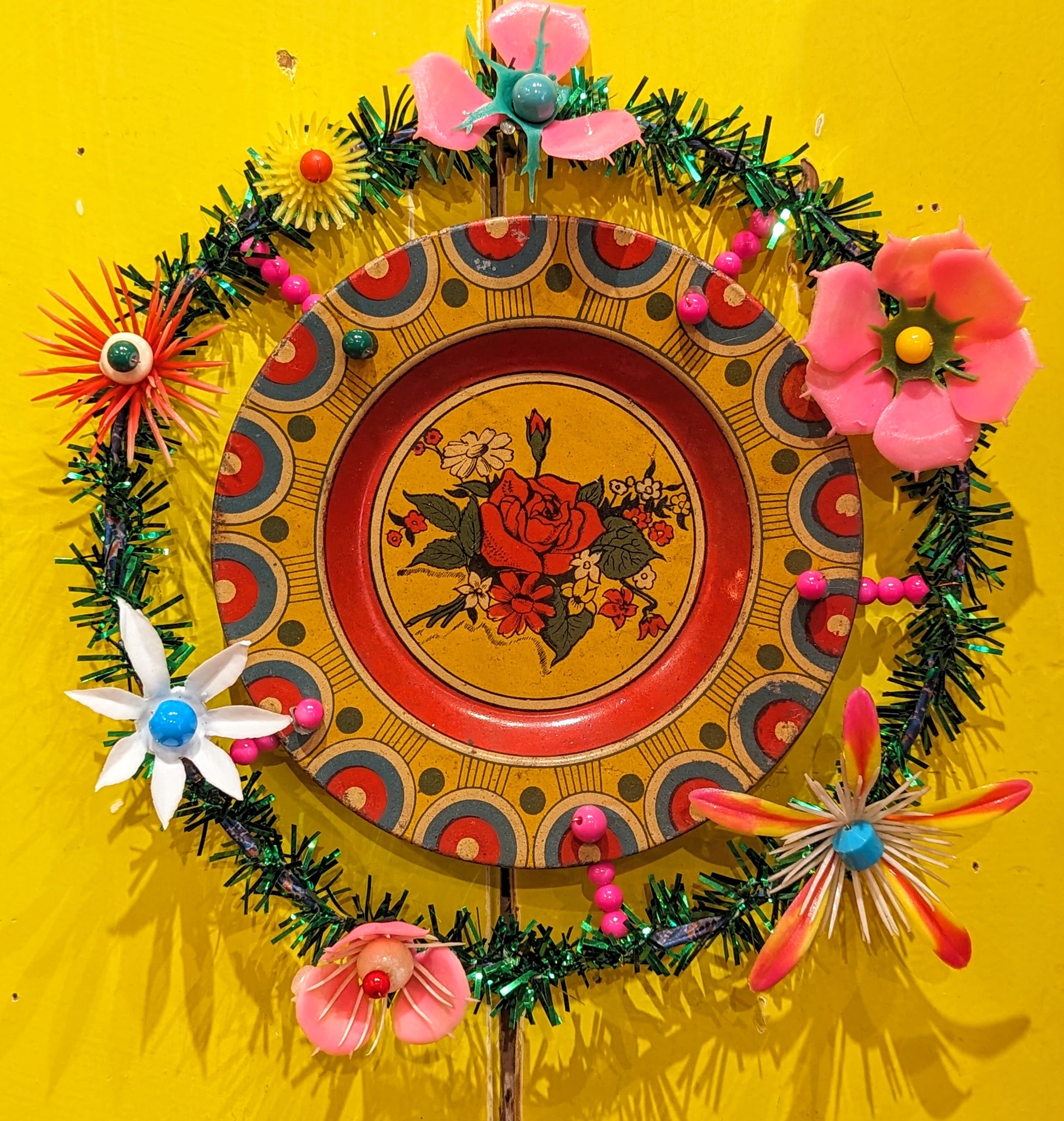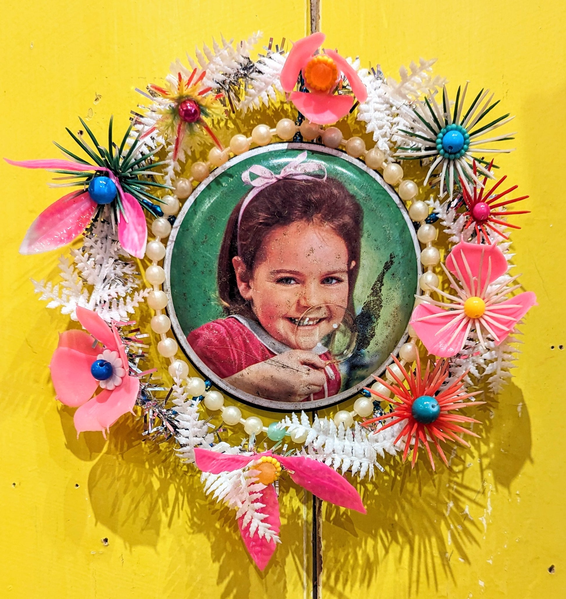 Lovingly festooned vintage kitsch toffee tin lid and vintage flower decorations by local artist and Blackout Shop girl extraordinary Jane Frances Deans.
