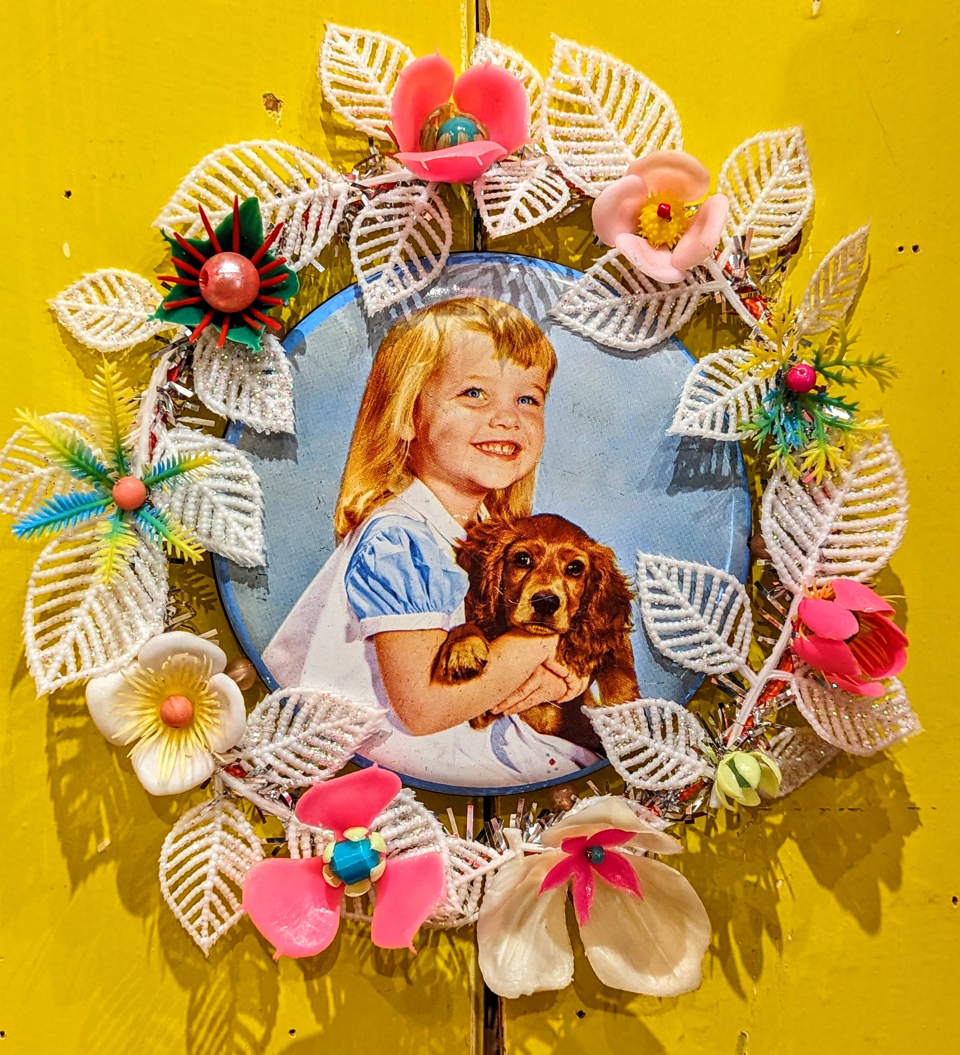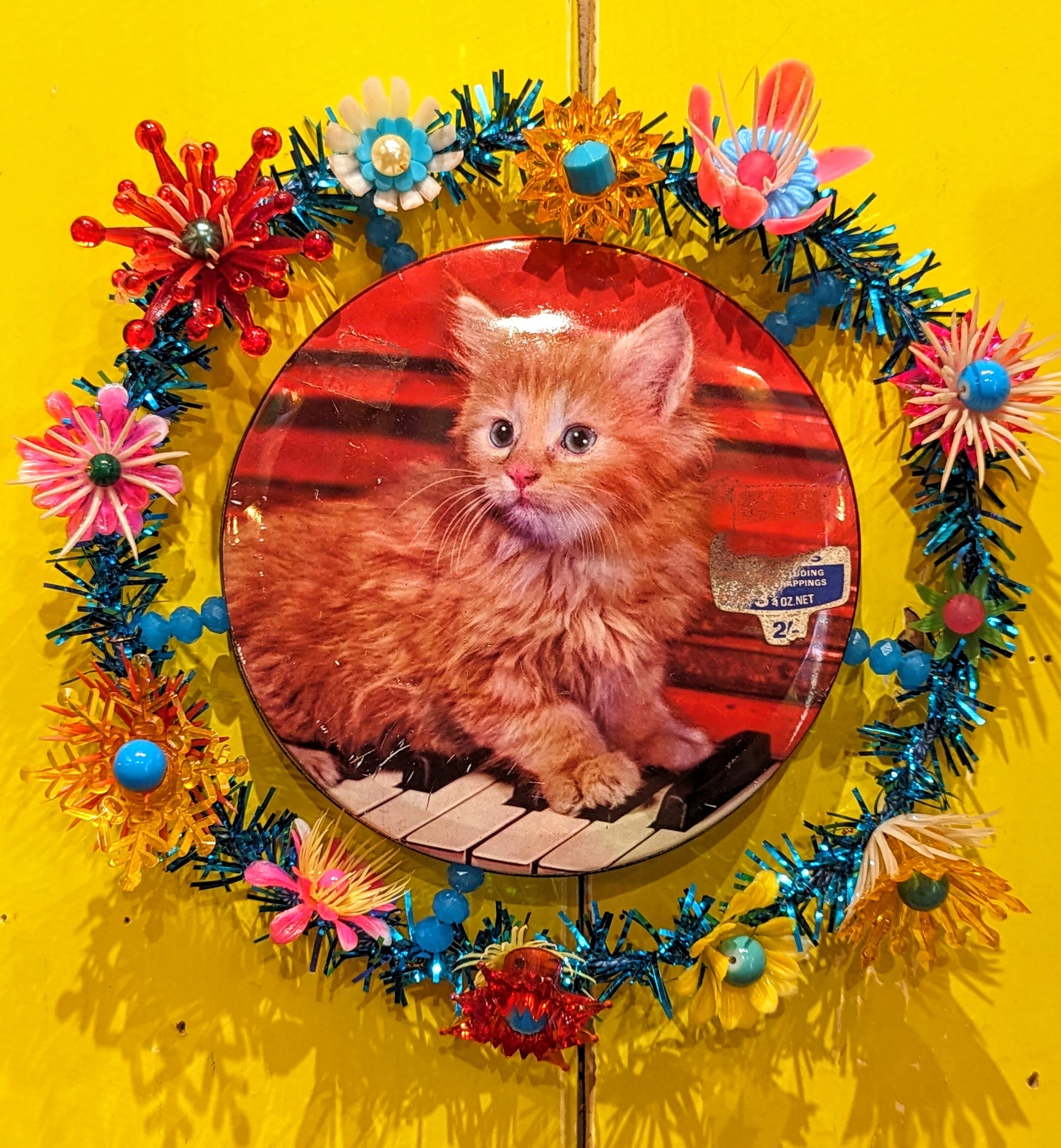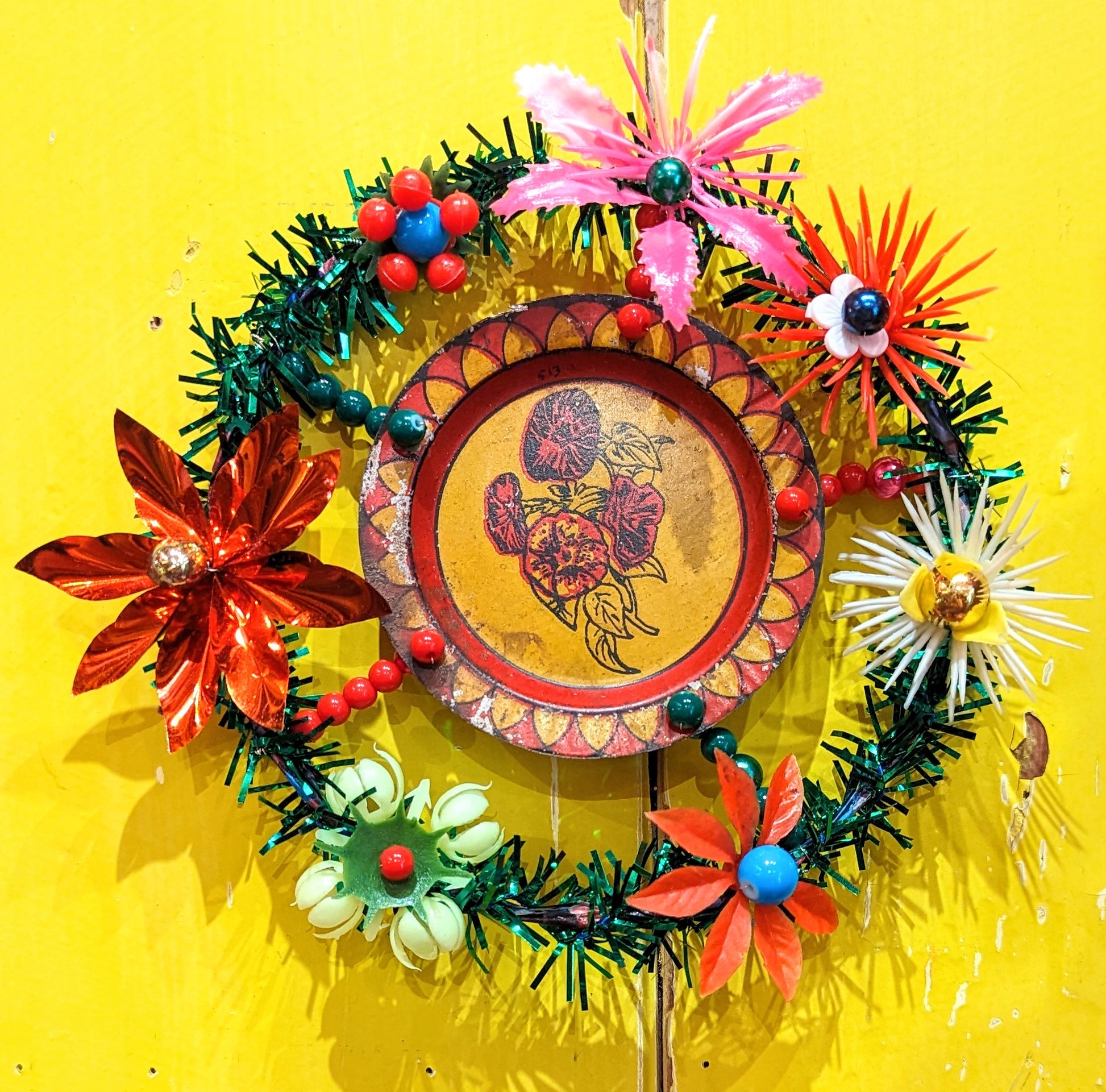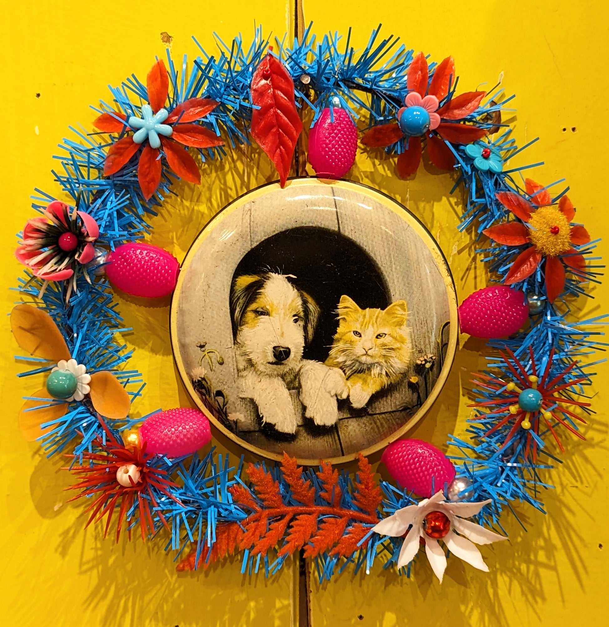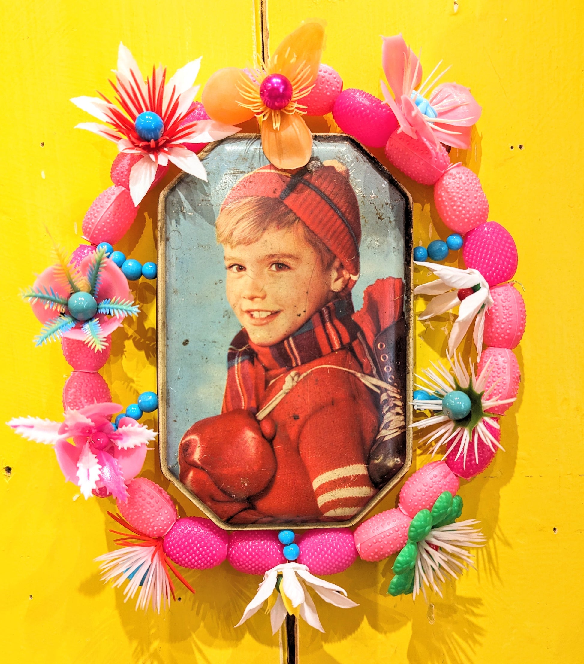 Lovingly festooned vintage kitsch toffee tin lid and vintage flower decorations by local artist and Blackout Shop girl extraordinary Jane Frances Deans.