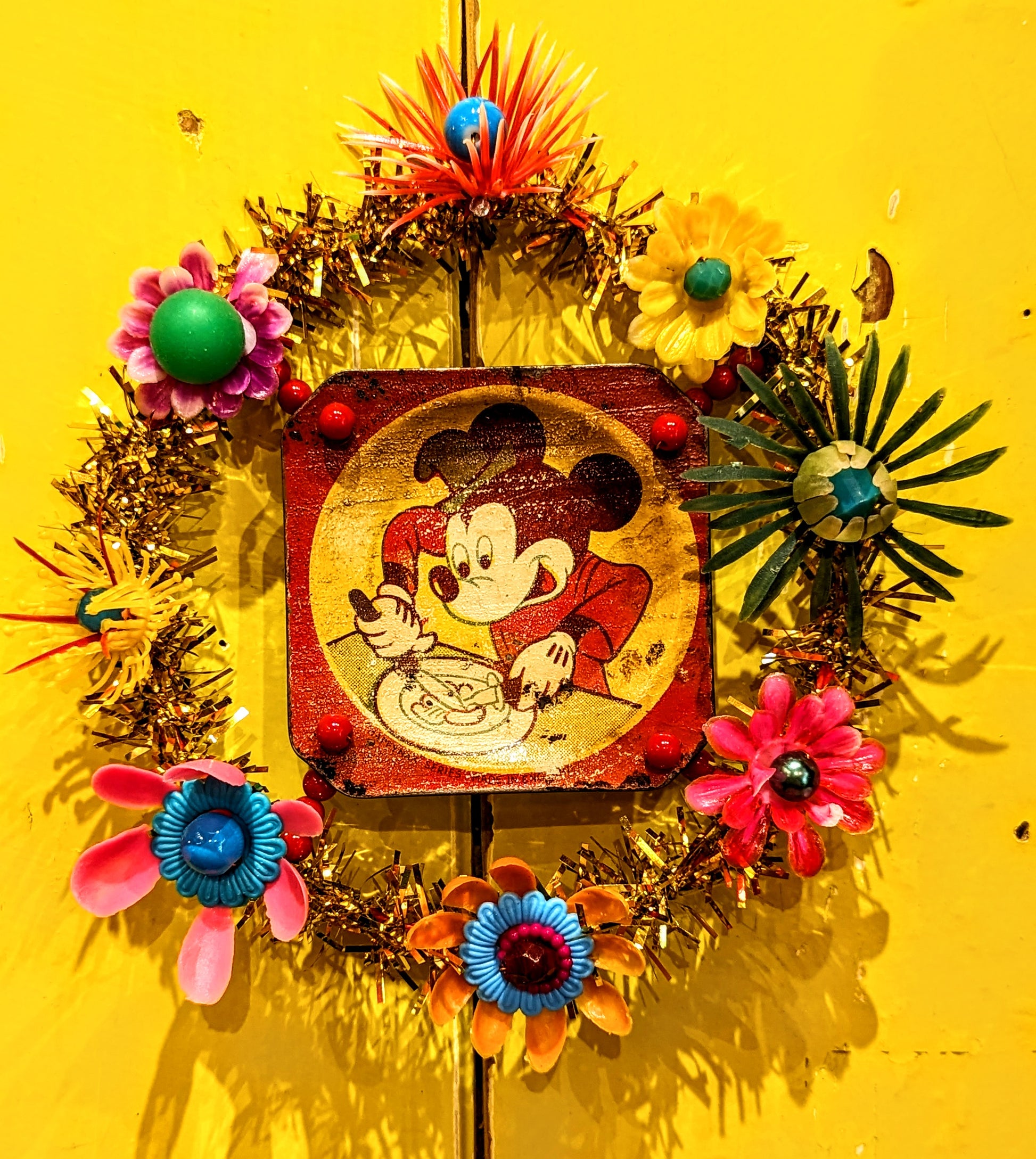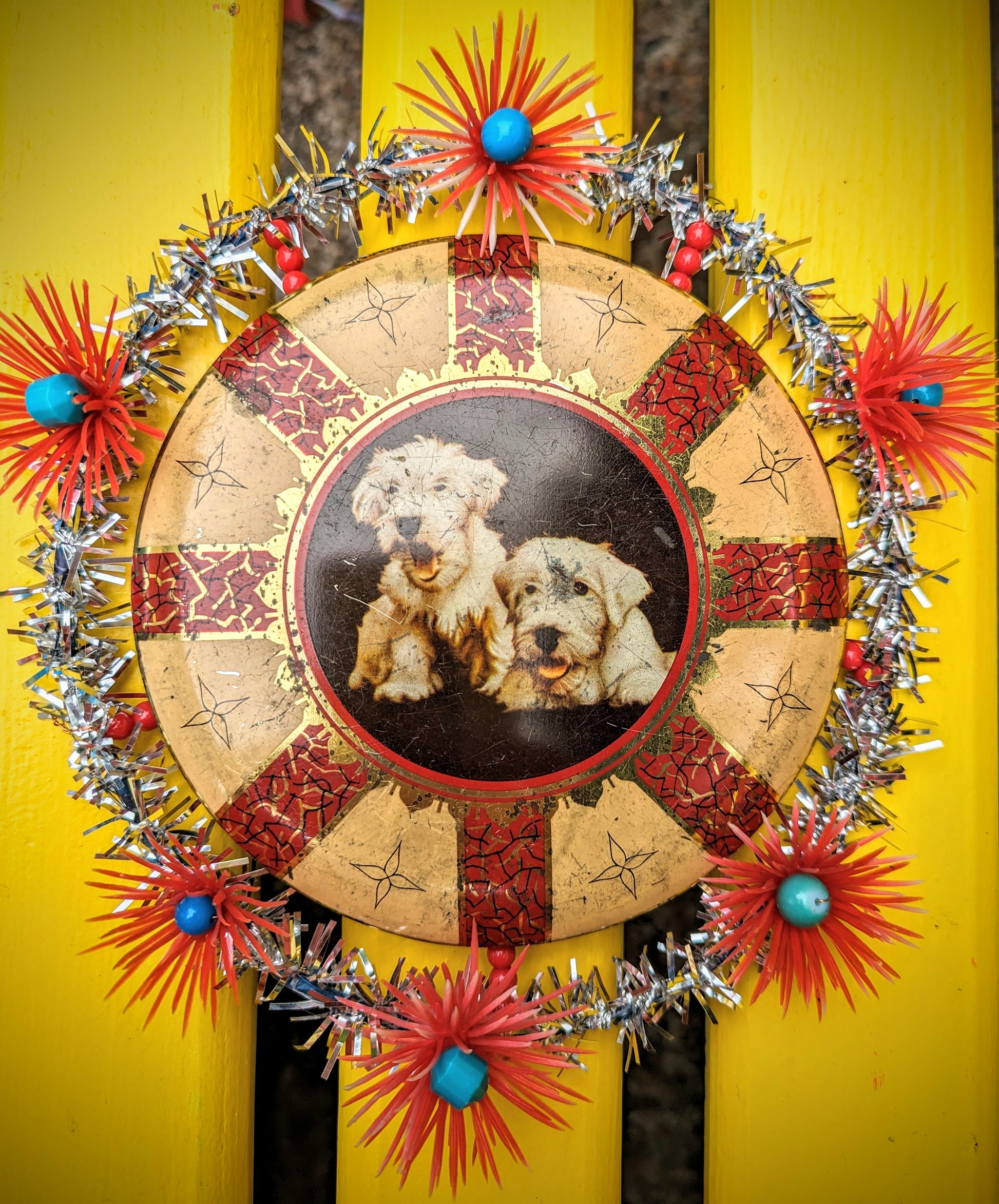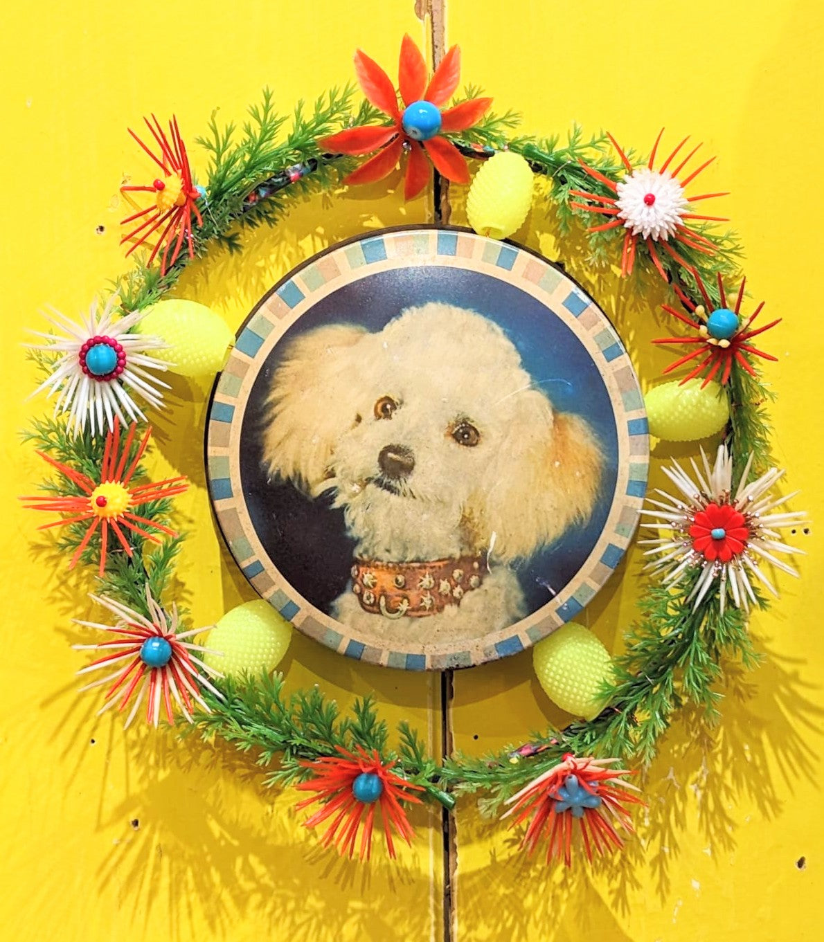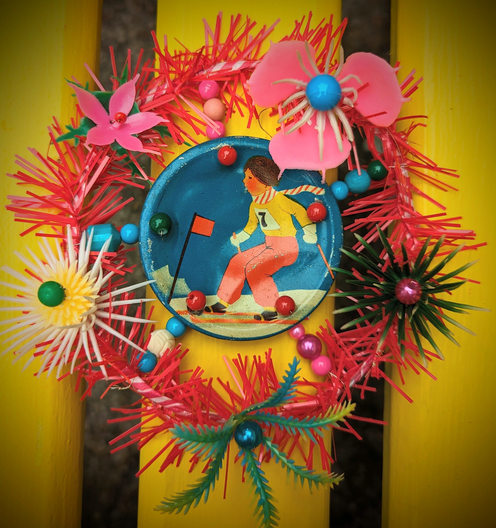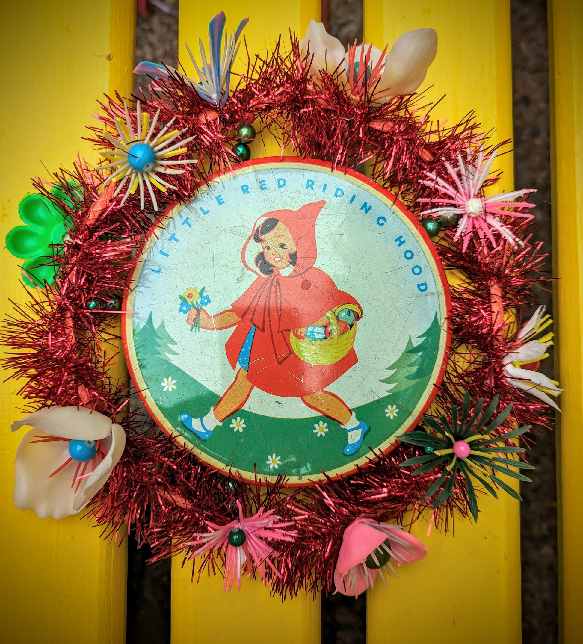 Lovingly festooned vintage kitsch toffee tin lid and vintage flower decorations by local artist and Blackout Shop girl extraordinary Jane Frances Deans.