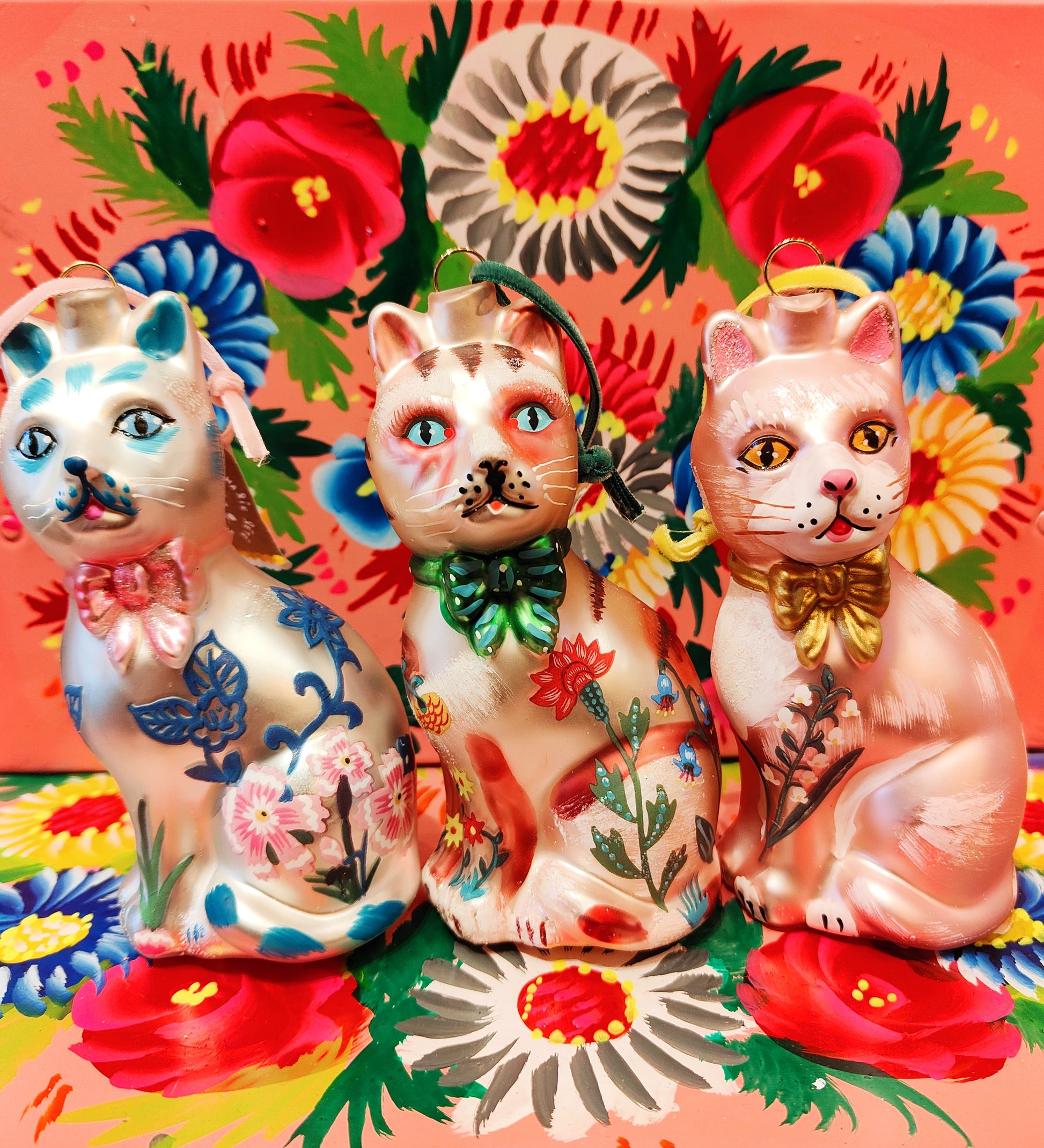 Gorgeous glass baubles with hand finished Nathalie Lete illustrations of Staffordshire pusses !