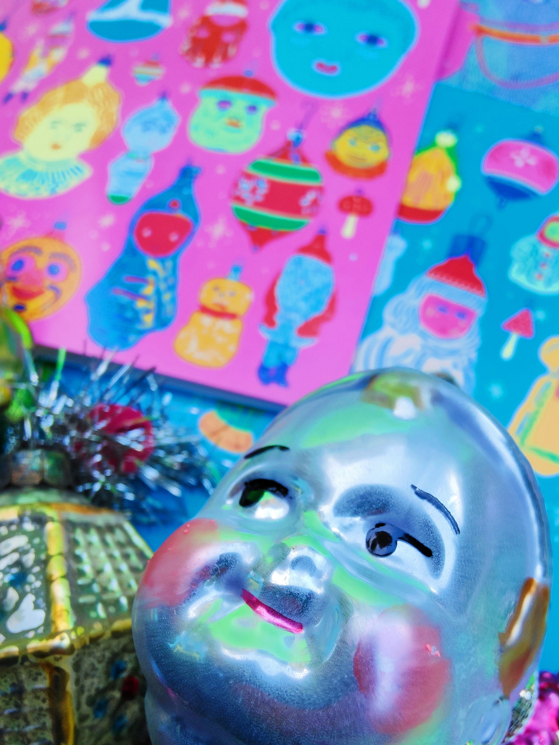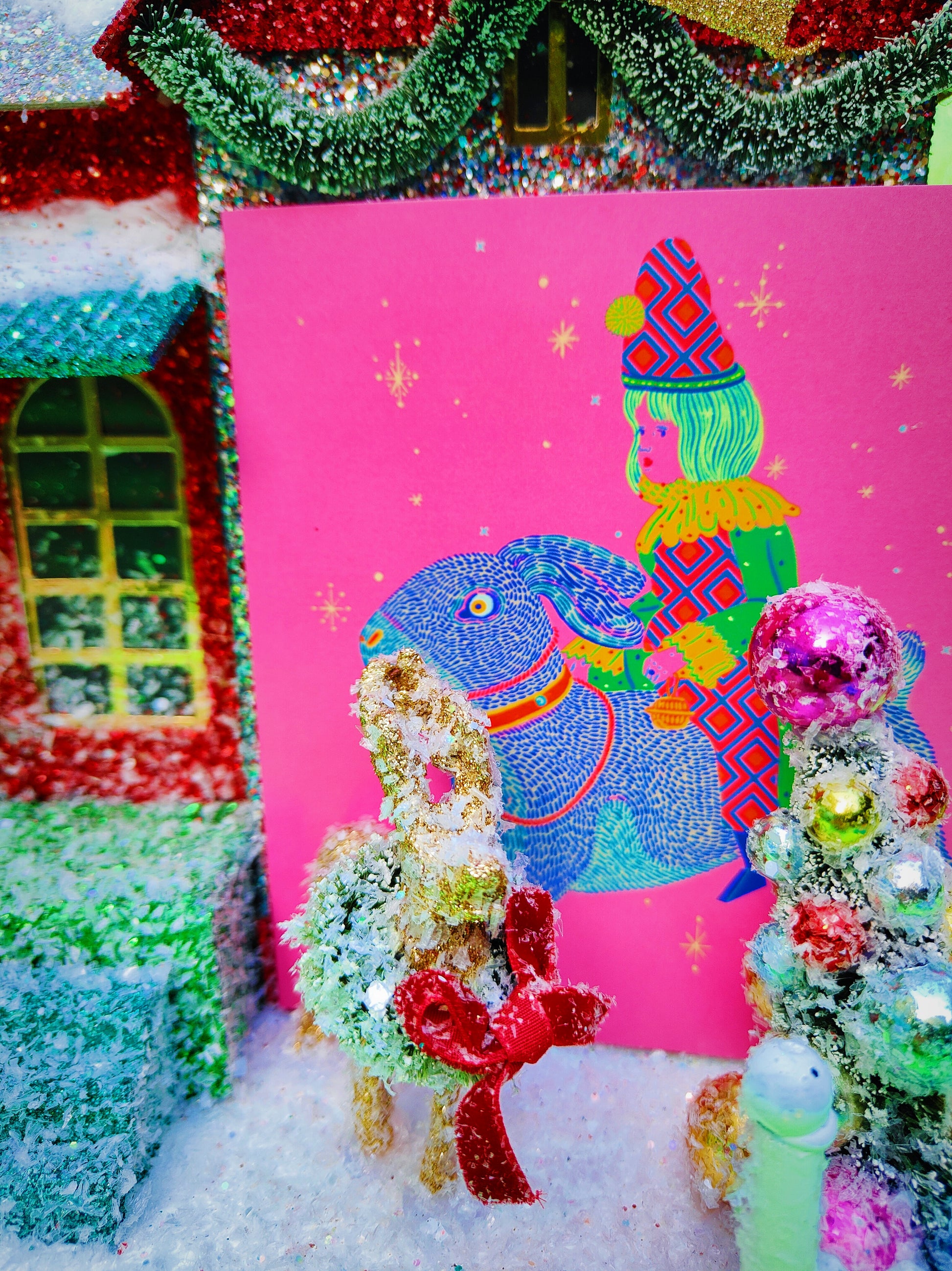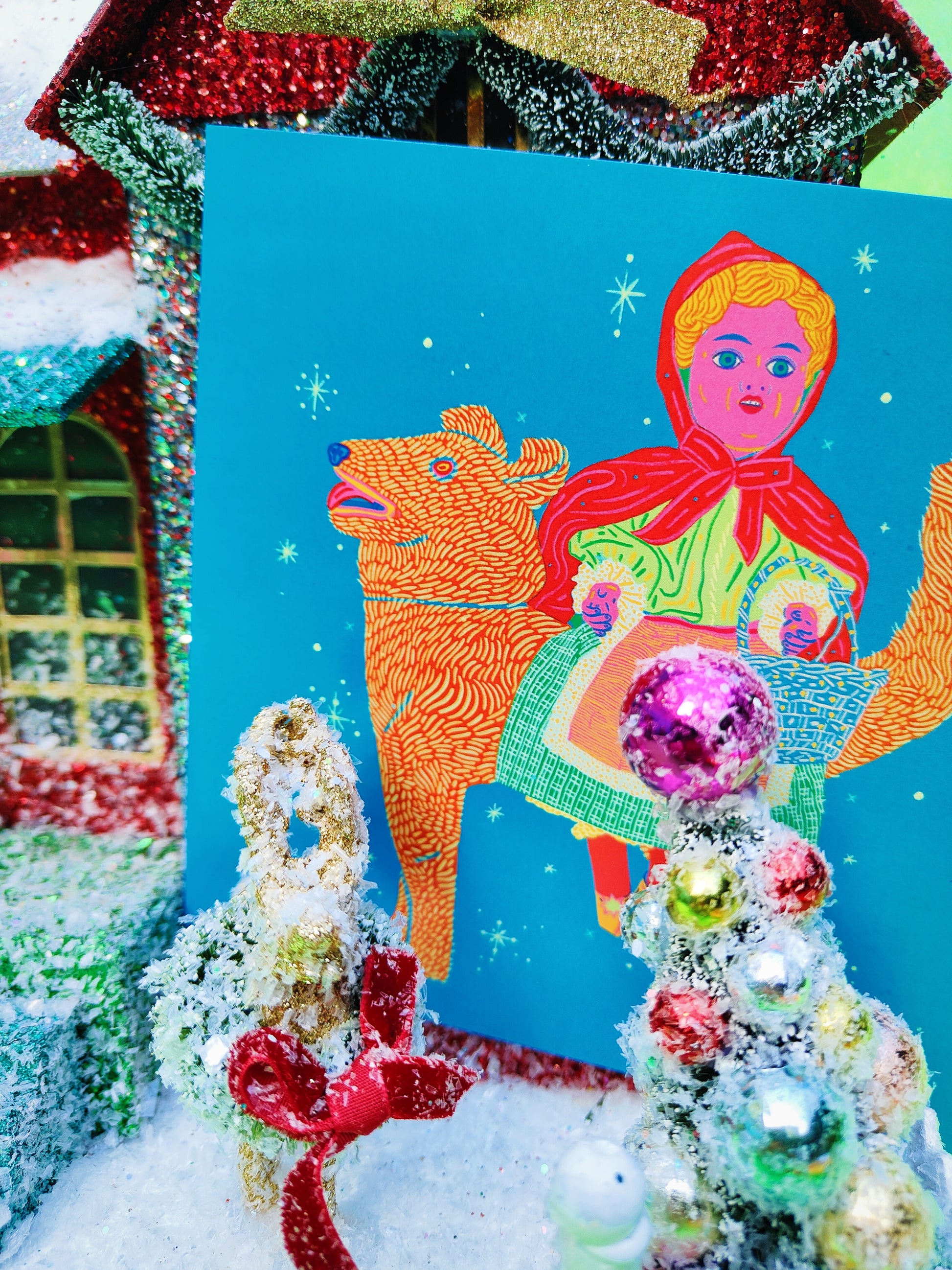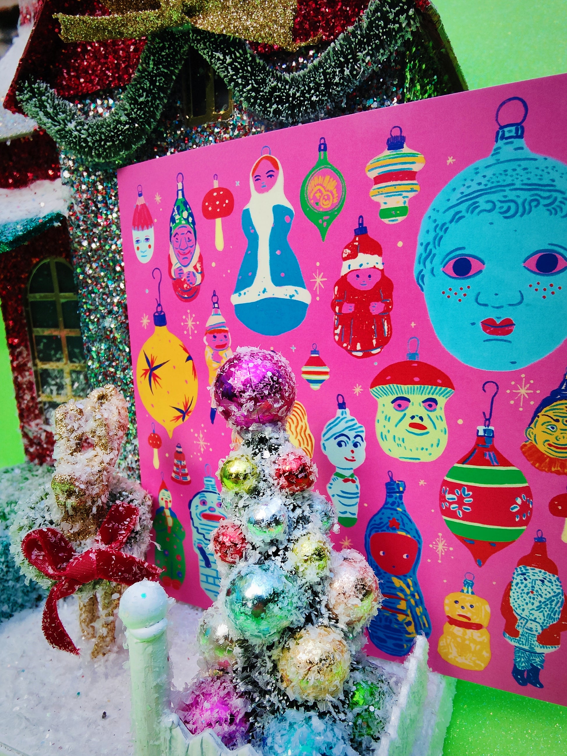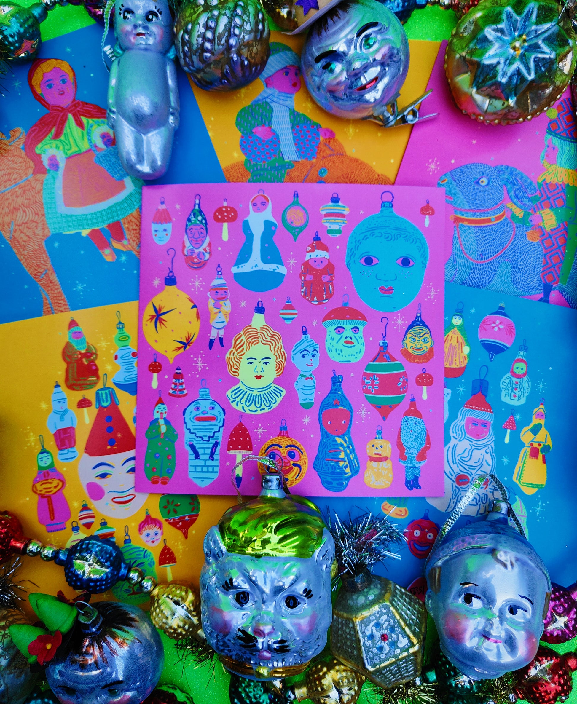 The most gorgeous (frameable!) cards of all our favourite folk toys and vintage German and Soviet Christmas baubles by Bristol printmaker Anna Higgie, delicious colours too!!
