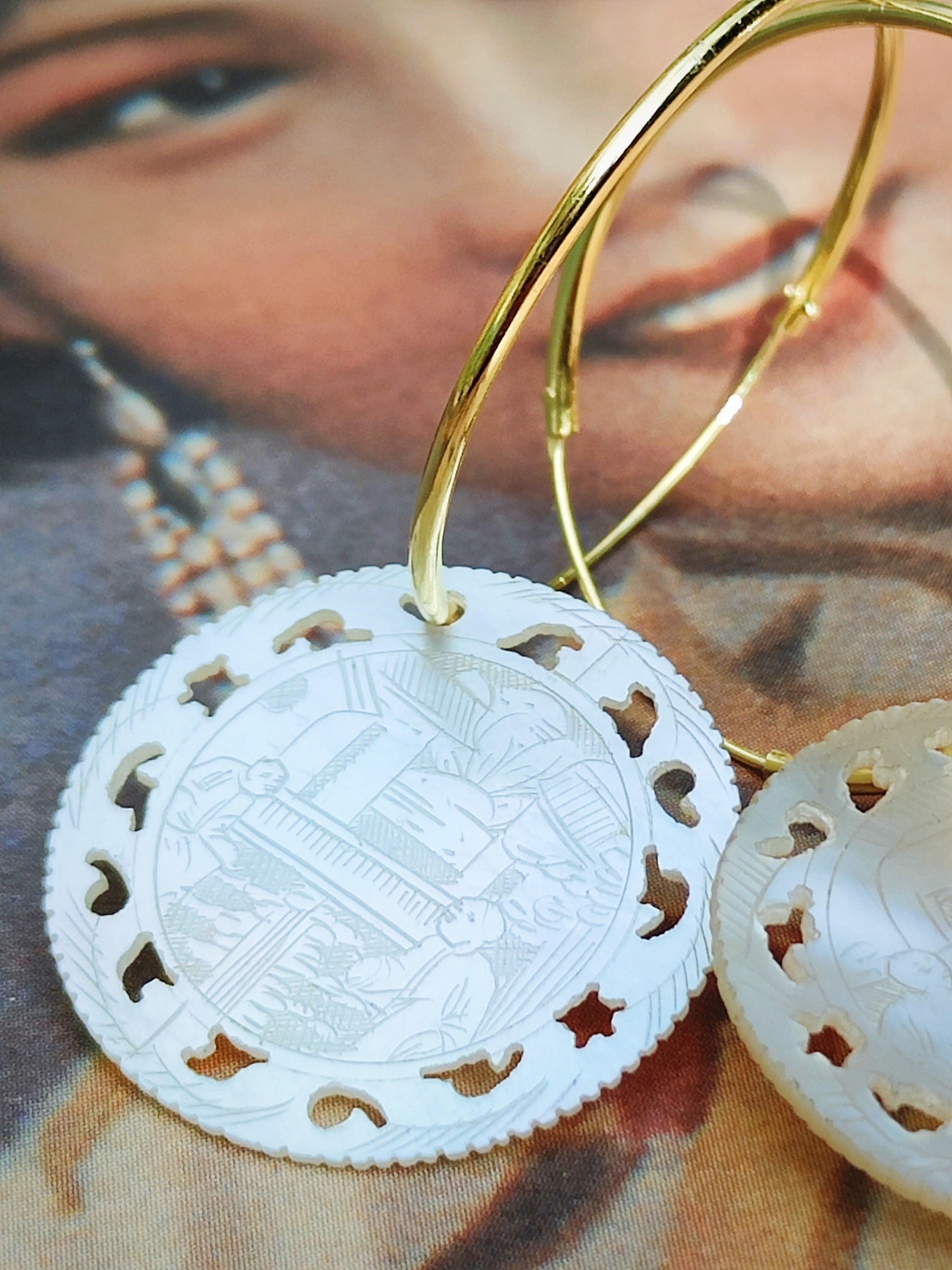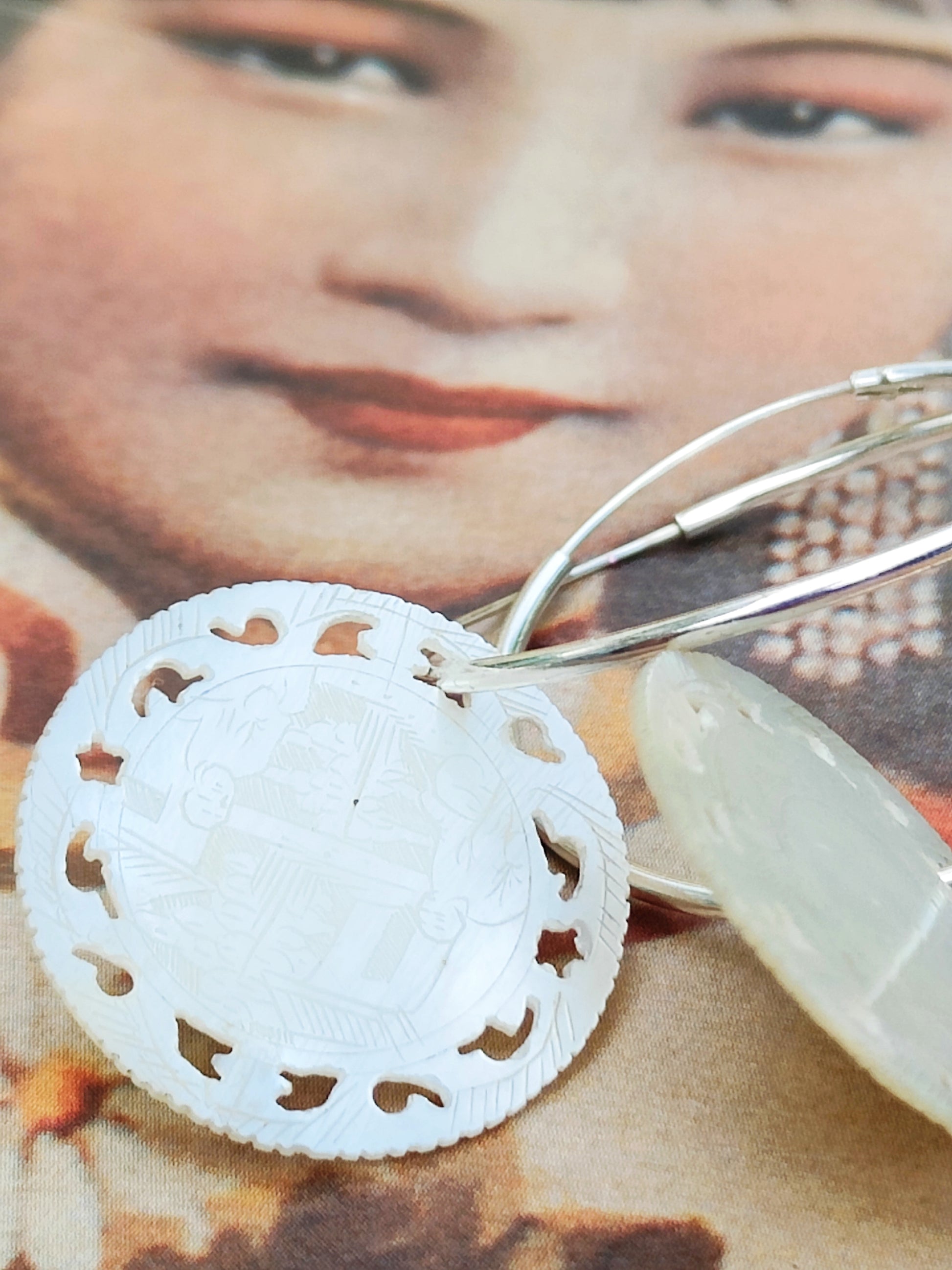 Gorgeous hoop earrings with antique, Chinese hand carved mother of pearl gaming counters hanging from them.