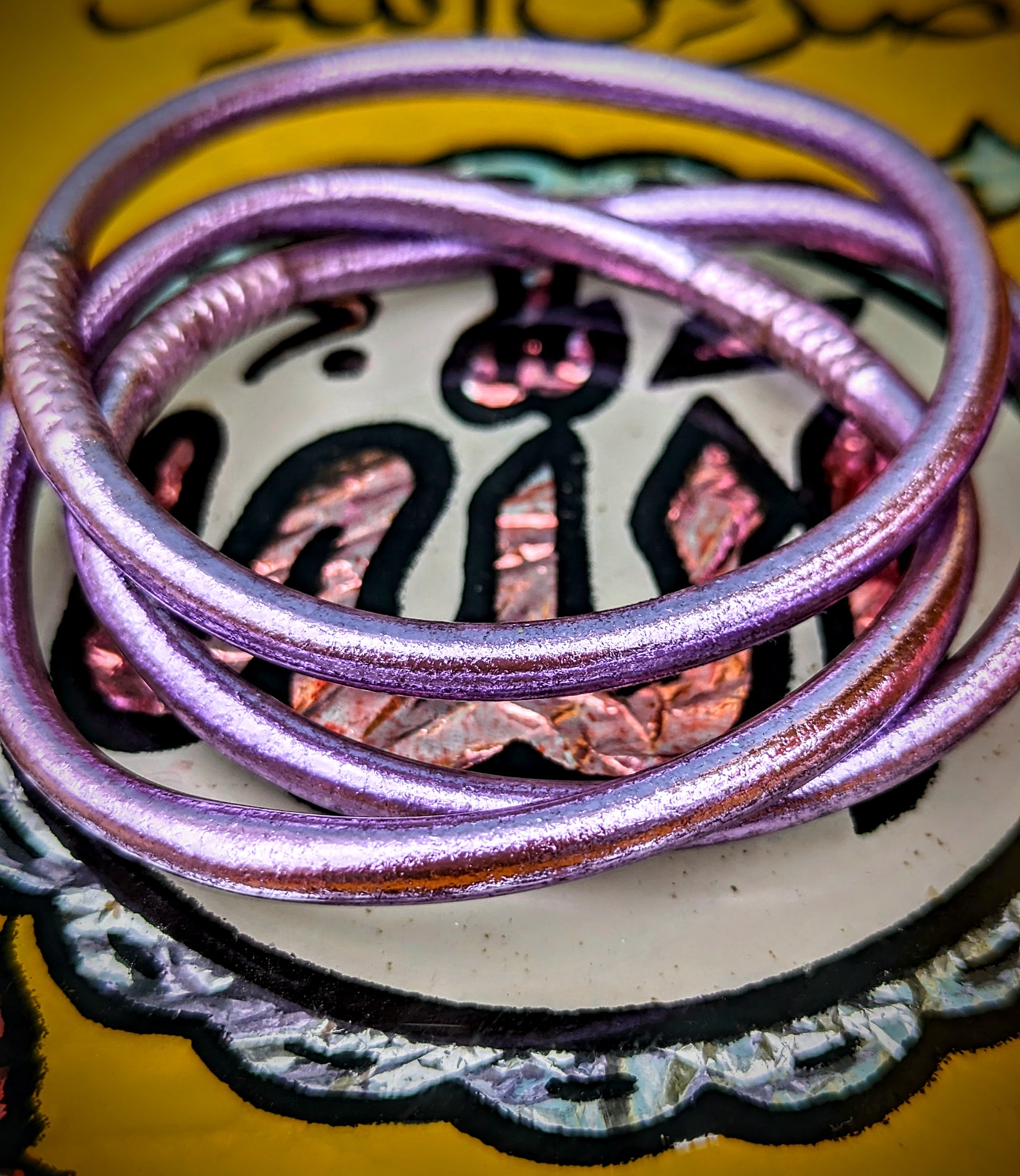 Crafted in Thailand , these are made from tubing lined by hand with real coloured gold leaf, the same as is used on Buddha statues. Wear them swimming, working, playing and you never lose the glam, disco dolly shine!