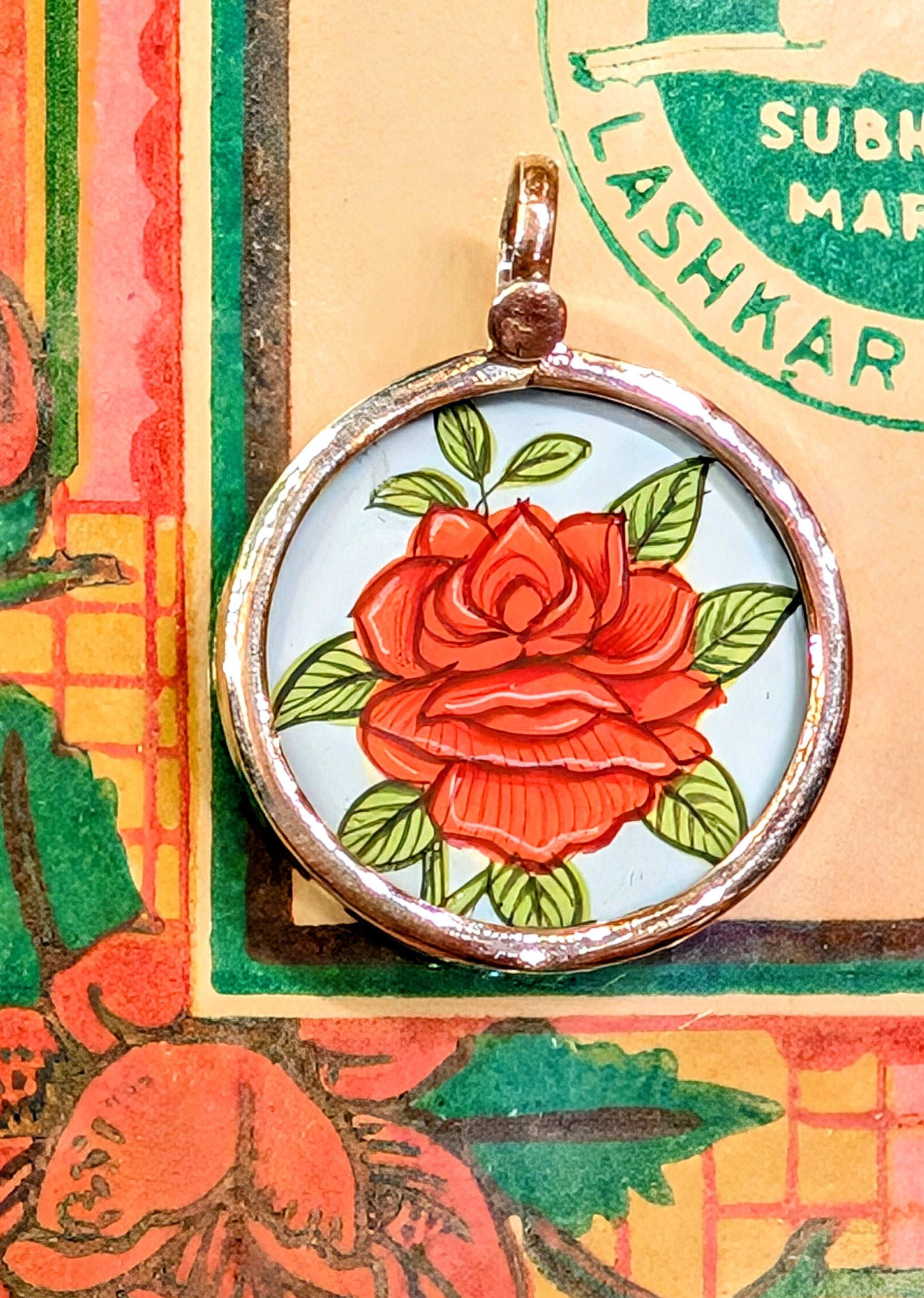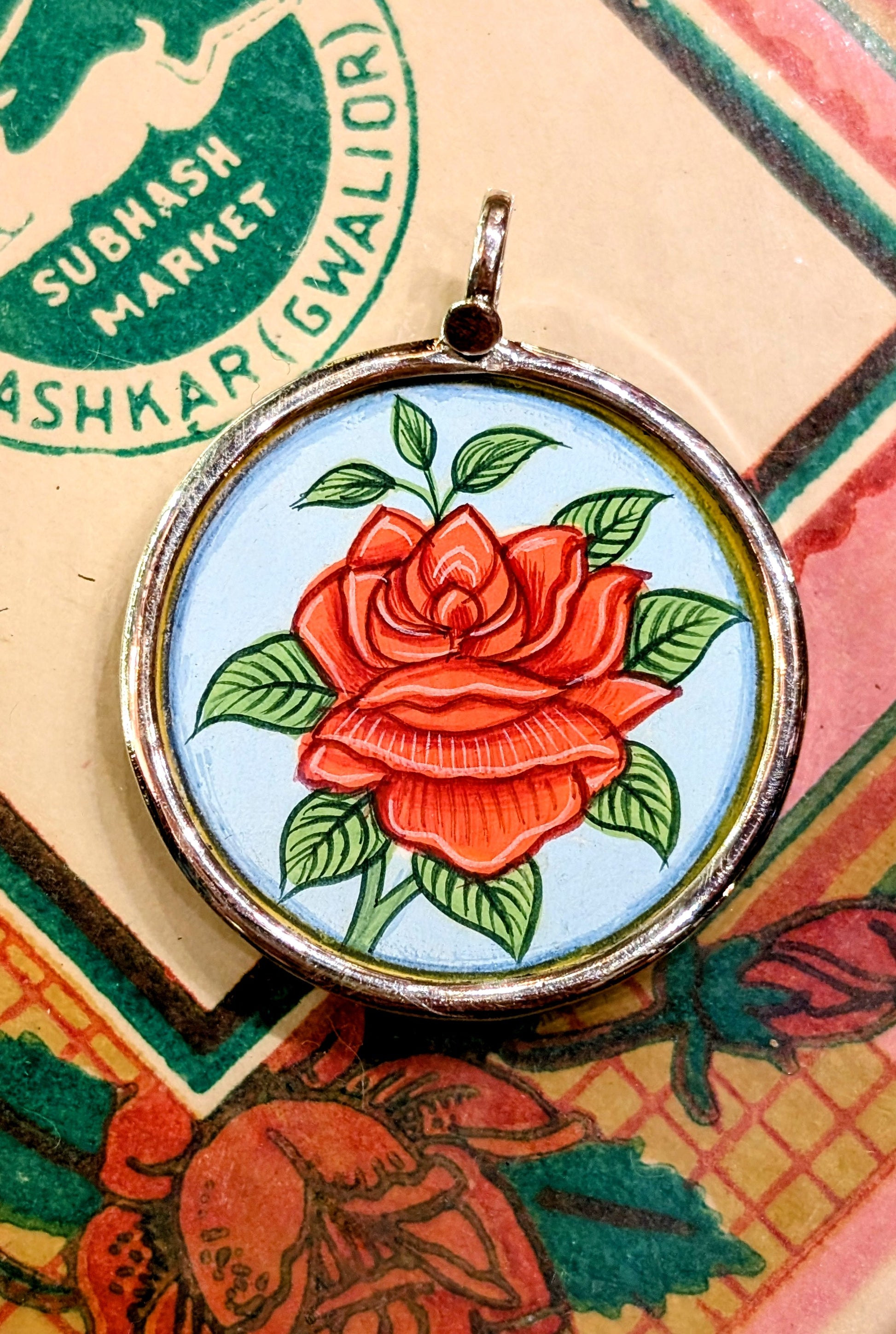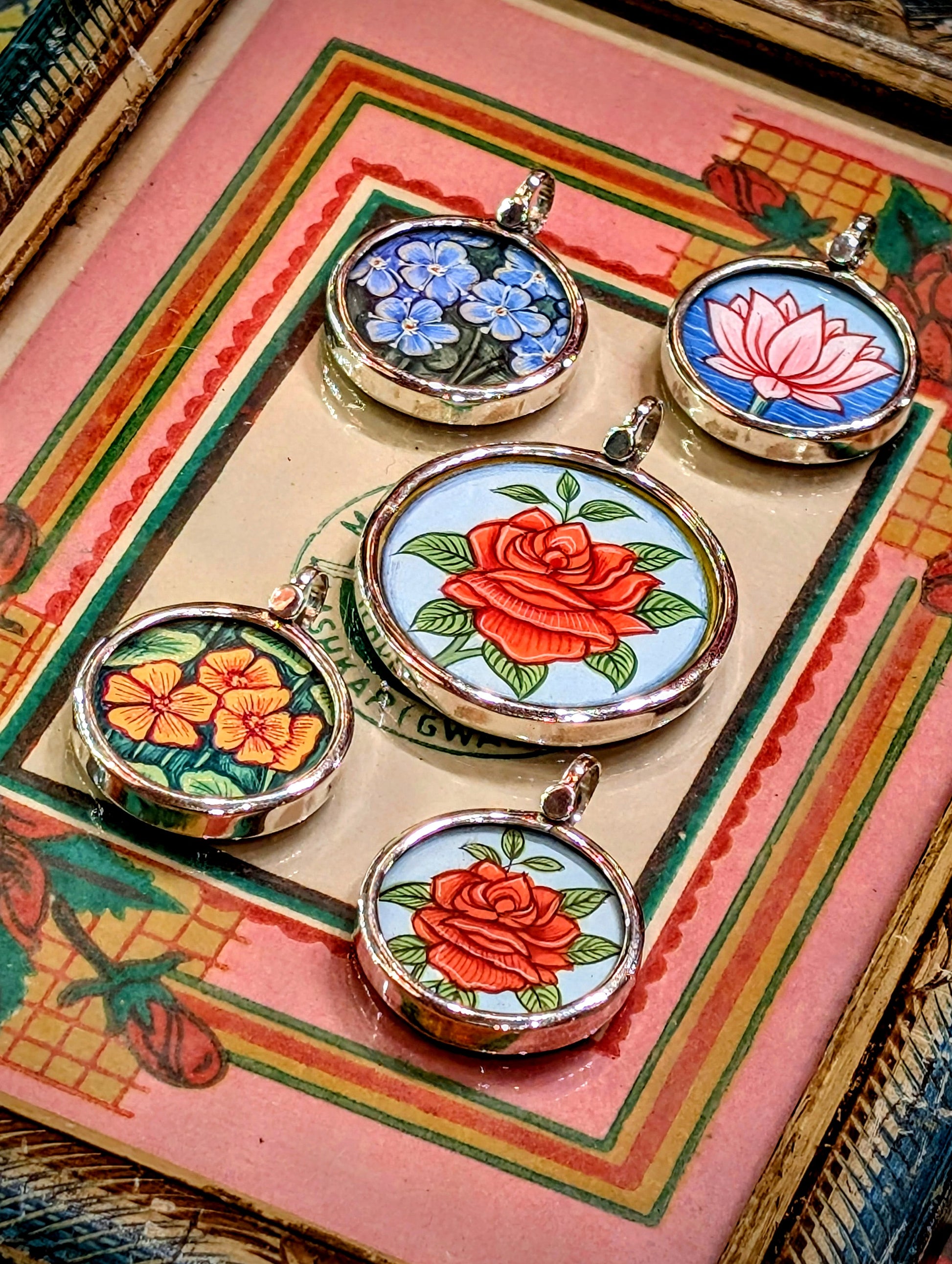 Made in Rajasthan, these pendants are crafted from sterling silver, glass and hand painted images on paper. The fine craftsmanship in these paintings is mind blowing, painting with single paint brush bristles!!!