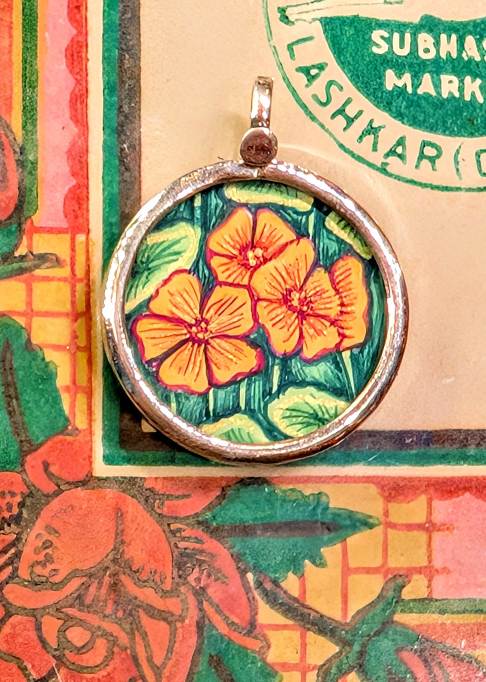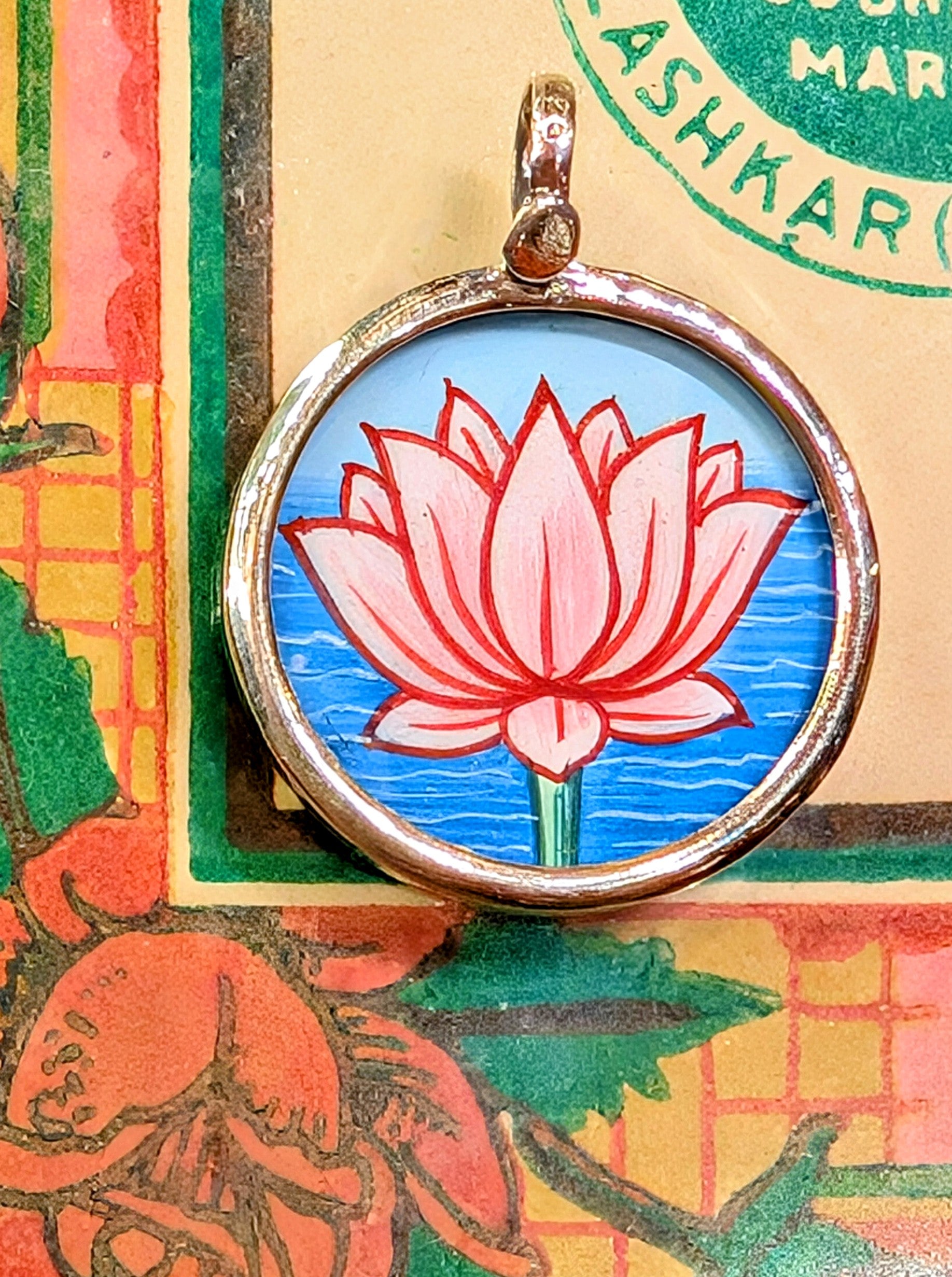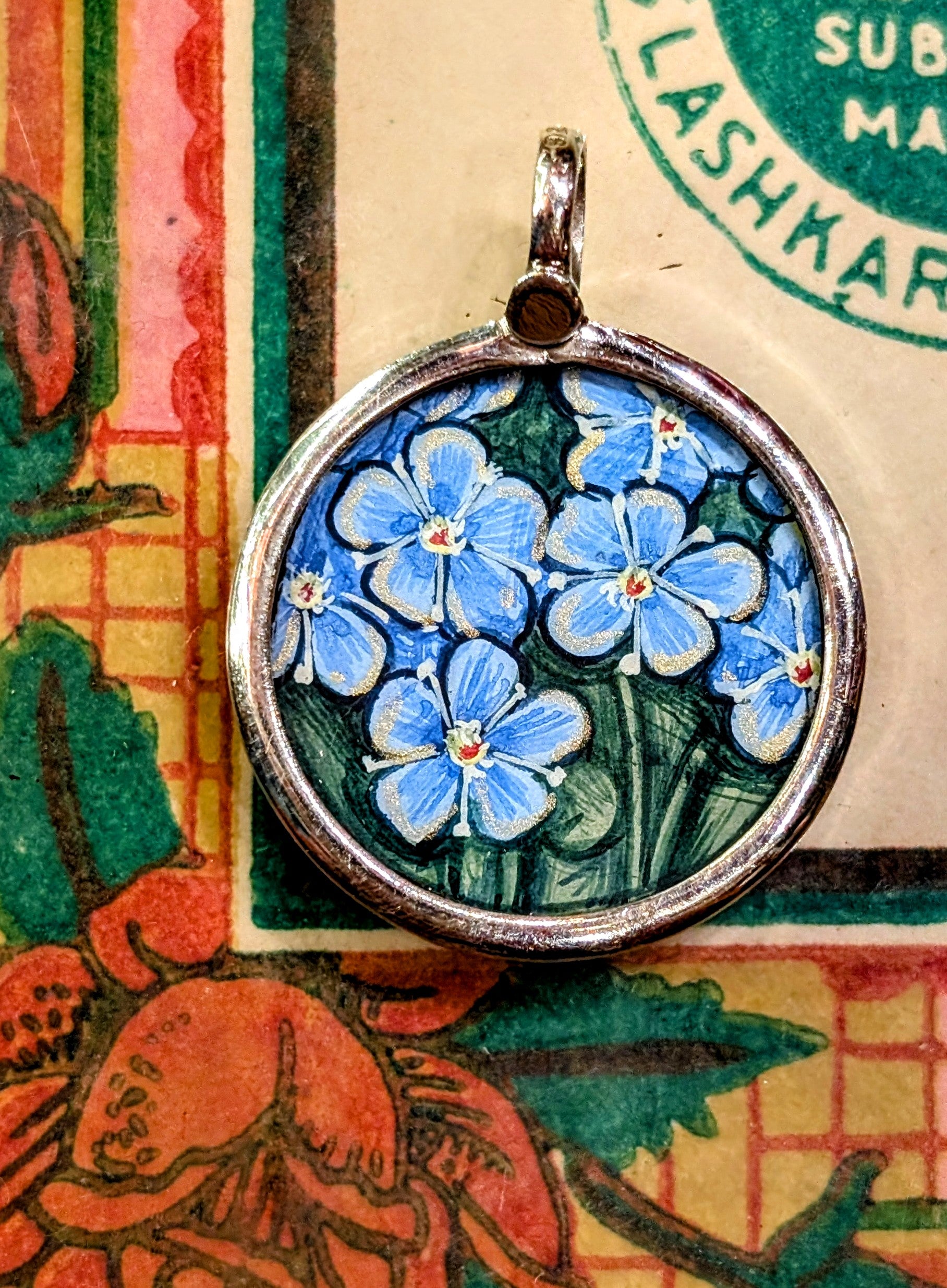 Made in Rajasthan, these pendants are crafted from sterling silver, glass and hand painted images on paper. The fine craftsmanship in these paintings is mind blowing, painting with single paint brush bristles!!!