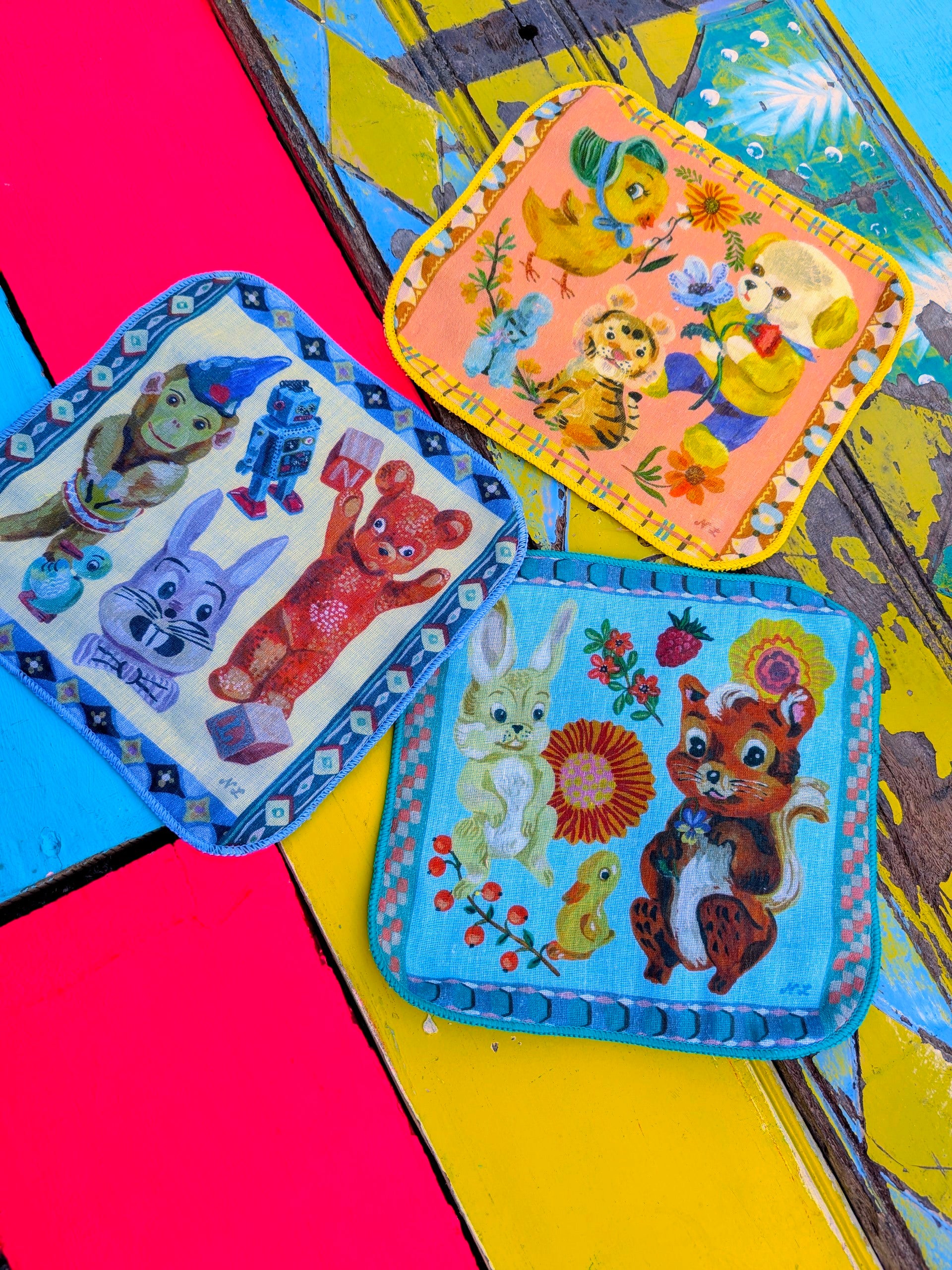 Lordy, these are the most beautiful paintings of beloved toys by Nathalie Lete, and printed on super soft muslin backed in bright cotton towelling.