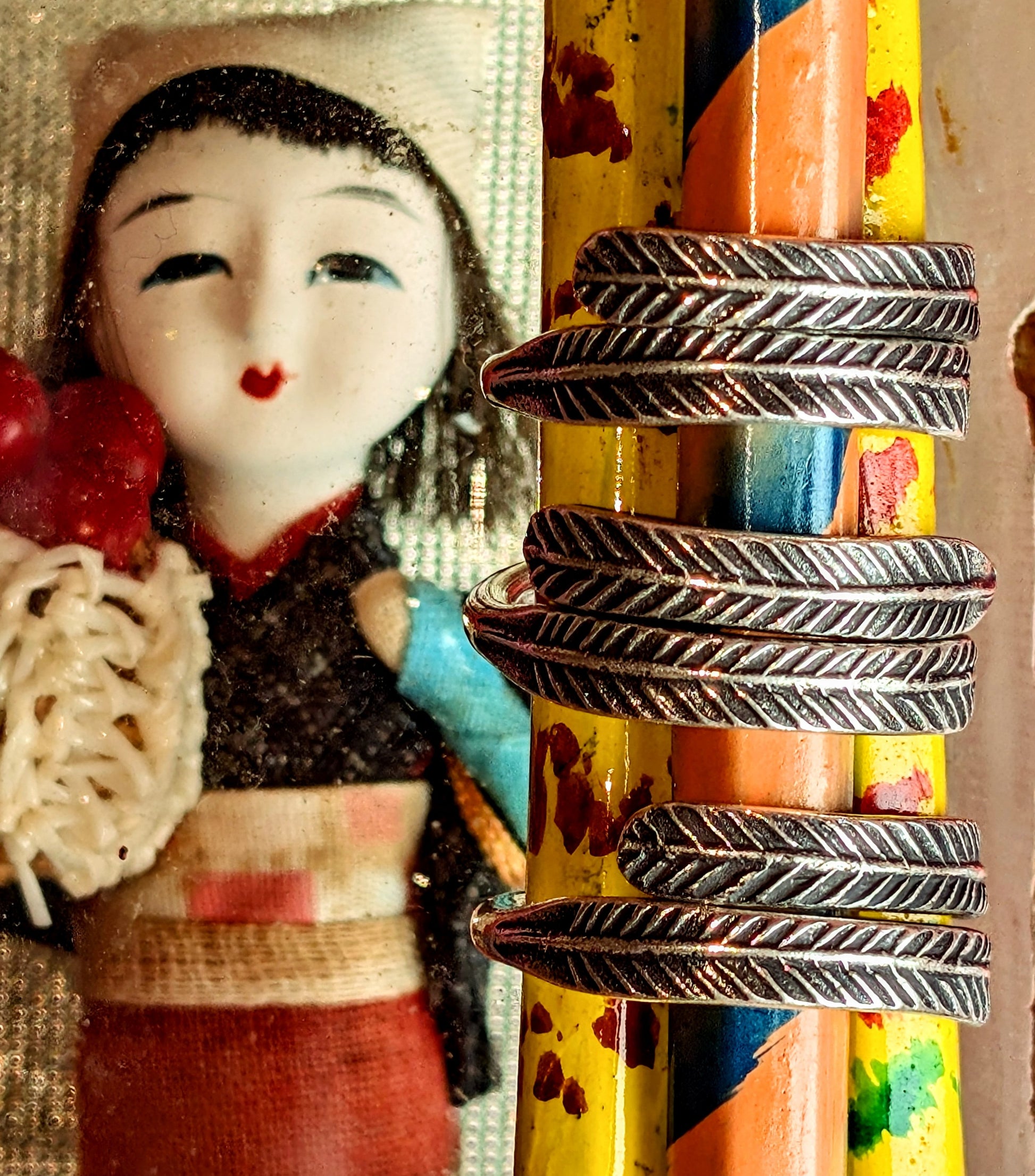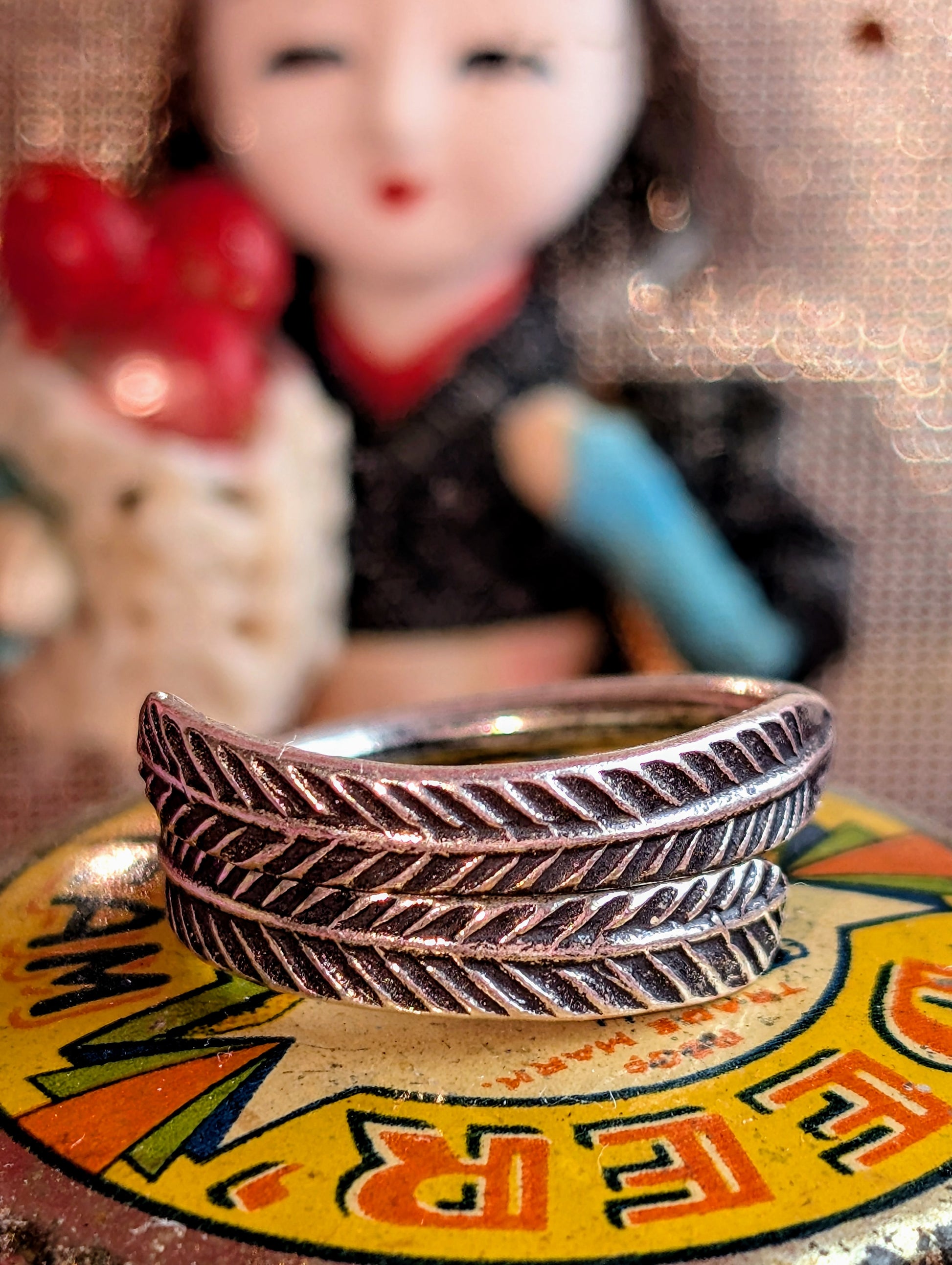 Coiled feathers to wrap around your fingers!, made in the mountains of Myanmar. Available in sizes, but these are such soft silver they can be stretched or coiled in to fit.