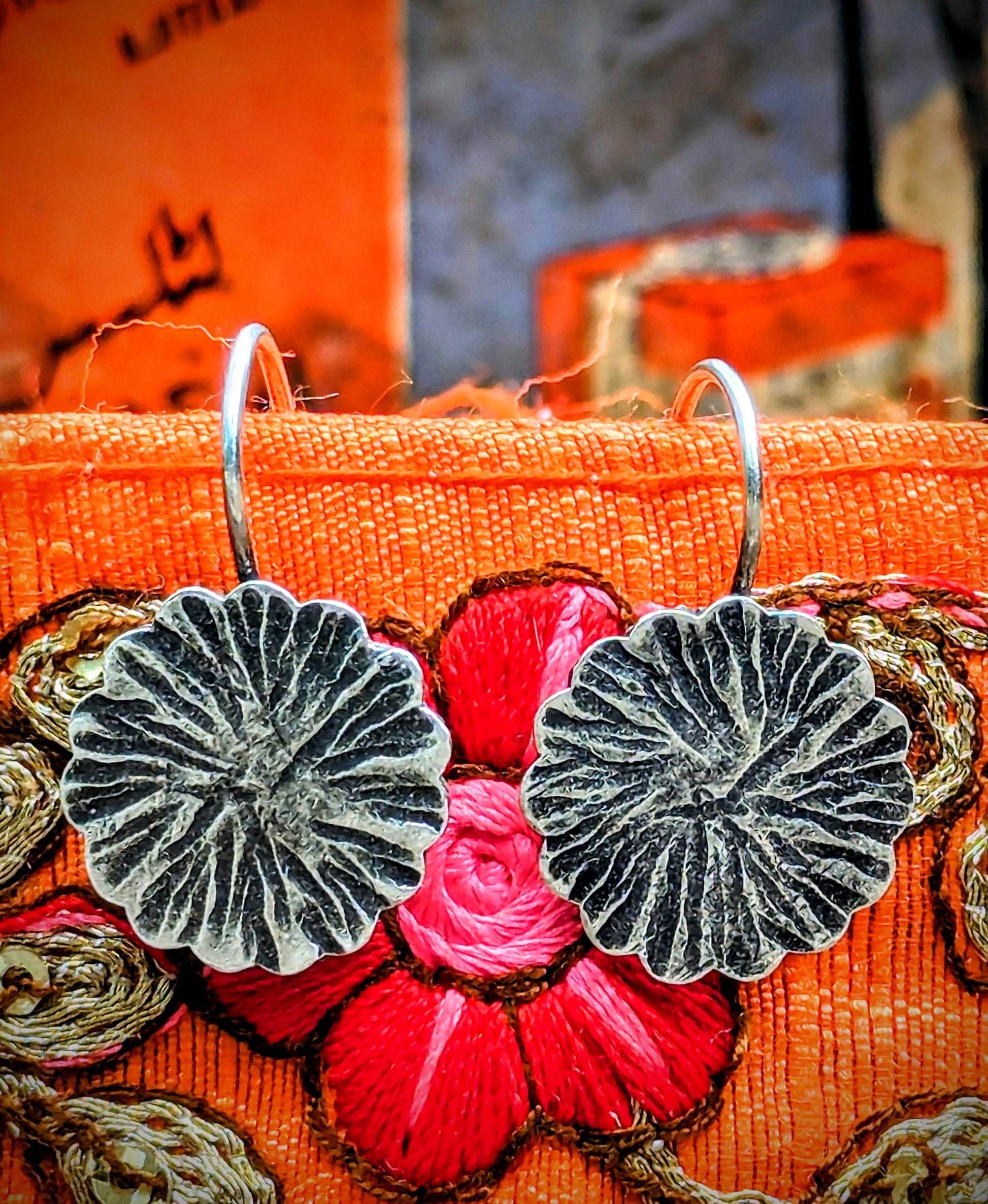 Handmade Burmese Karen earrings, beautiful textured floral rounds with nice long hooks for a secure fit.