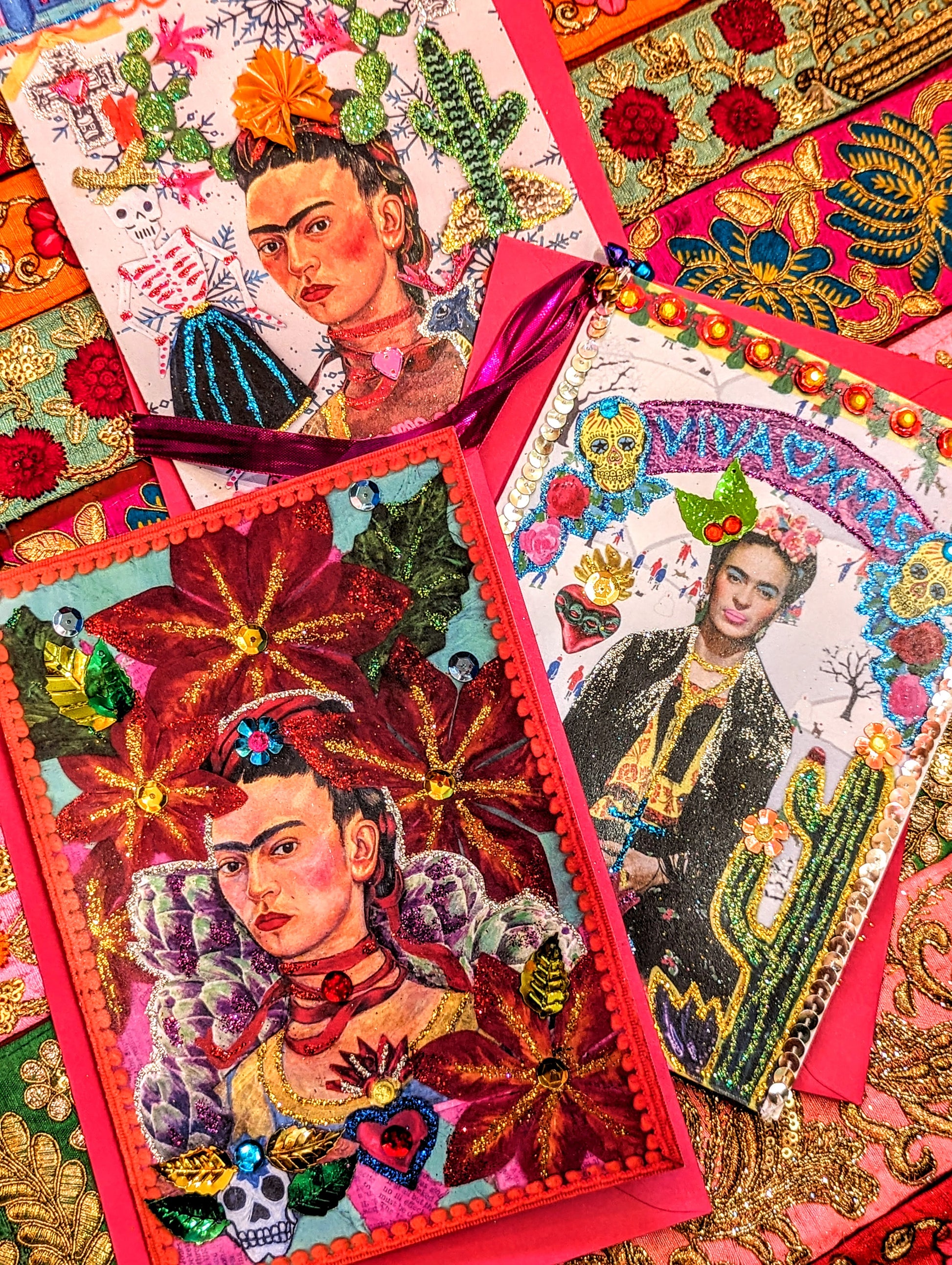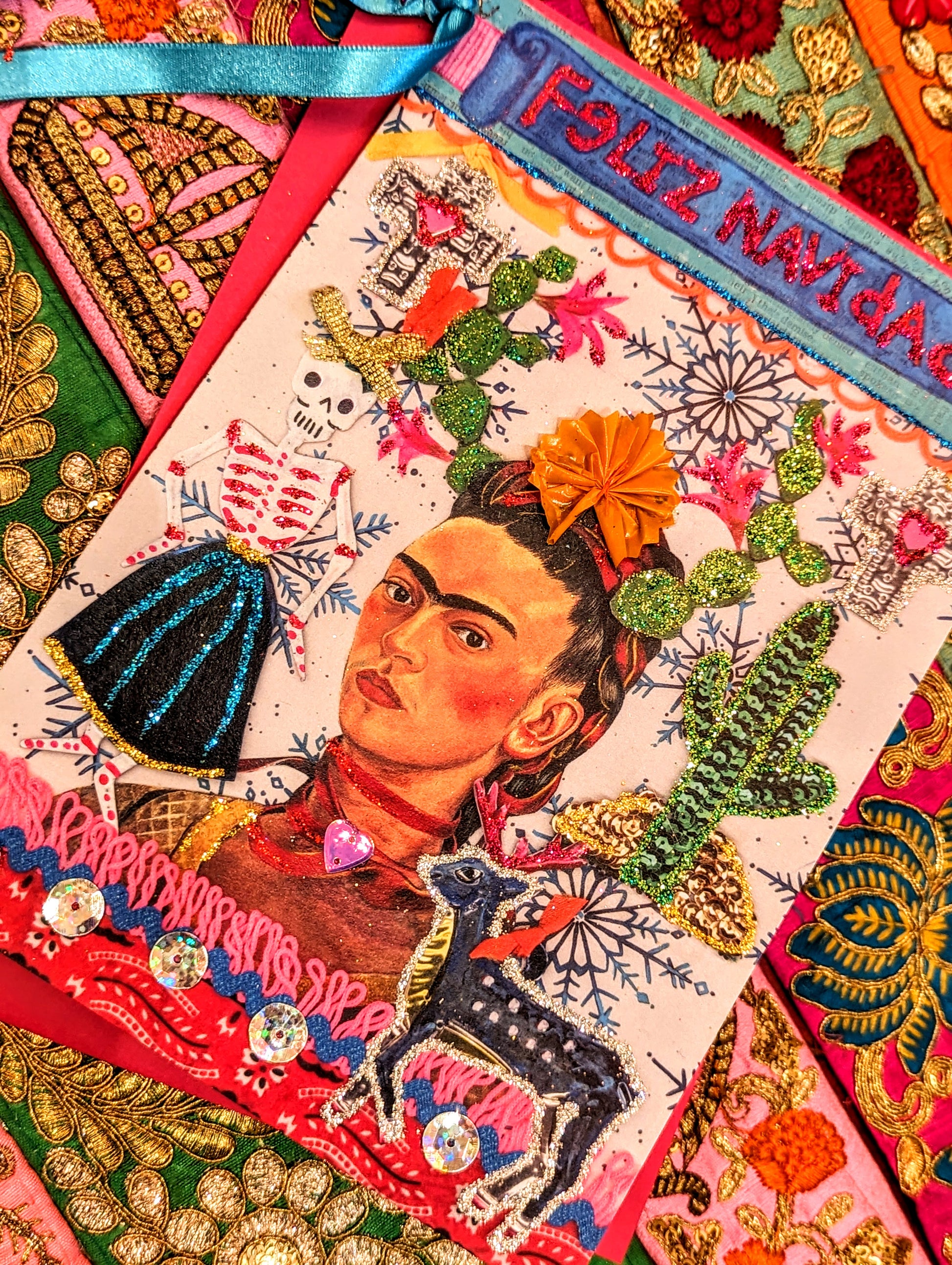 Hand decorated glittery, beribboned gorgeous fancy Frida Kahlo Christmas card with bells, sequins, glitter and charms on!!