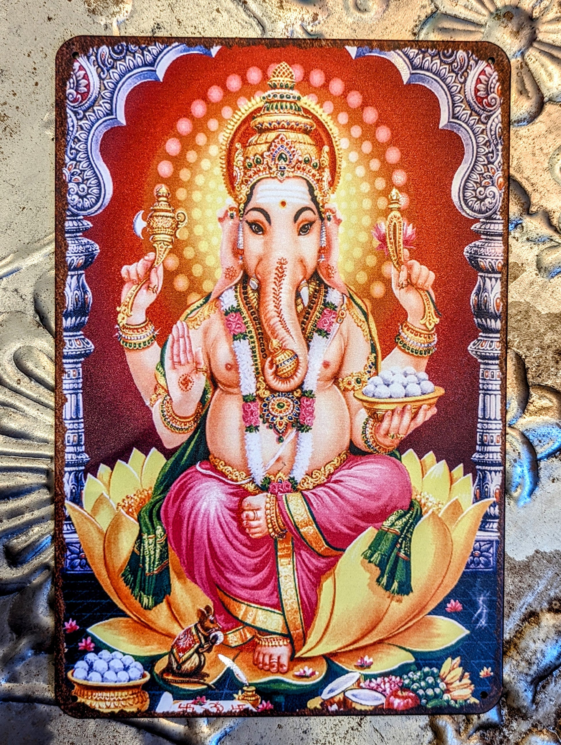 Glorious Ganesh , his rat and his favourite sweets on a tin sign!