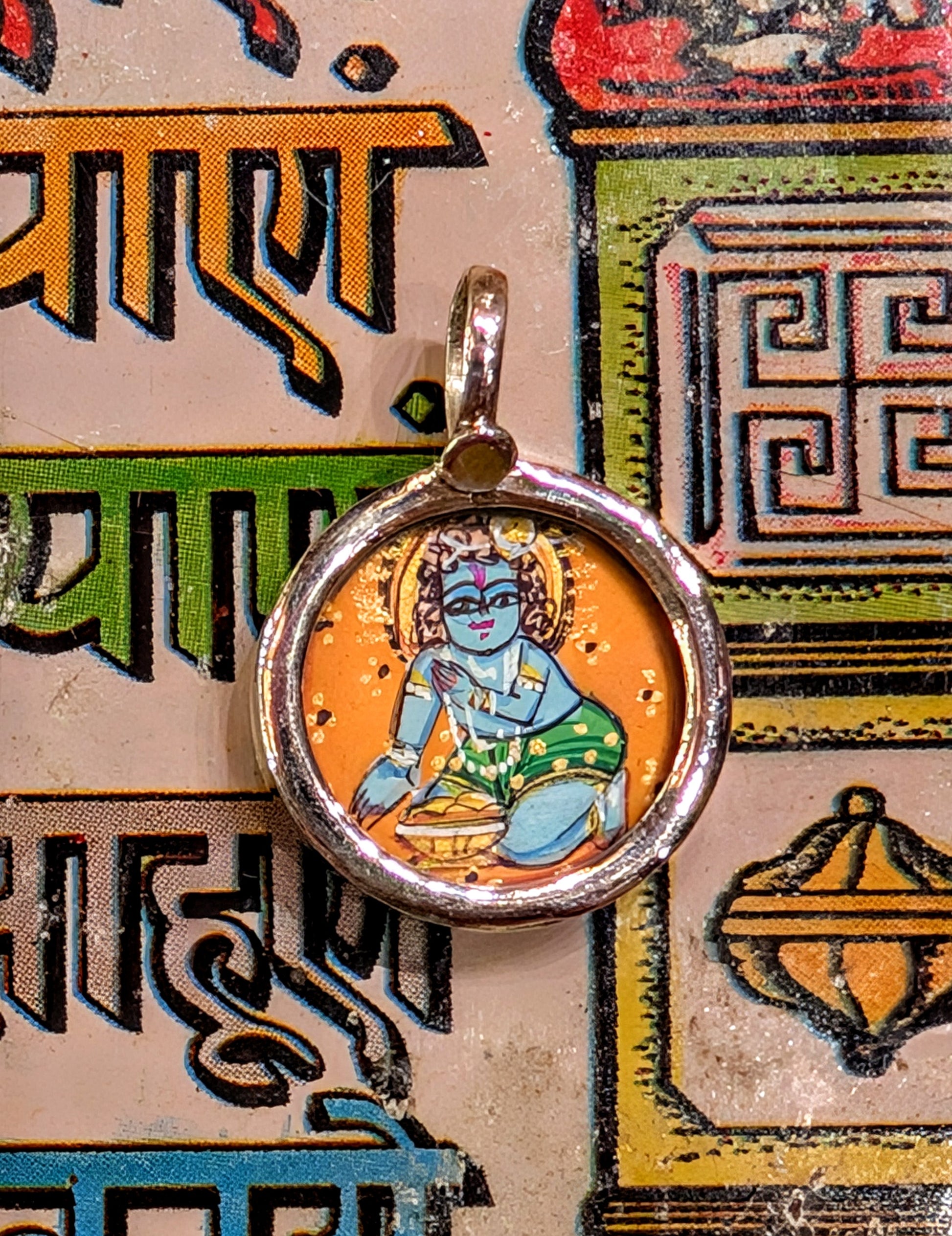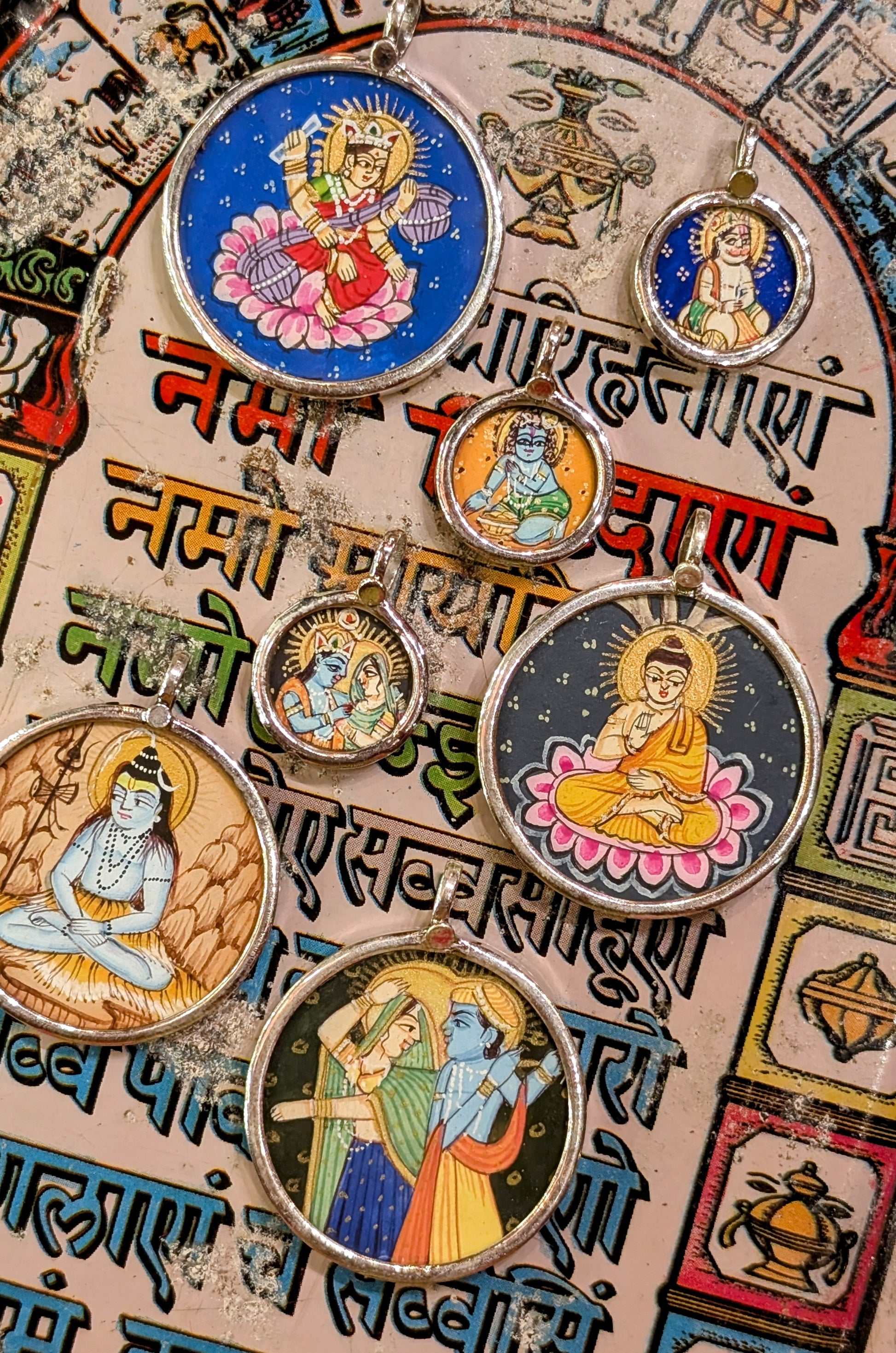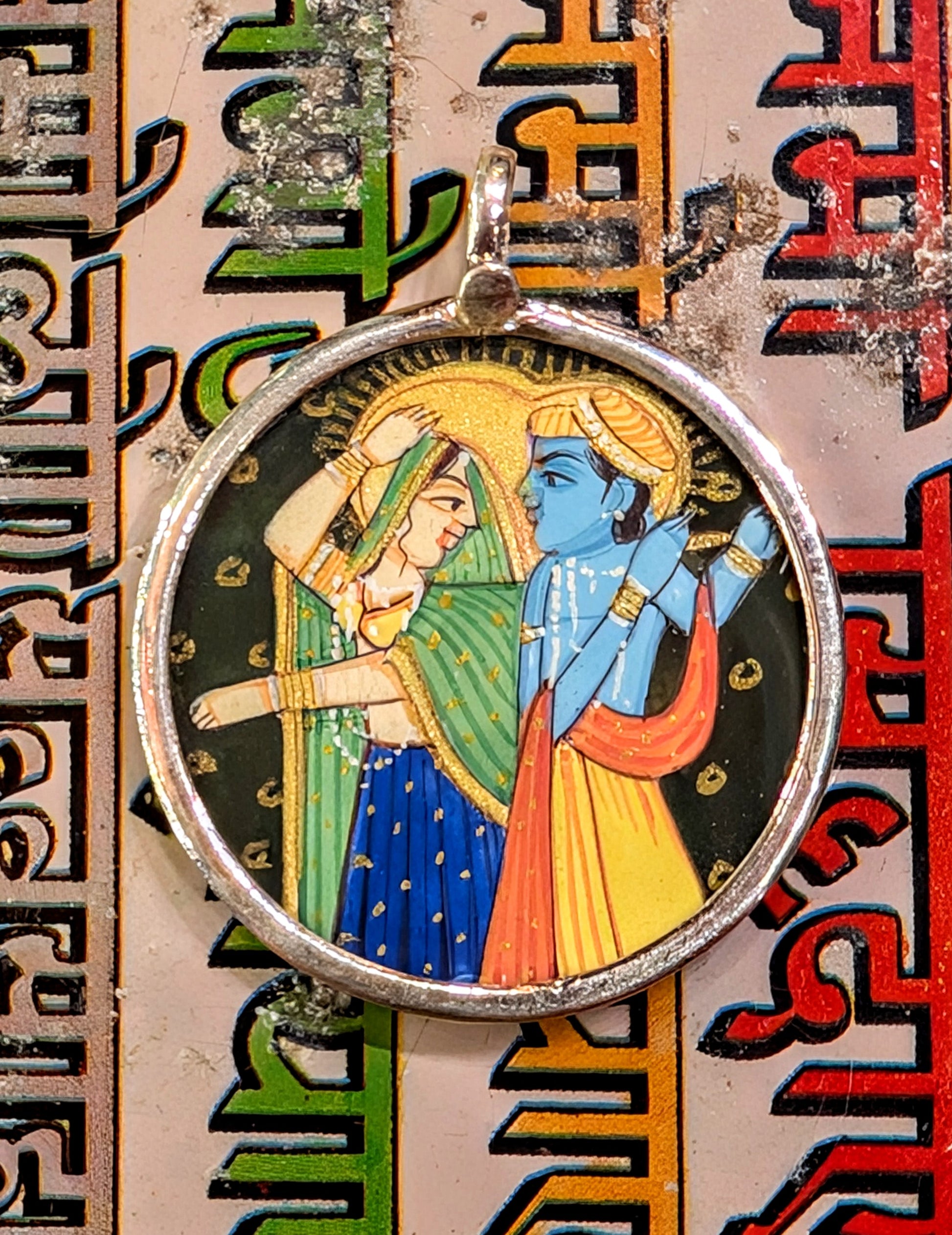 Made in Rajasthan, these pendants are crafted from sterling silver, glass and hand painted images on paper. The fine craftsmanship in these paintings is mind blowing, painting with single paint brush bristles!!!