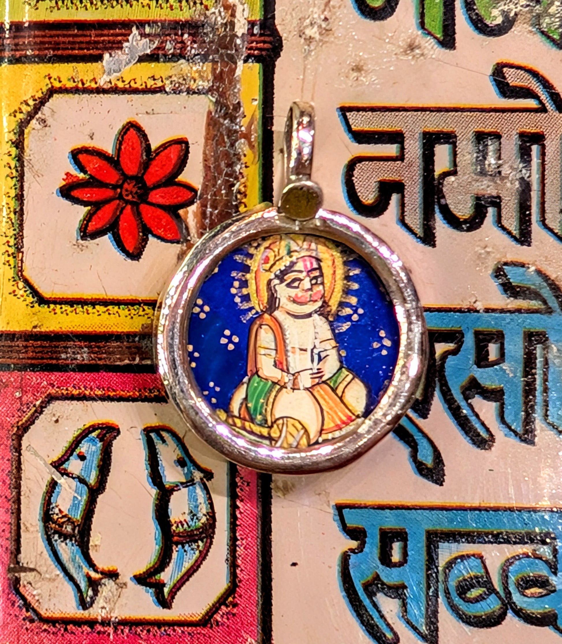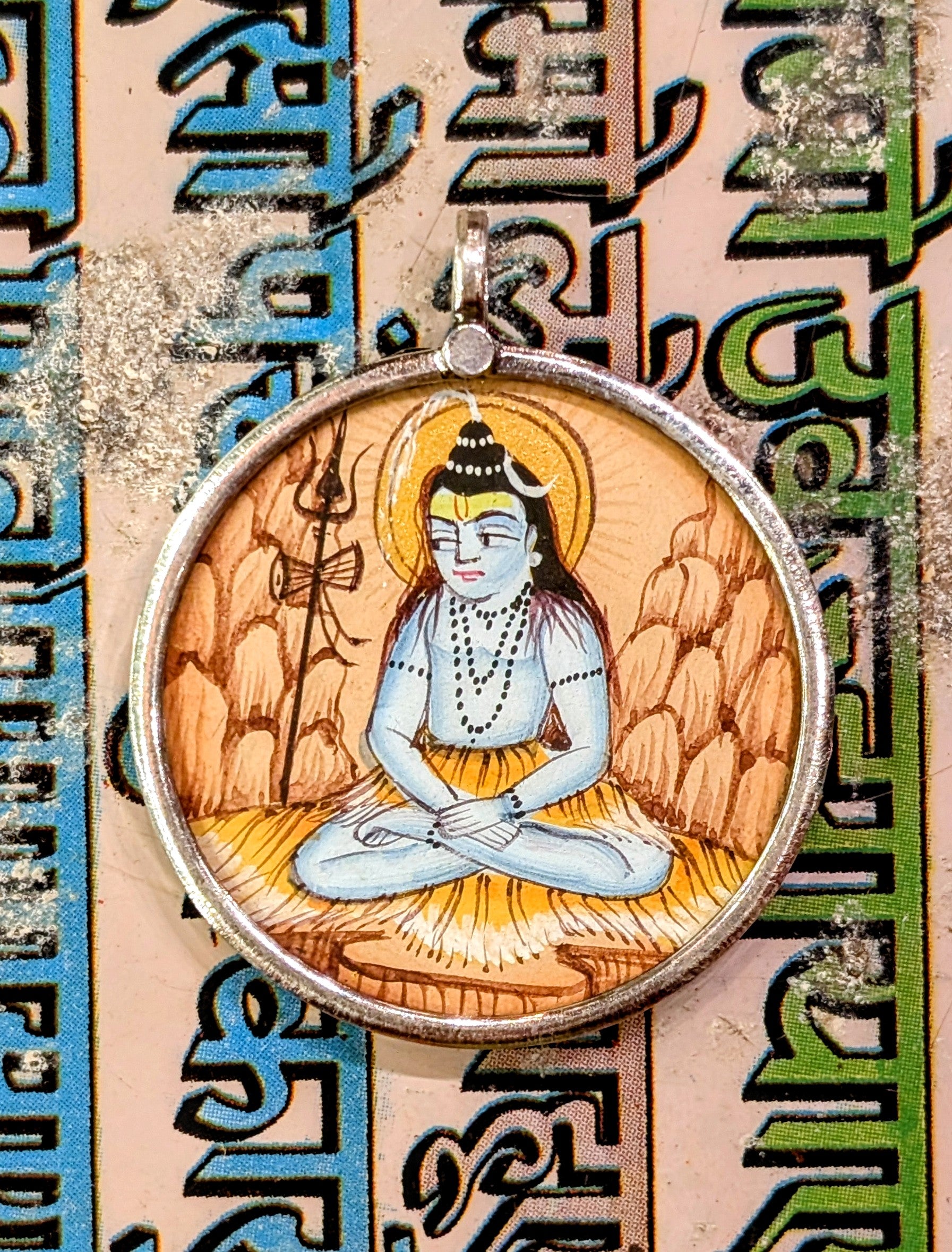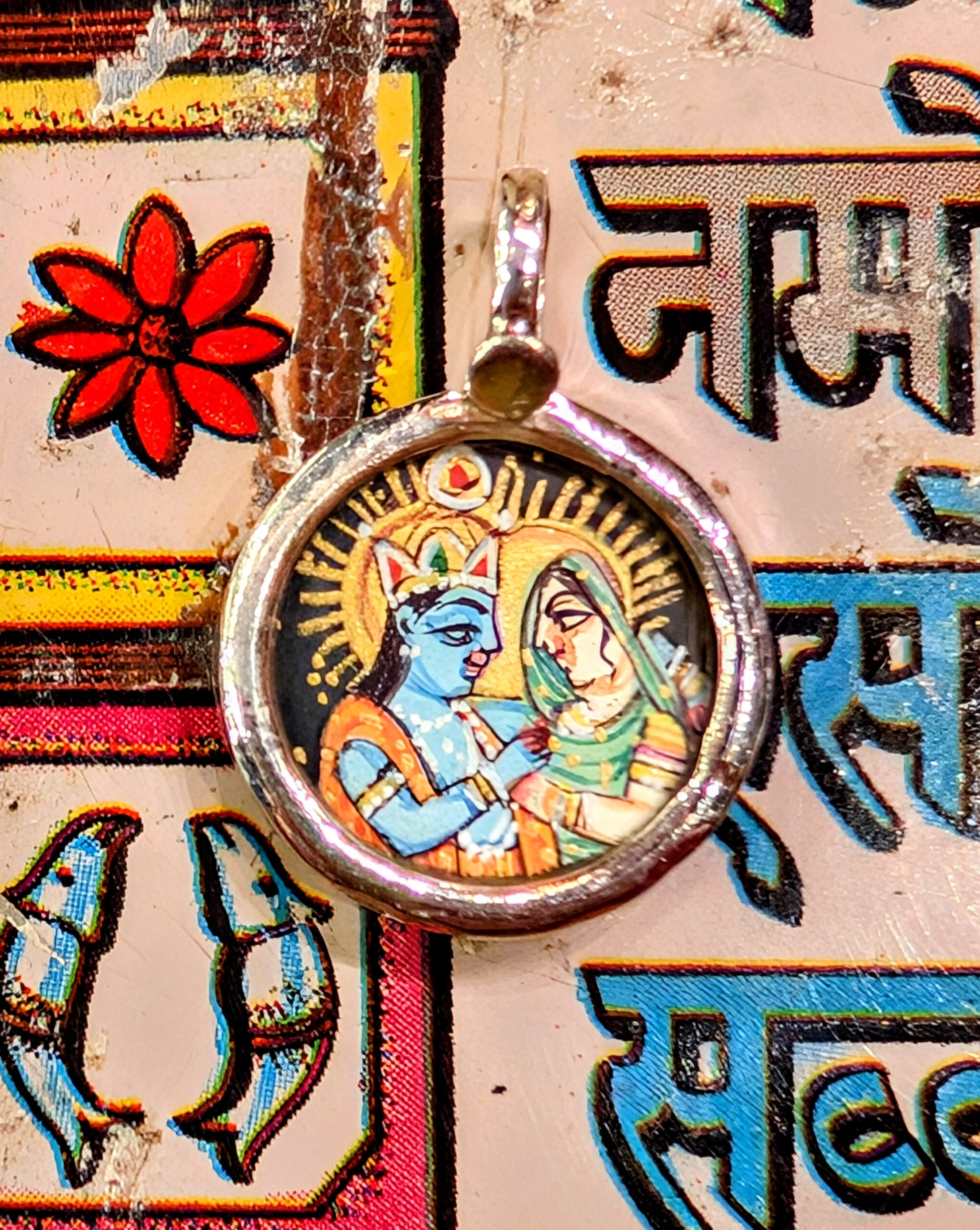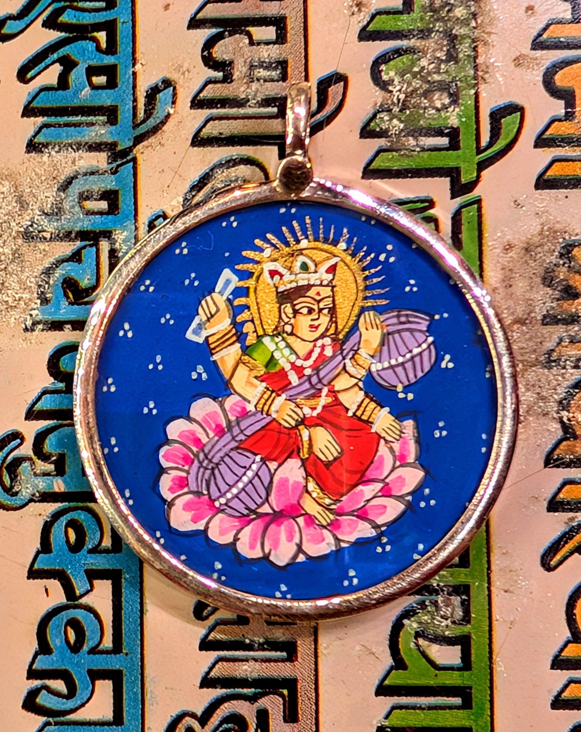 Made in Rajasthan, these pendants are crafted from sterling silver, glass and hand painted images on paper. The fine craftsmanship in these paintings is mind blowing, painting with single paint brush bristles!!!
