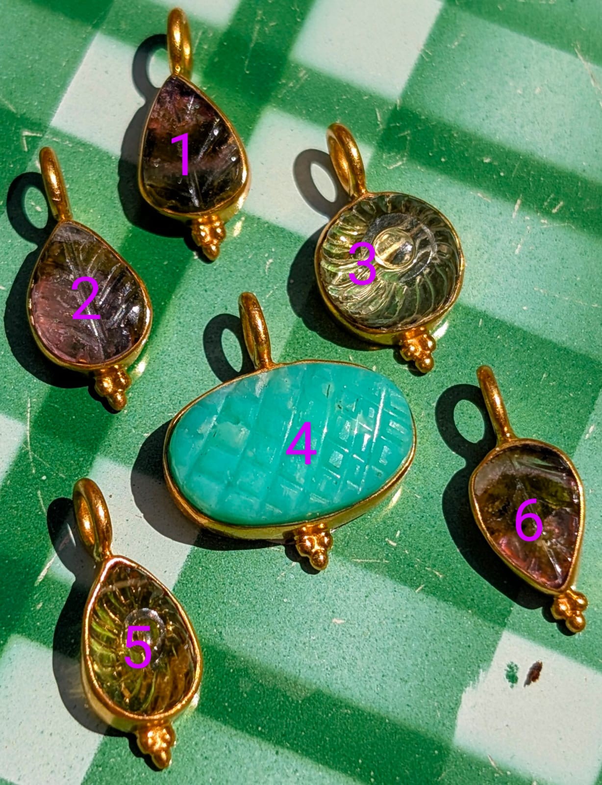 A gorgeous selection of hand carved stones we collected in Jaipur, Rajasthan, all set in fancy silver bezel or bobbles, and gold plated in pure , butter yellow Indian gold to make loveliest pendants, something for everyone!!