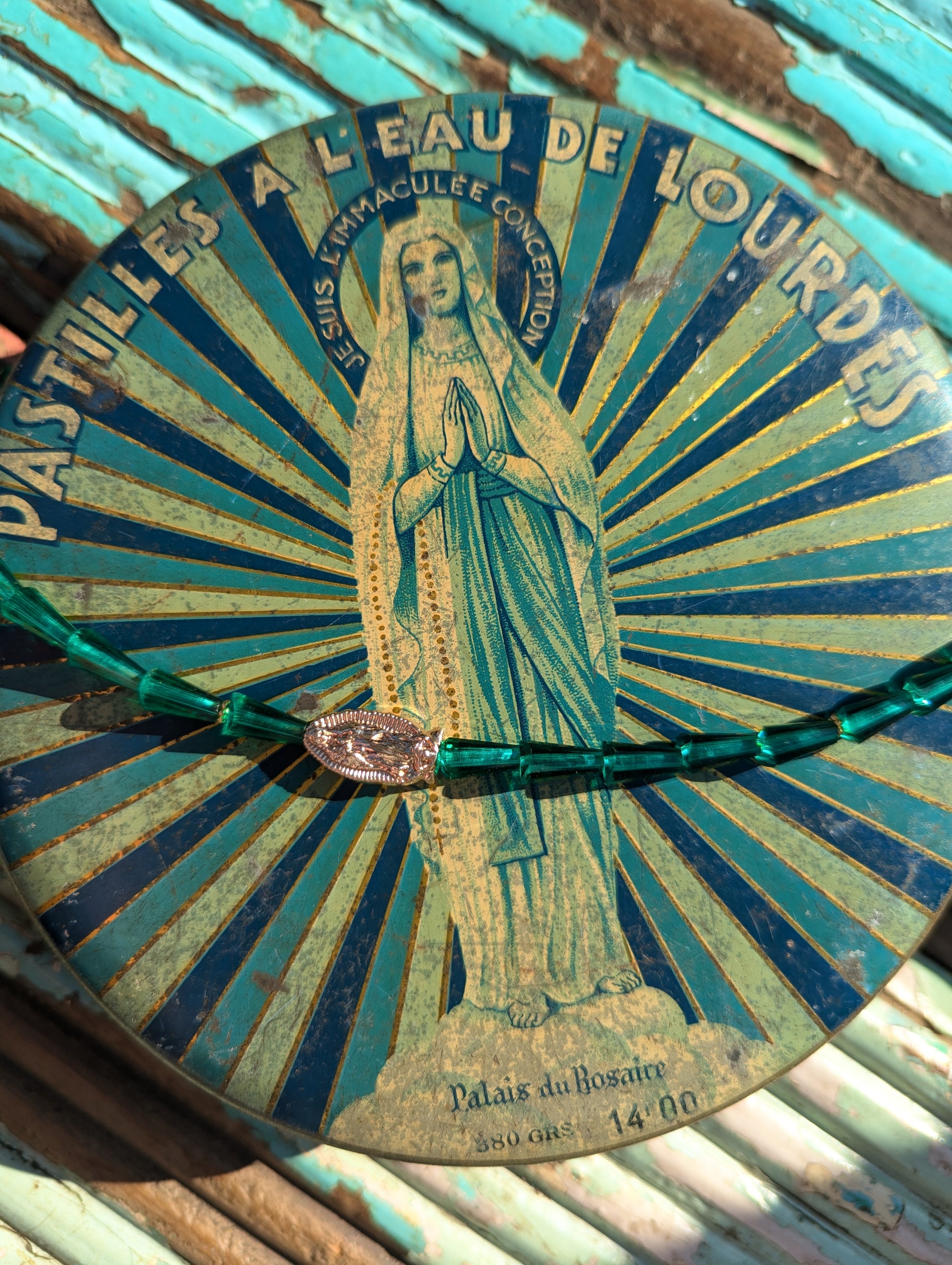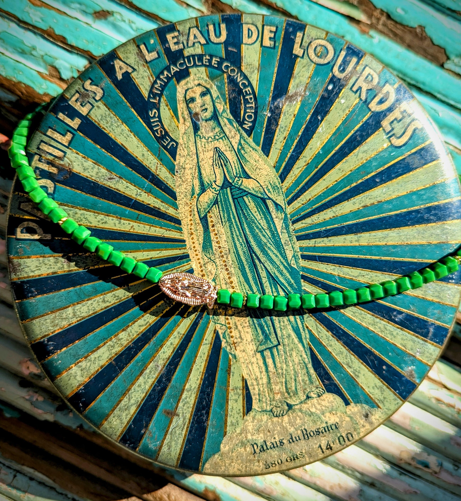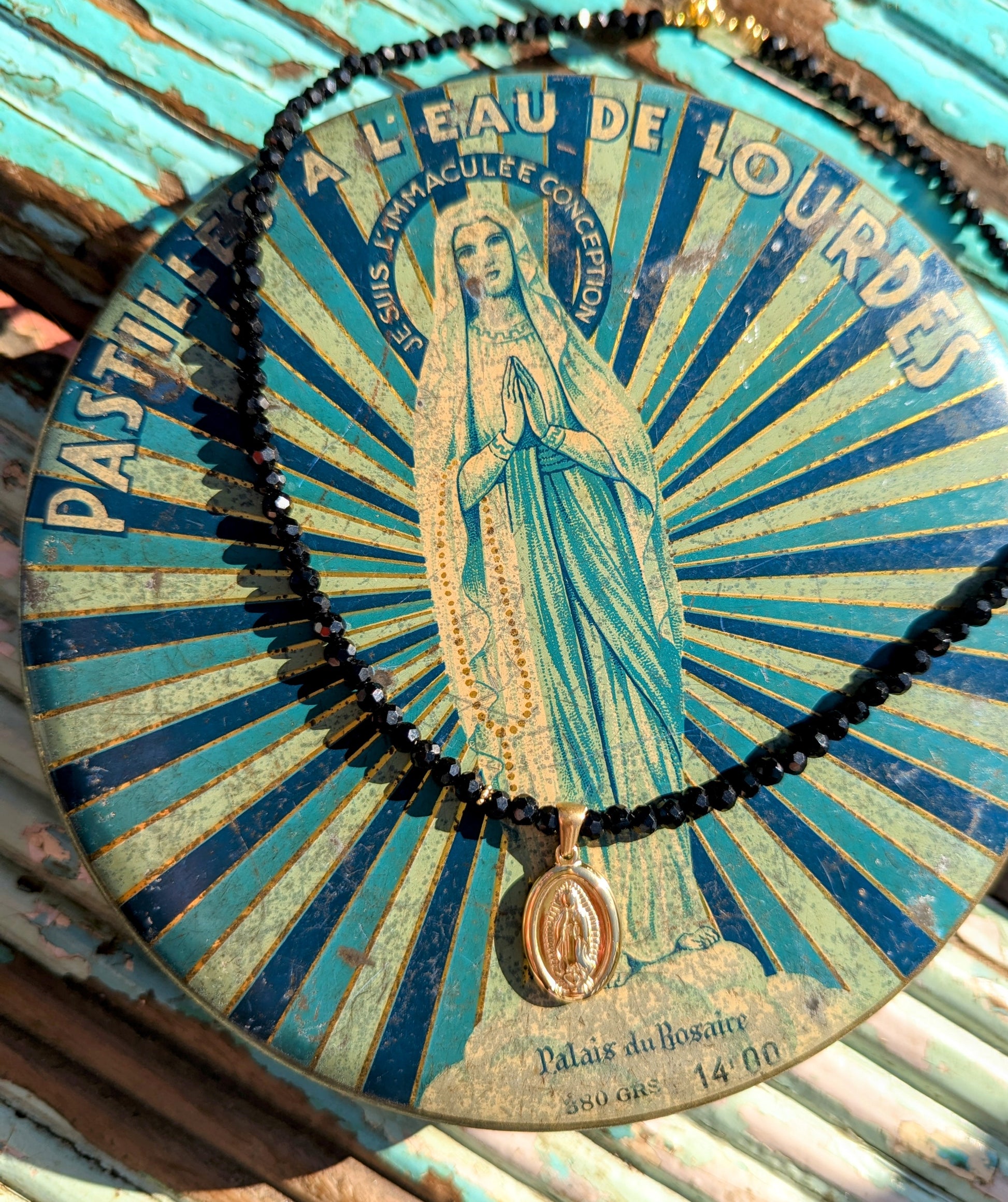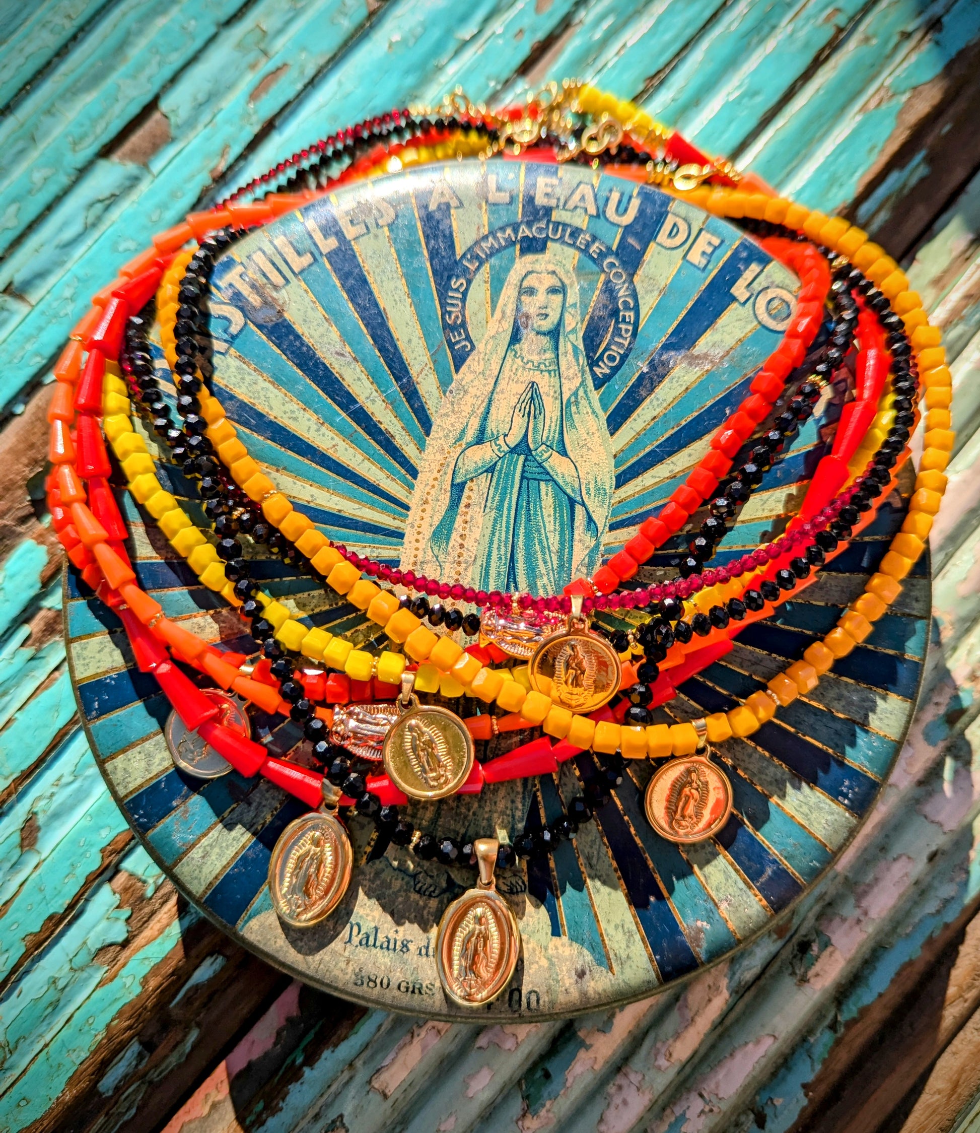 Mexican Virgin quality kitsch!!! A selection of Blackout made, hand faceted crystal necklaces with gorgeous gold Guadalupe pendants, all slightly different lengths, pendants and beads, so look great mixed up together too!!