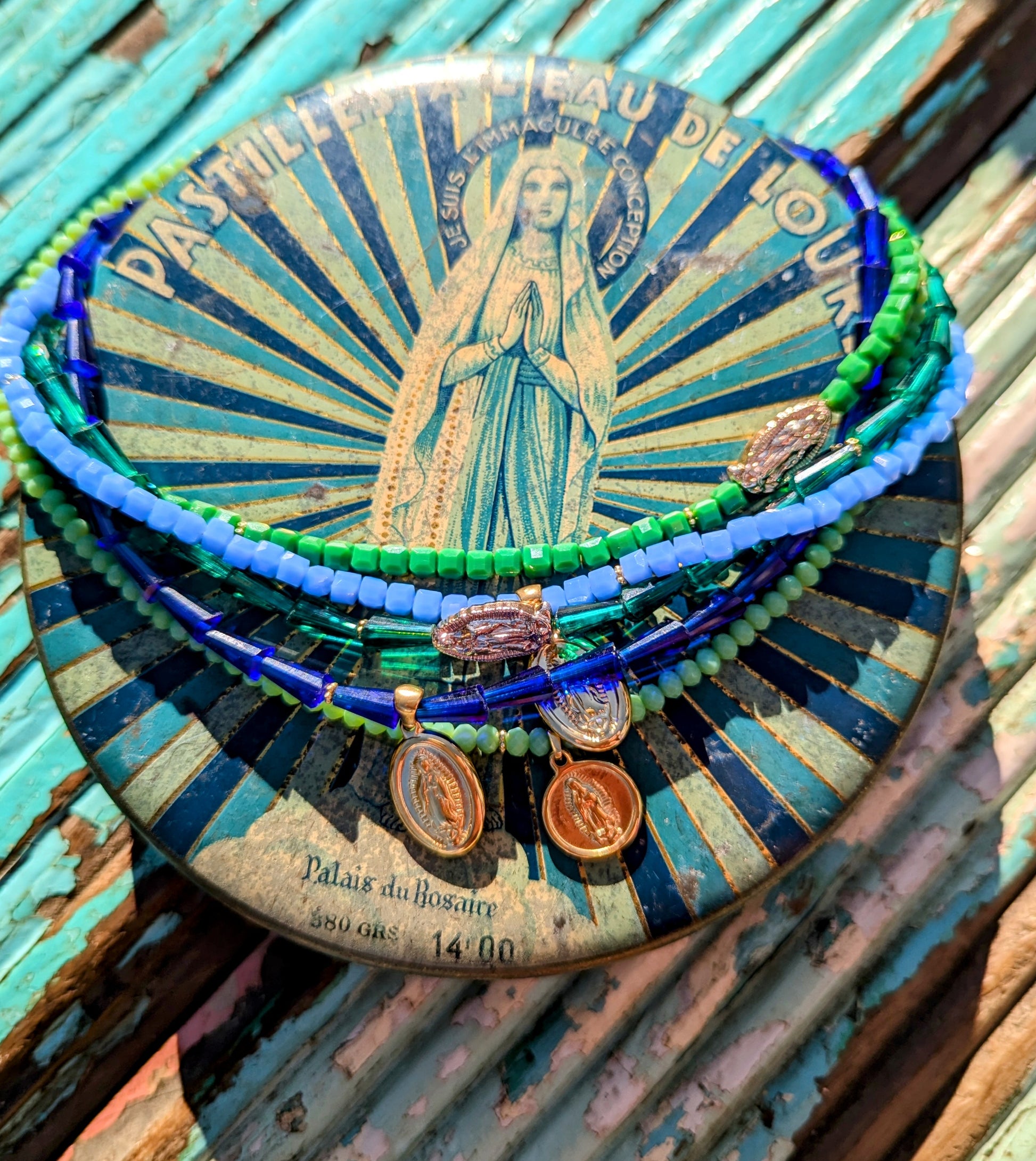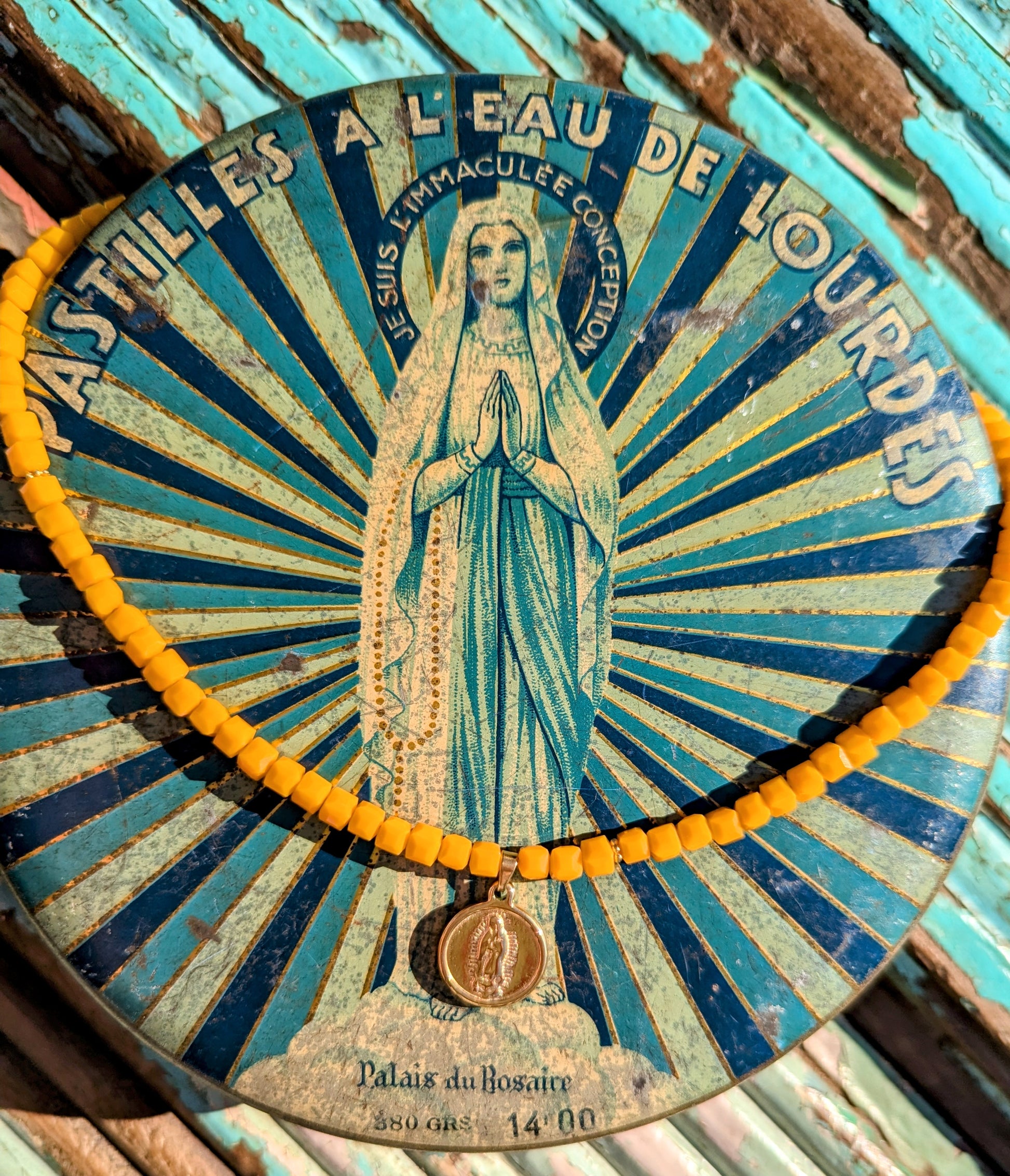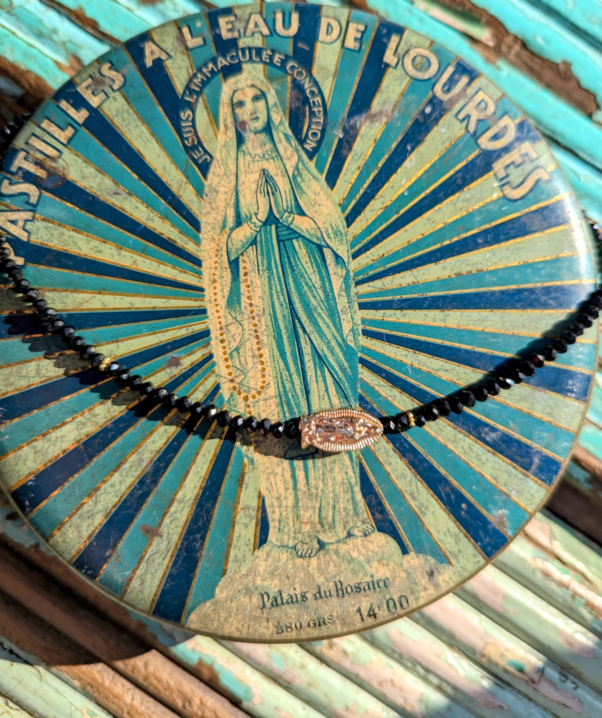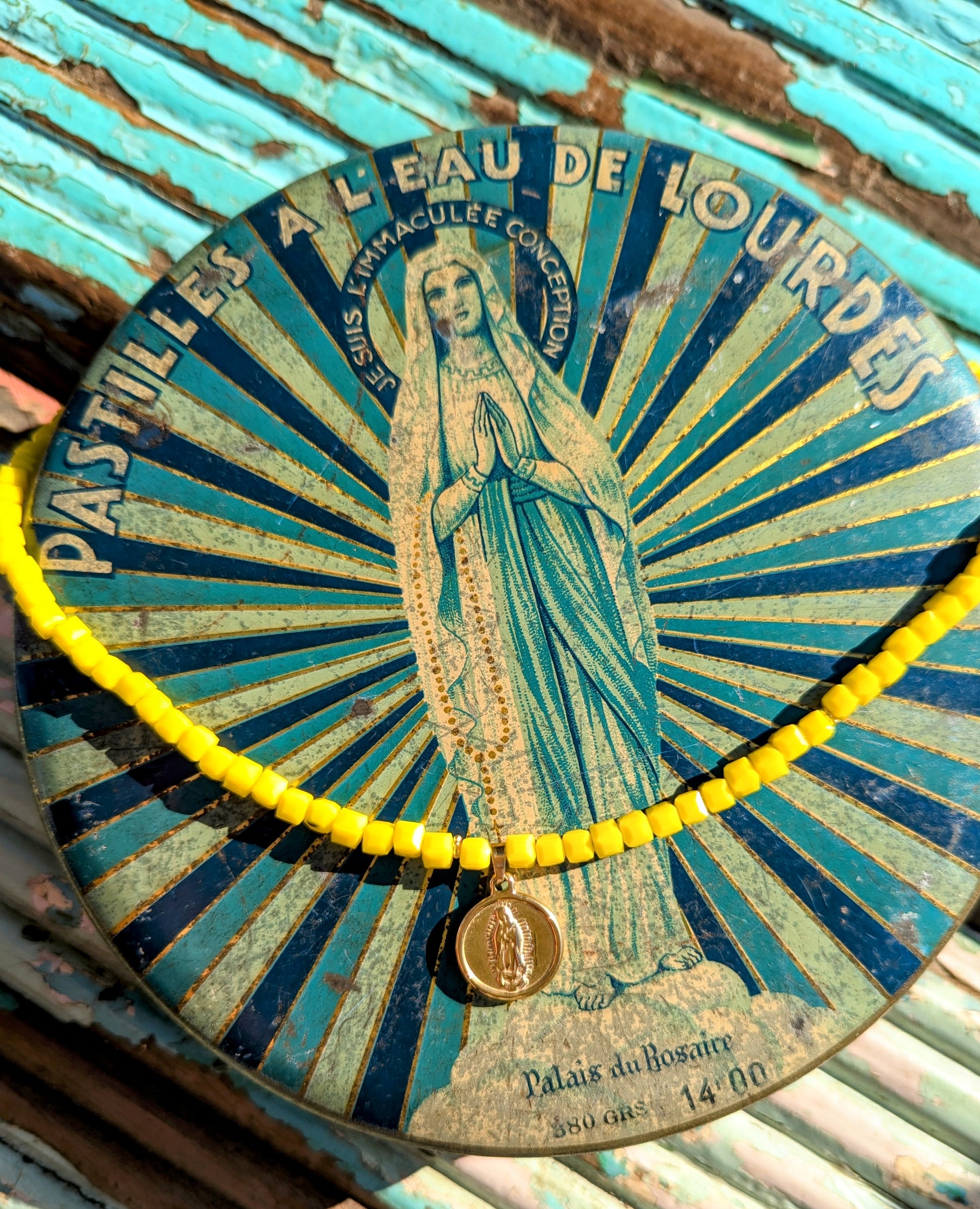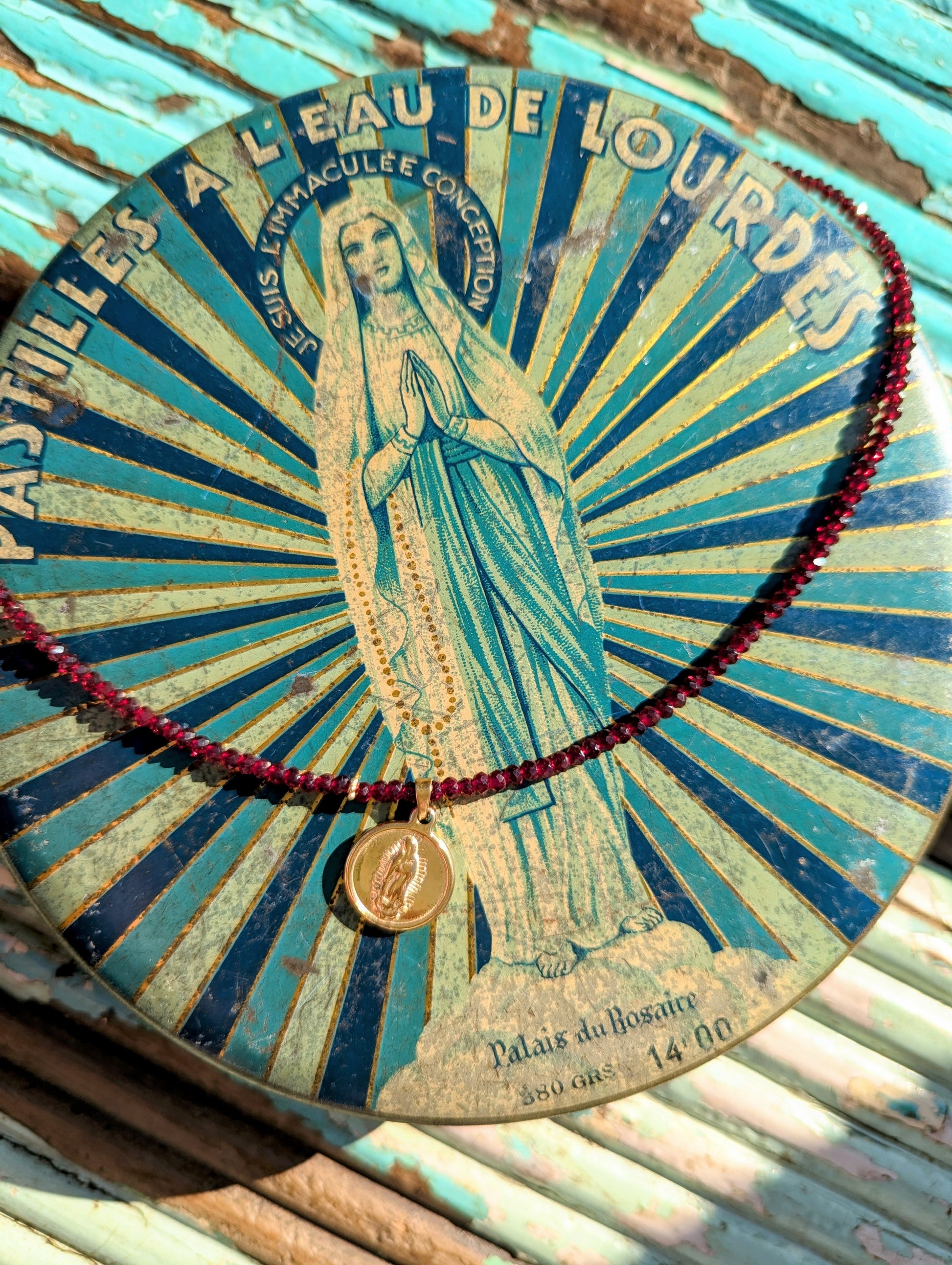 Mexican Virgin quality kitsch!!! A selection of Blackout made, hand faceted crystal necklaces with gorgeous gold Guadalupe pendants, all slightly different lengths, pendants and beads, so look great mixed up together too!!