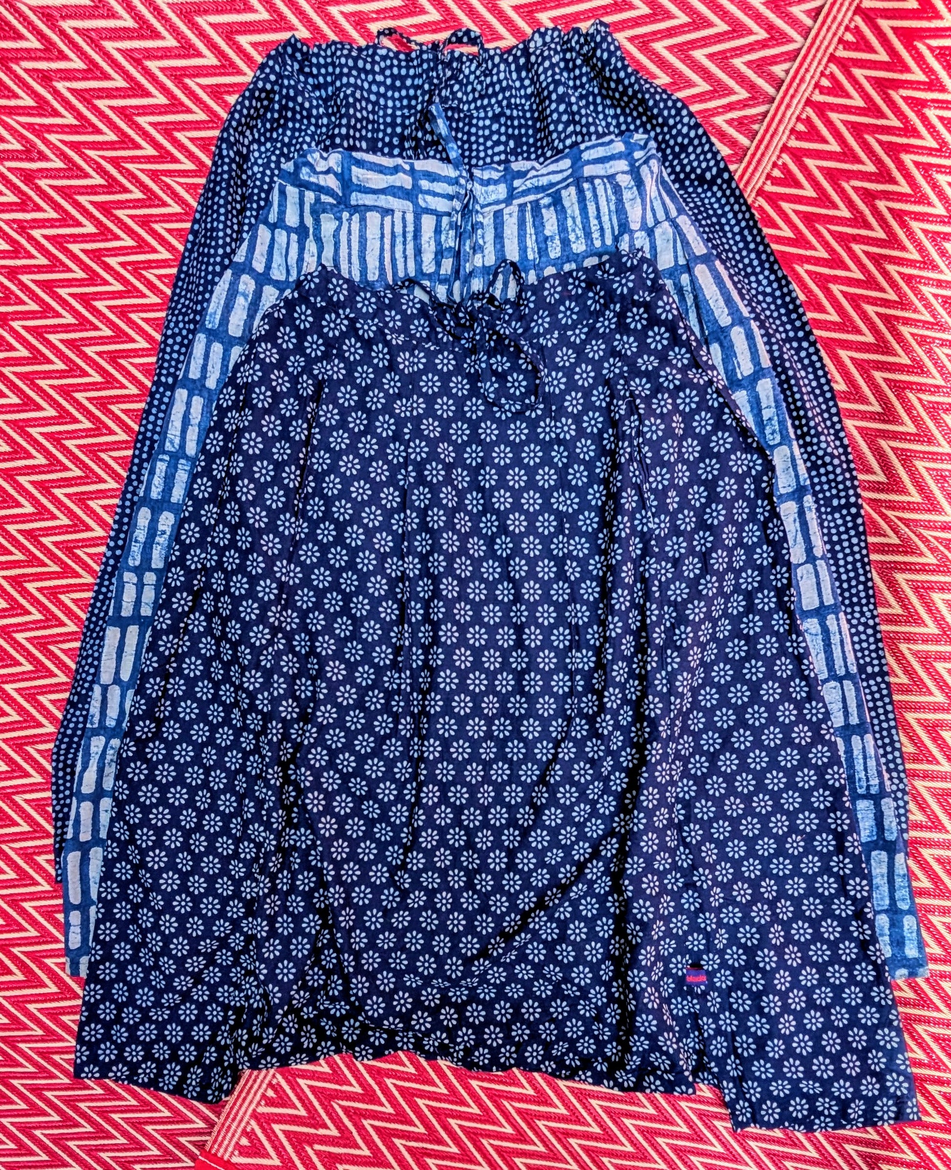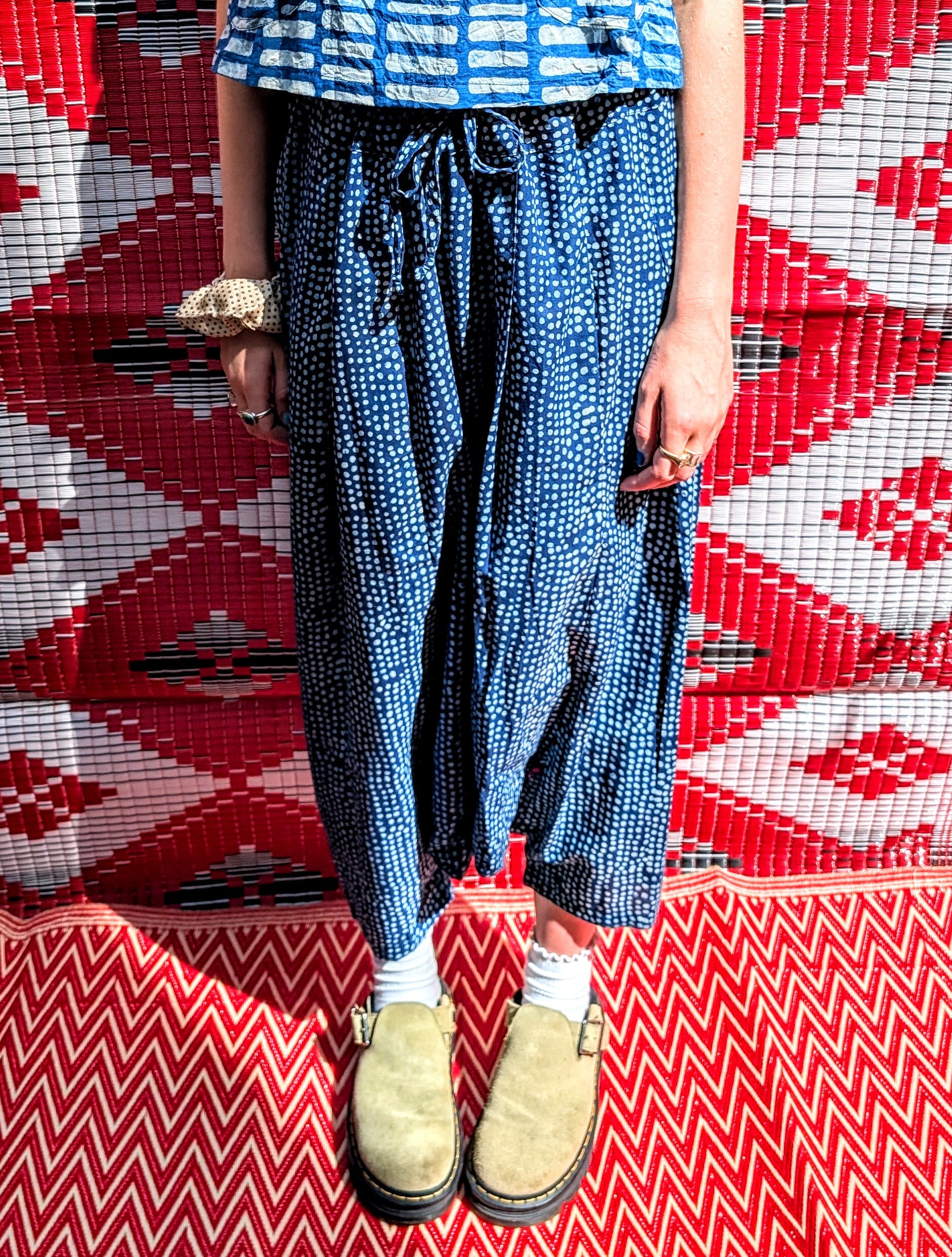 These super light and comfy harem pants are made with hand block printed fabrics are handmade in India, blockprinted with clay and resist dyed in natural indigo.