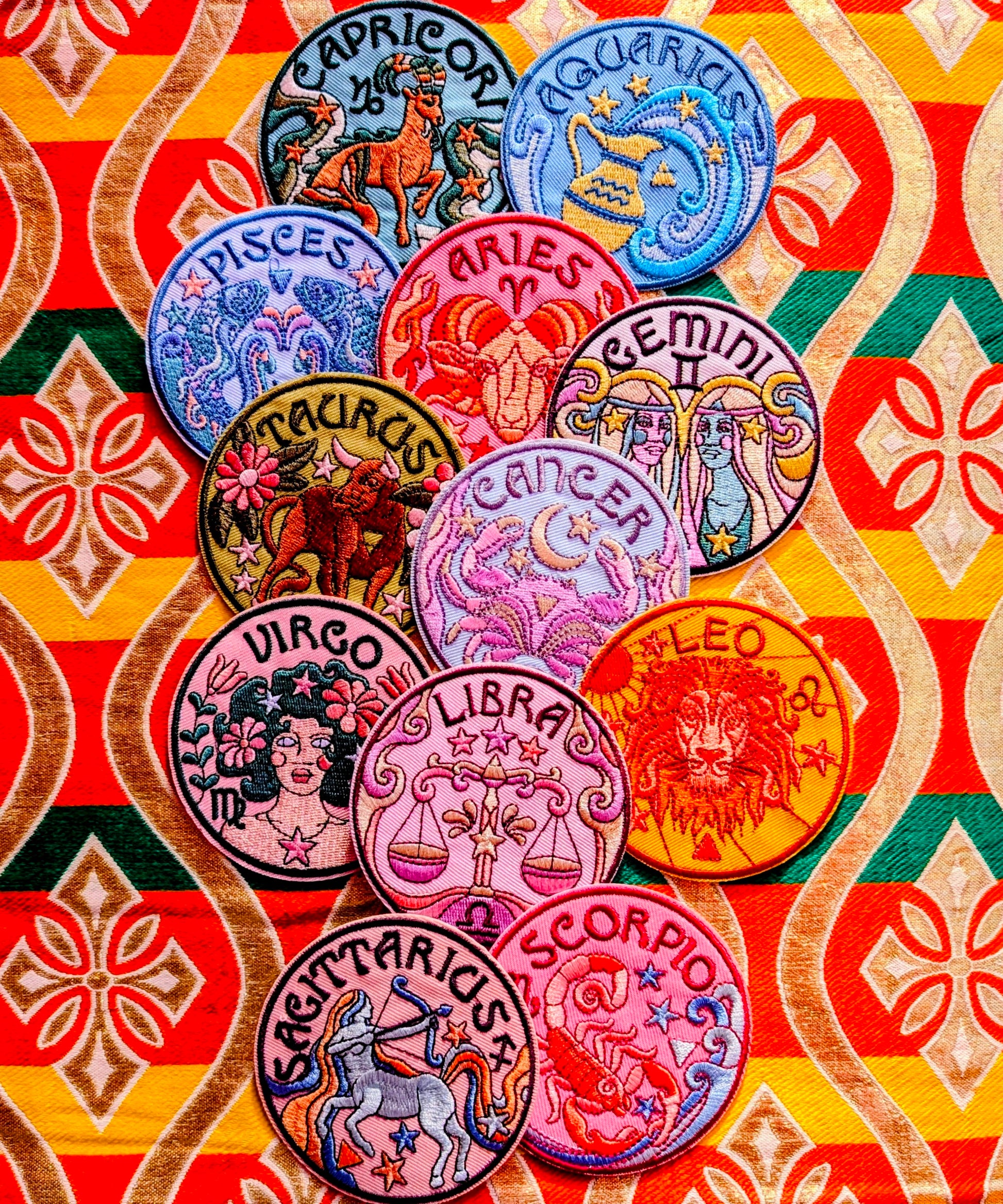 Super seventies style Horoscope embroidery patches that are even iron on, for minimum fuss!