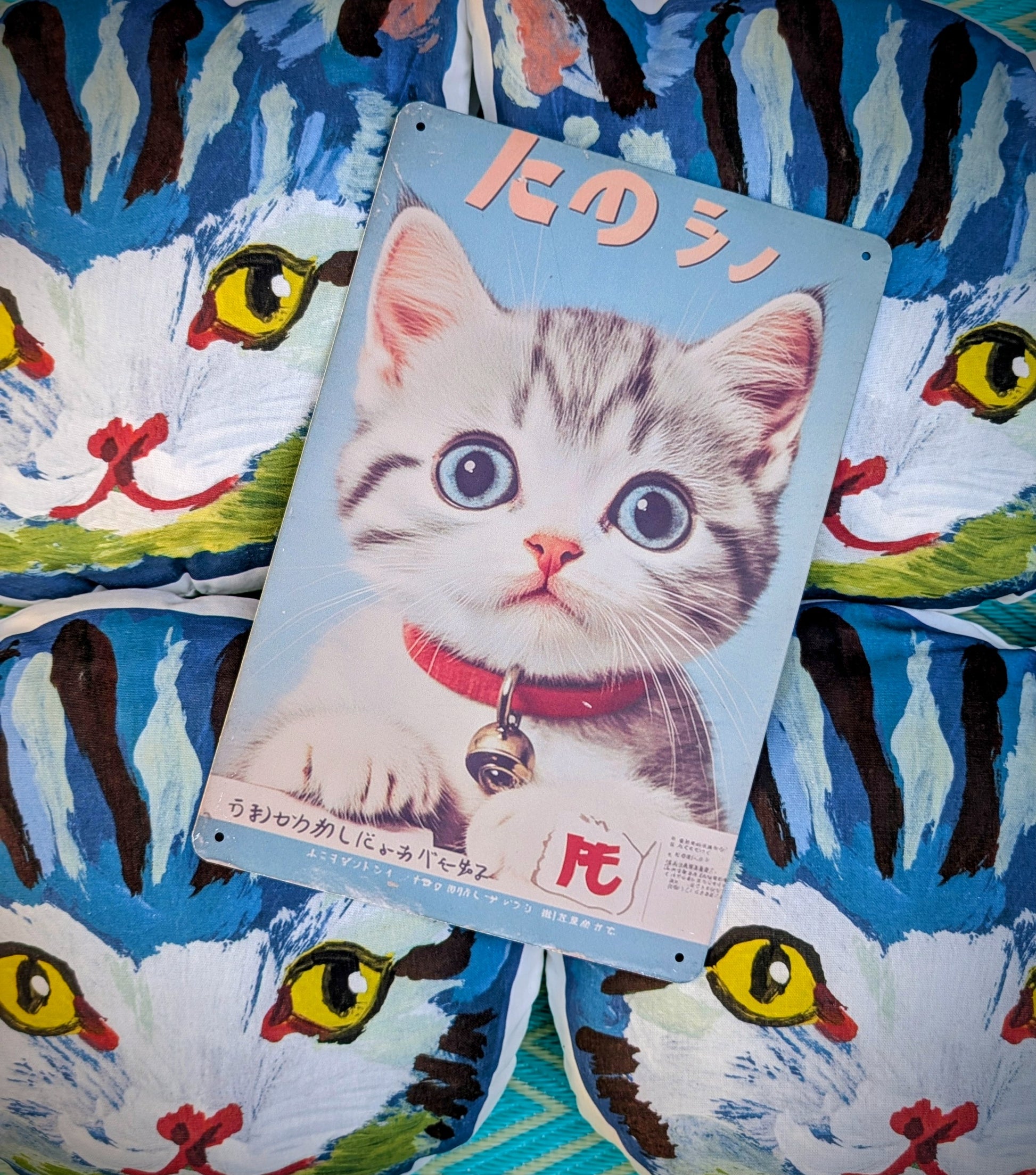 The absolute cutest kitten, a vintage Japanese advert on a tin sign!