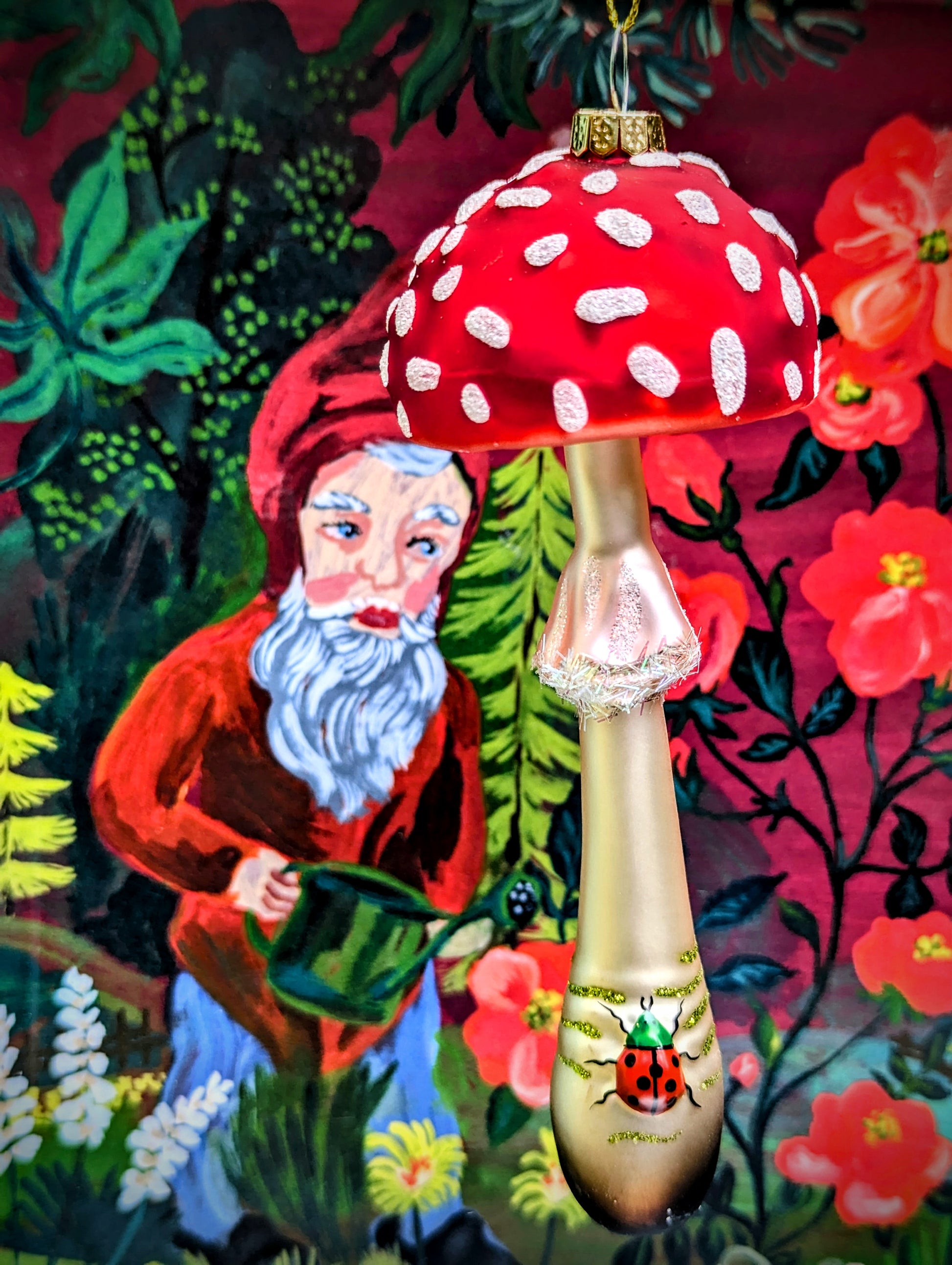 Sweetest ladybug adorned tall toadstool for a fairytale Christmas!