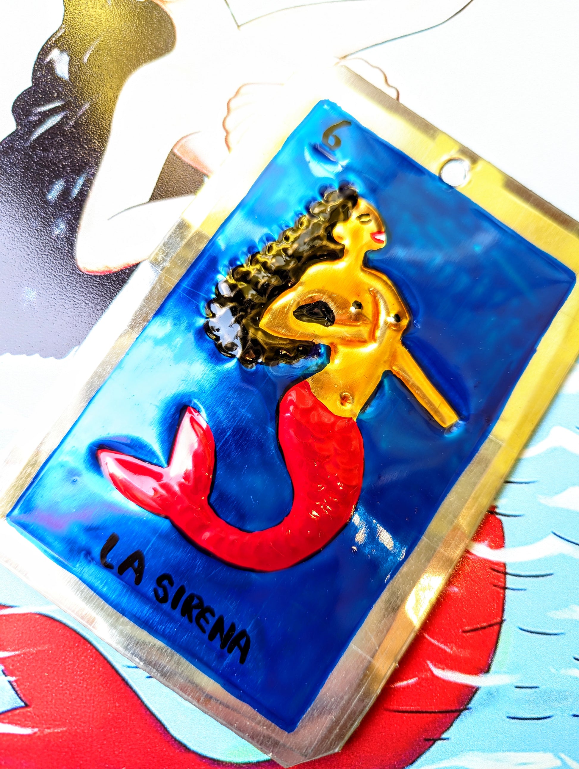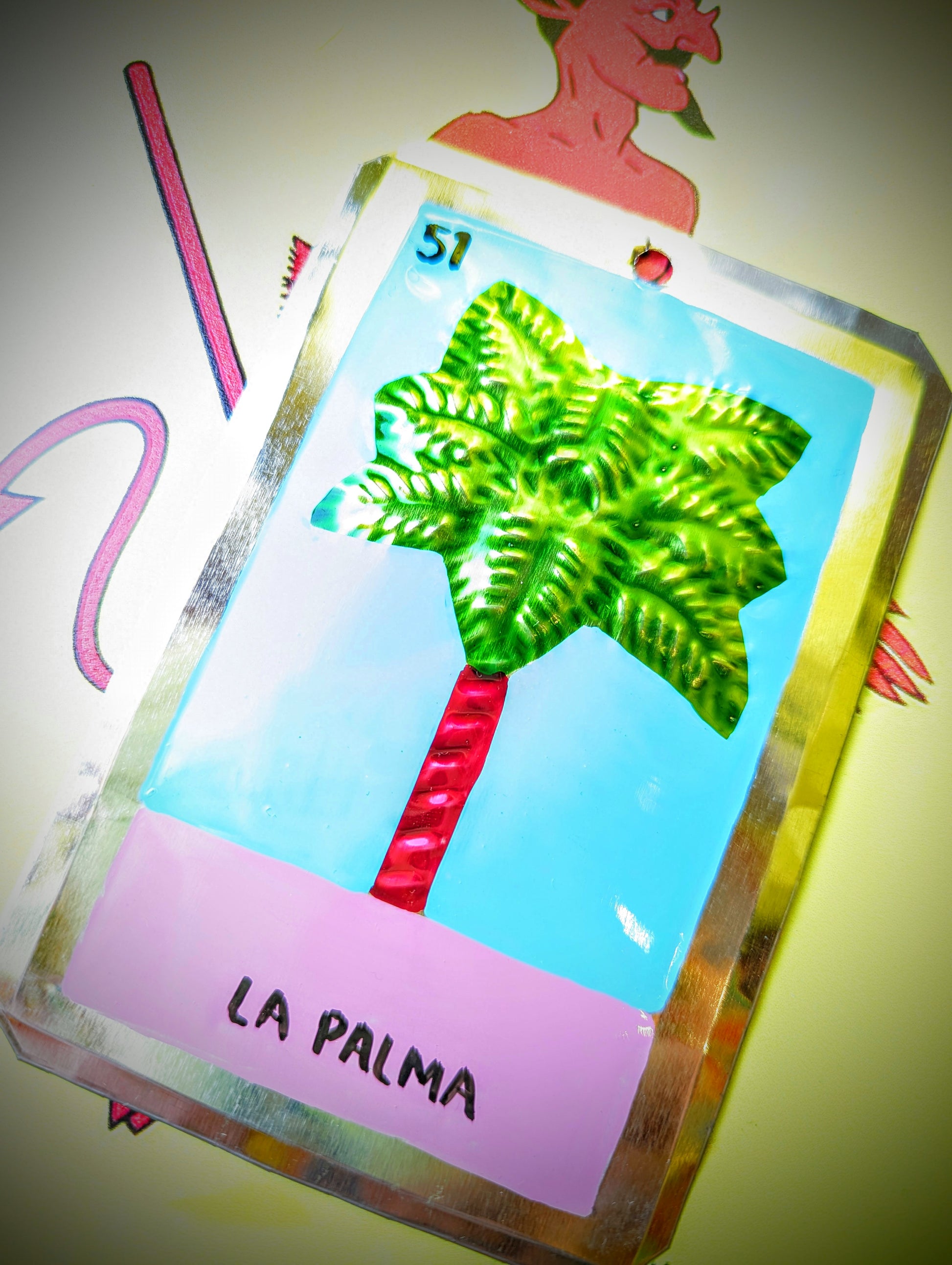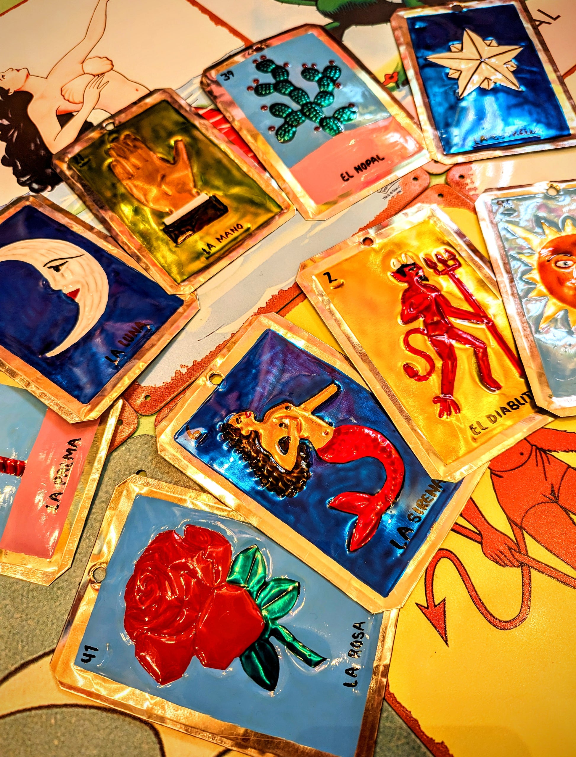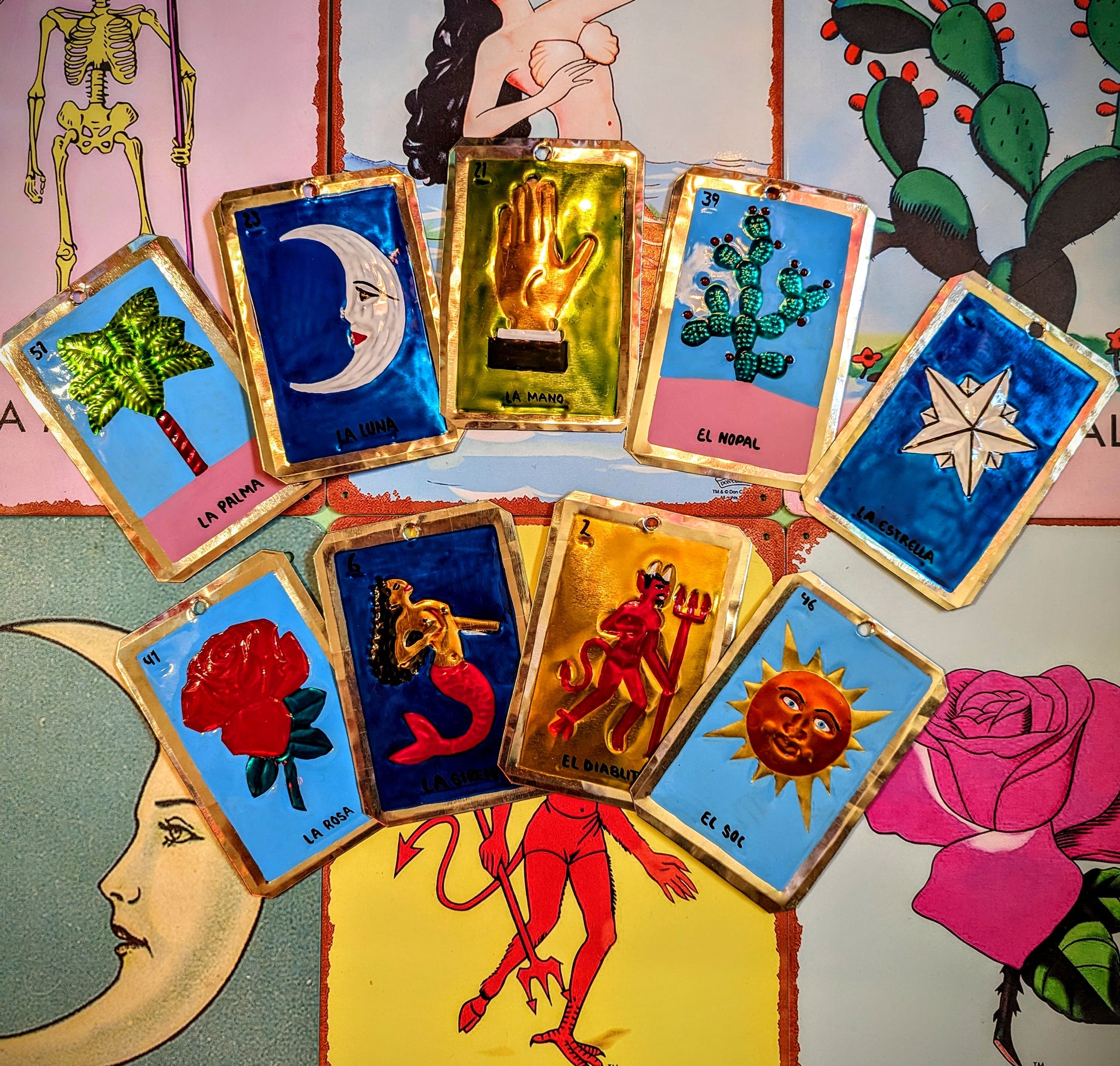 Fabulous shiny handmade tin plaques made by the tin artisans of Oaxaca in Mexico. Designs taken from the vintage Mexican Loteria game and hung to bring luck and fulfill wishes!