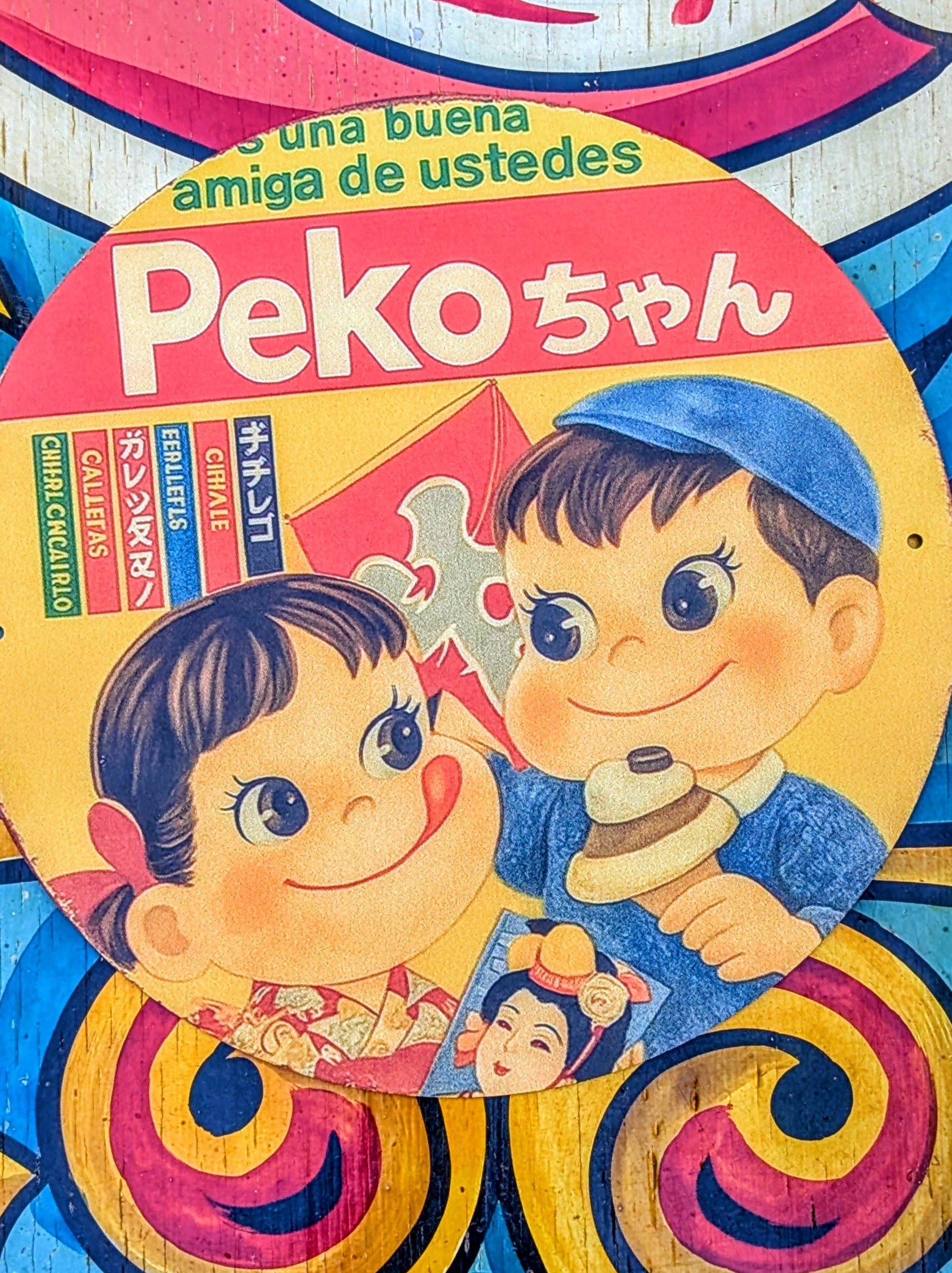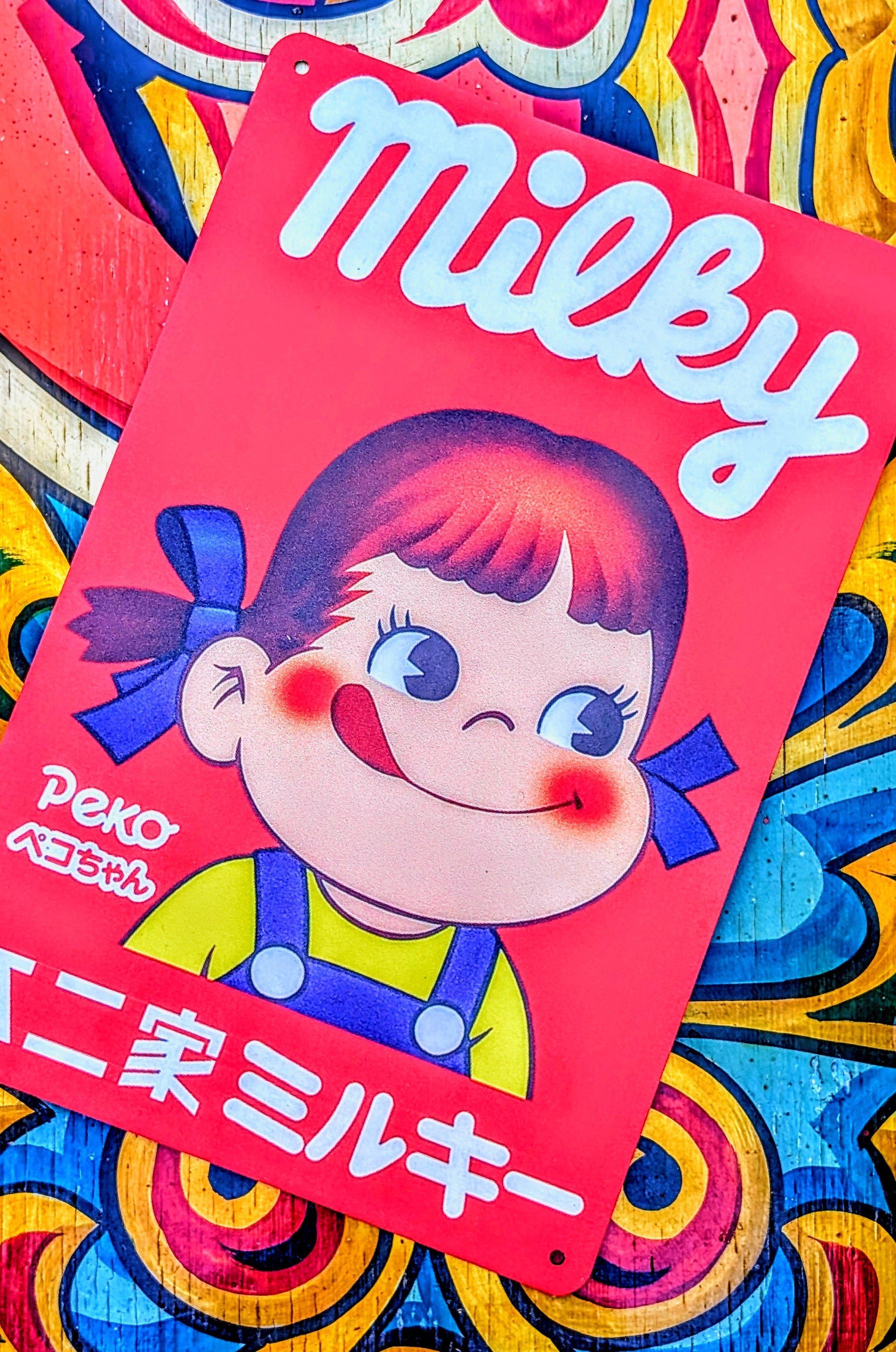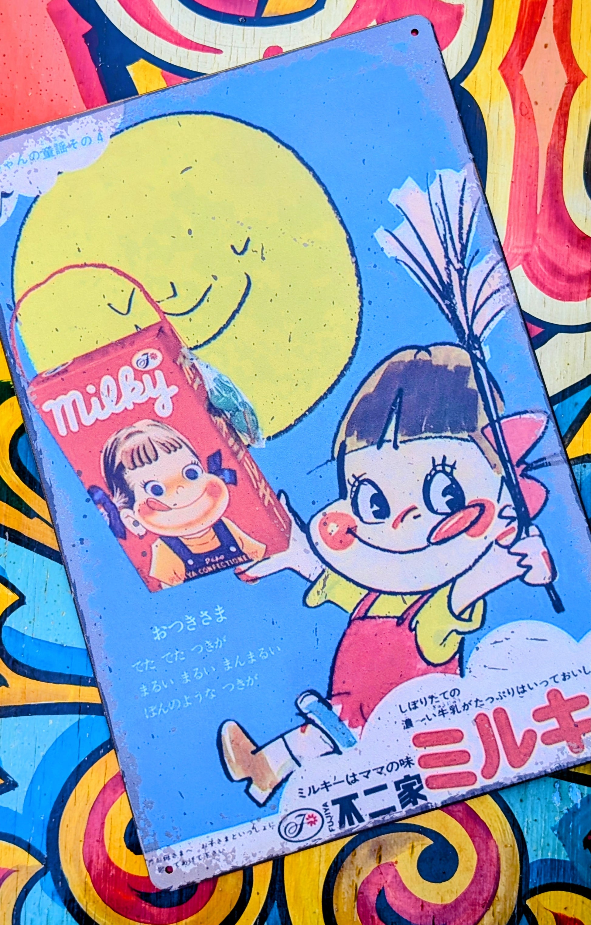 Japan's best vintage Peko Milky sweets advertising graphics printed on a tin sign!, what fantastic cheeky faces those kids have got!!