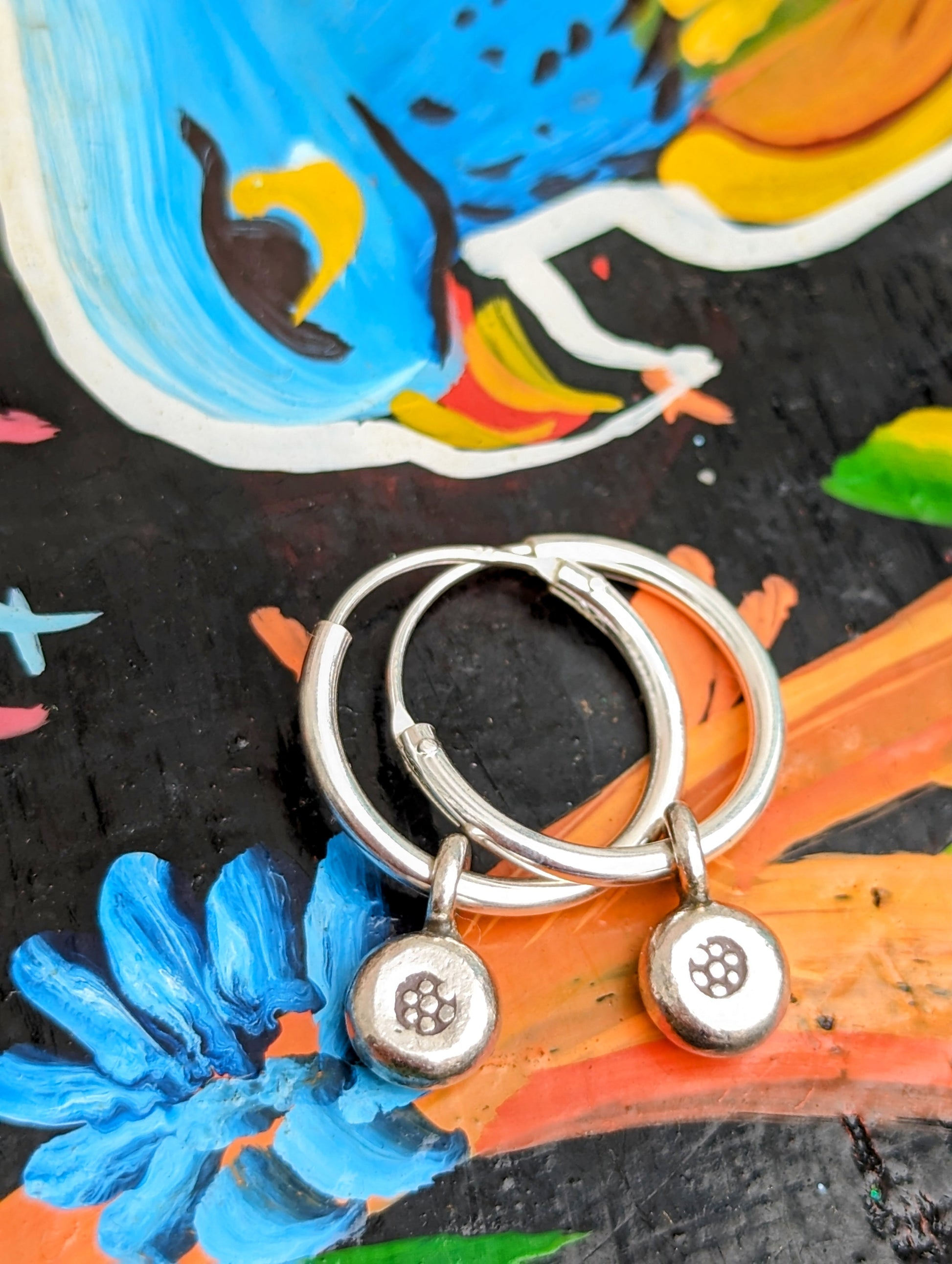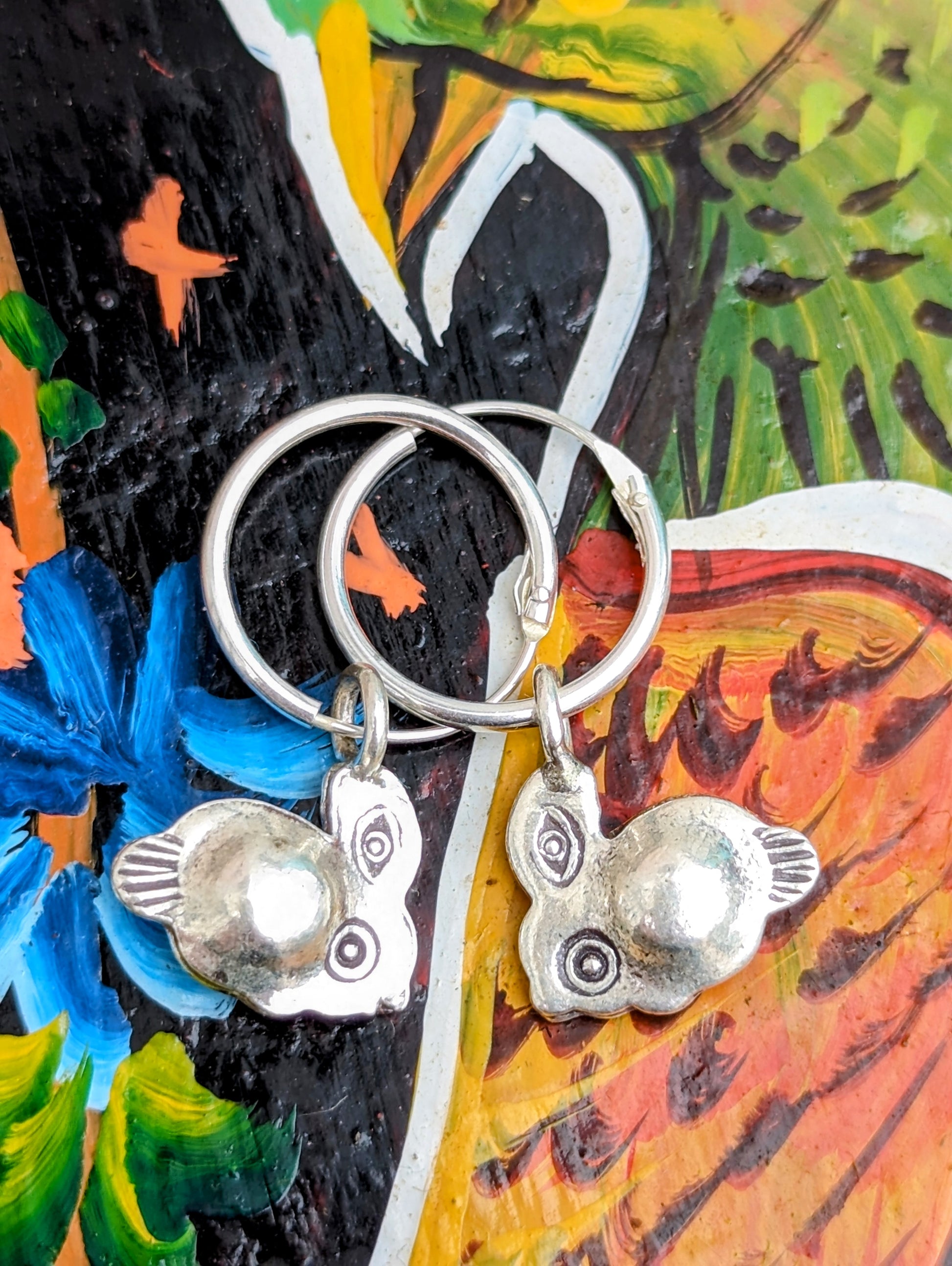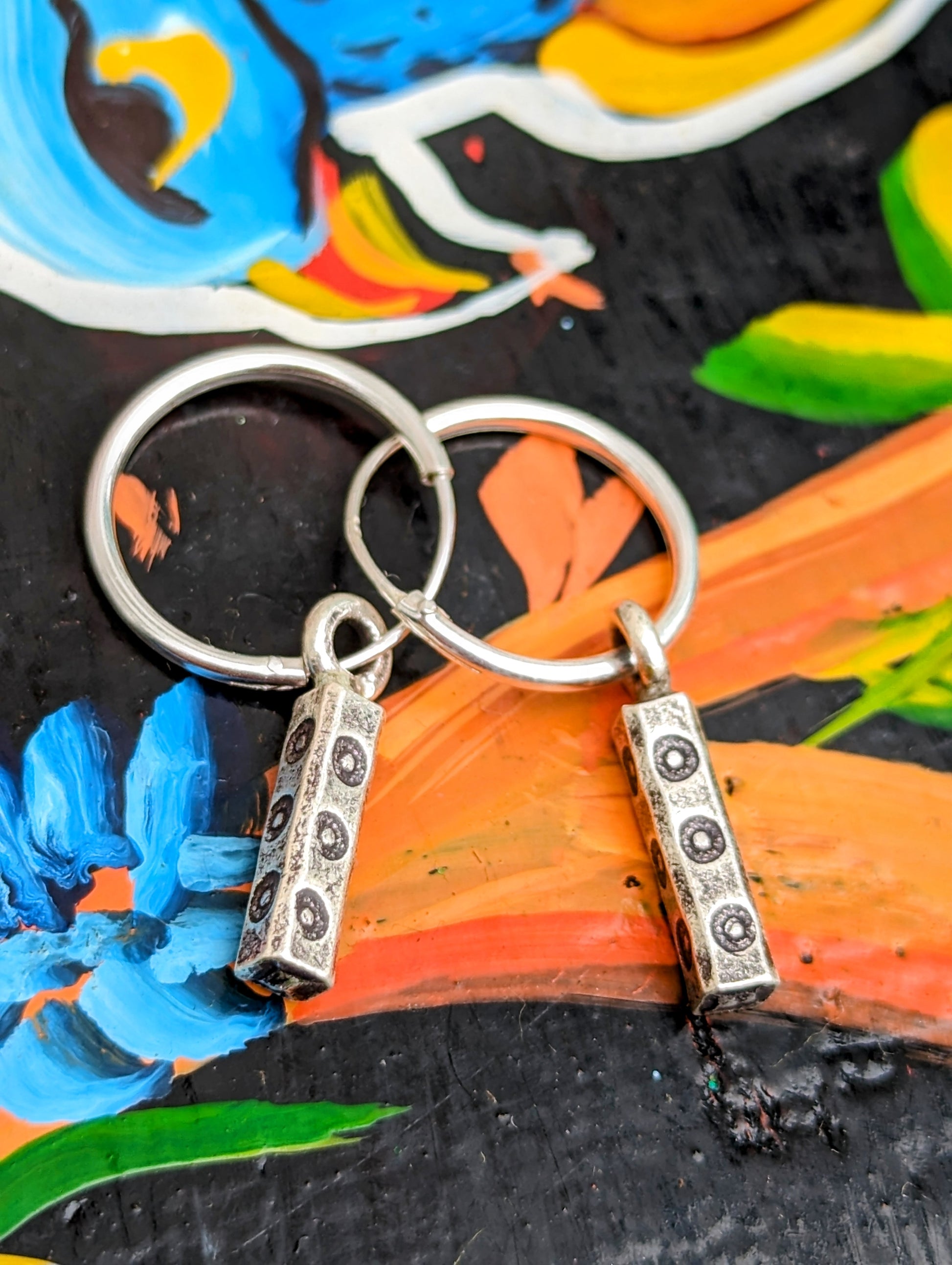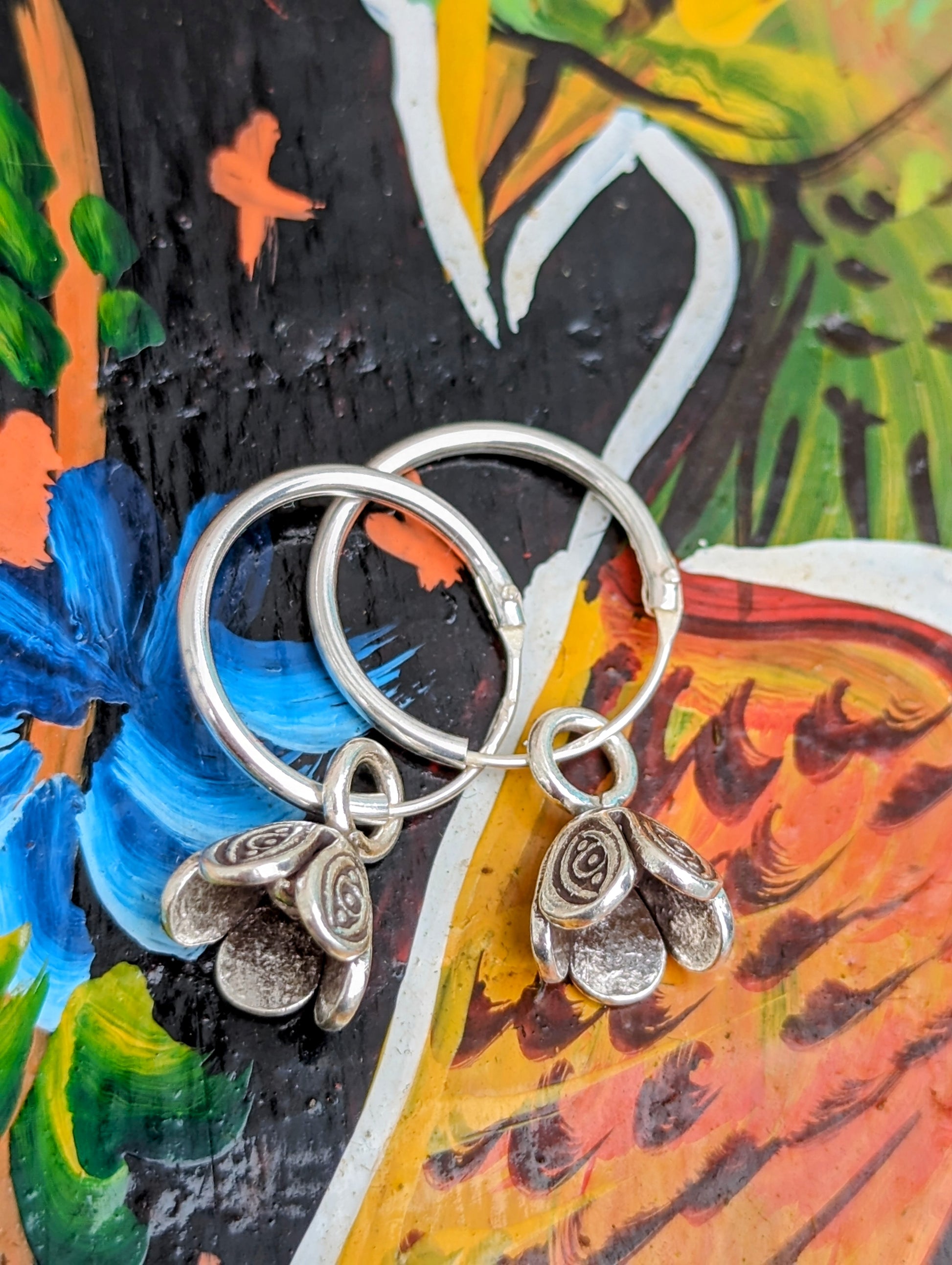 Handmade Burmese Karen tribe charms on sterling silver hoop earrings.