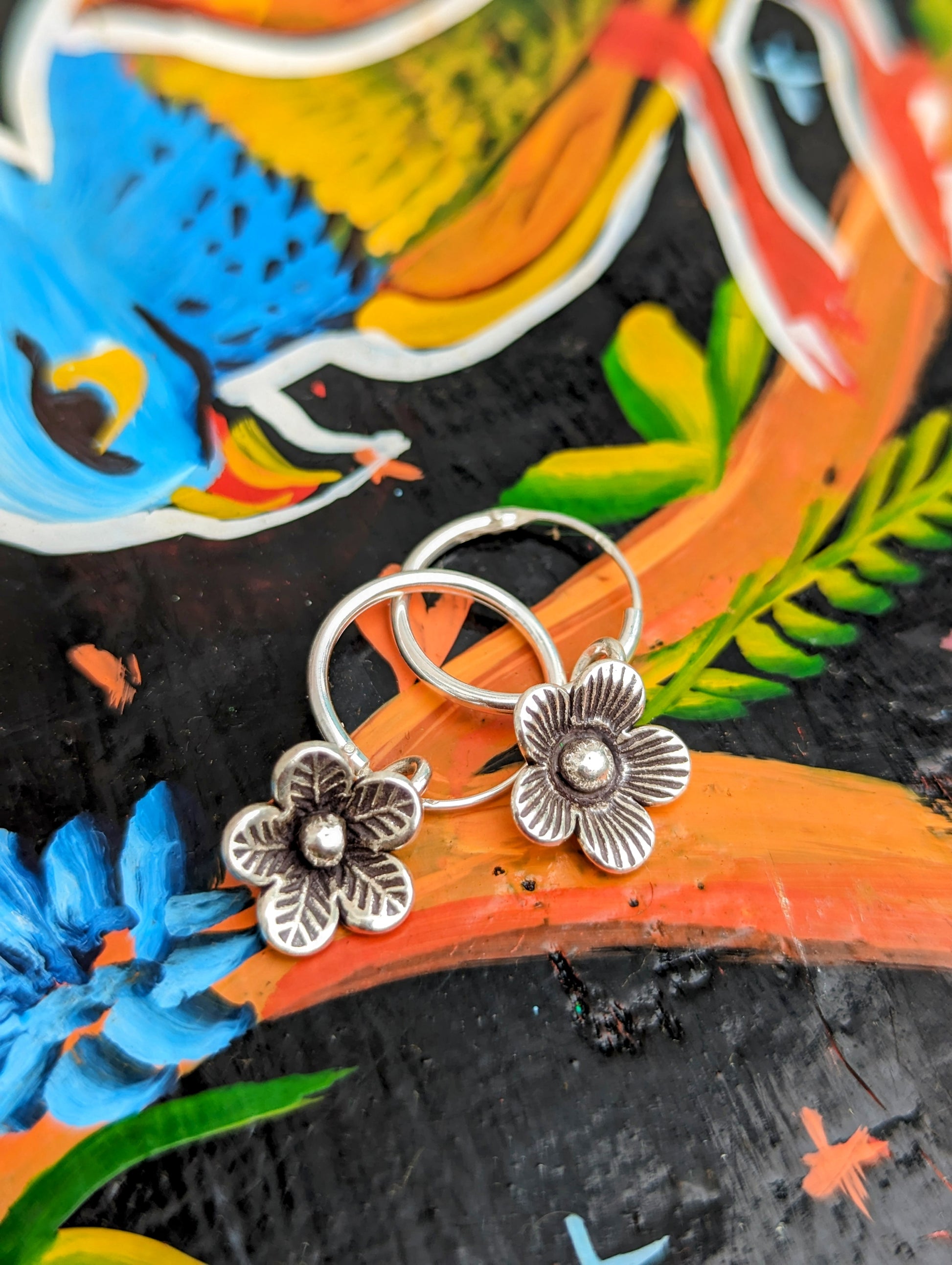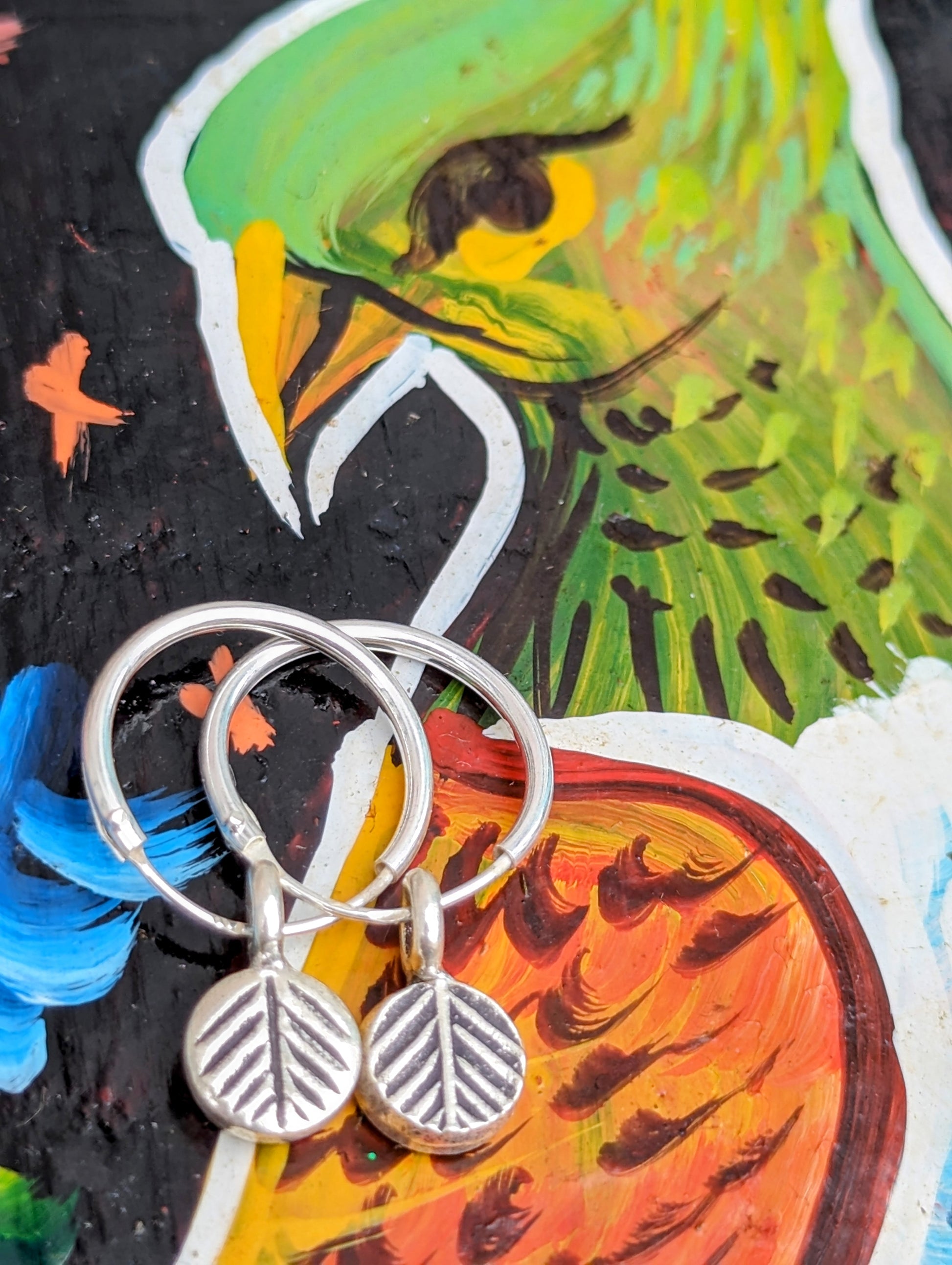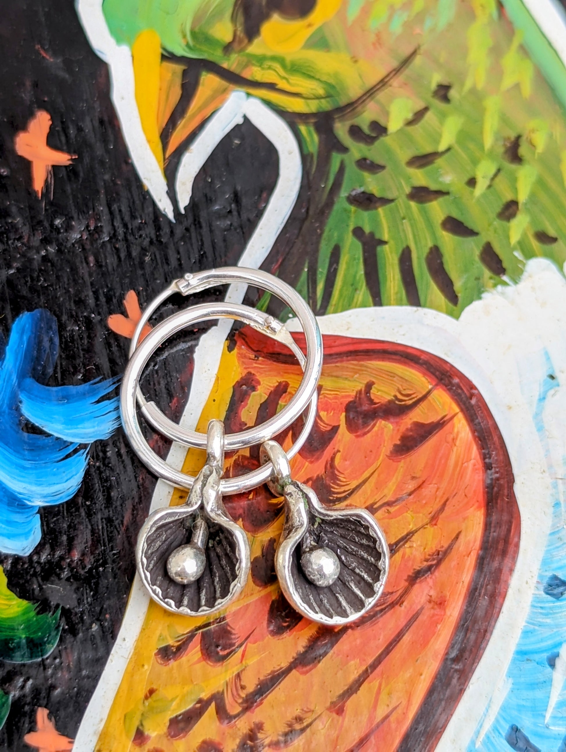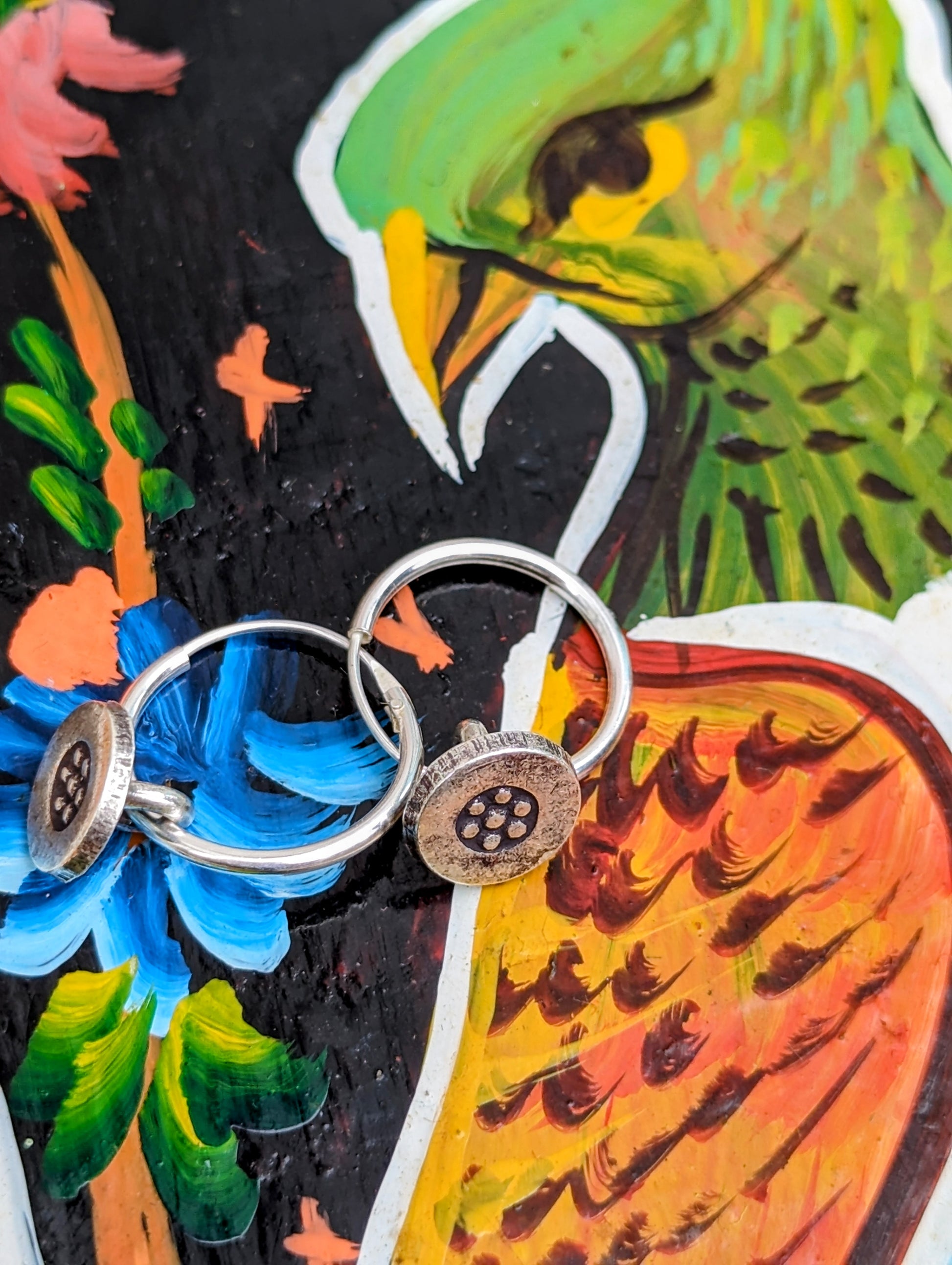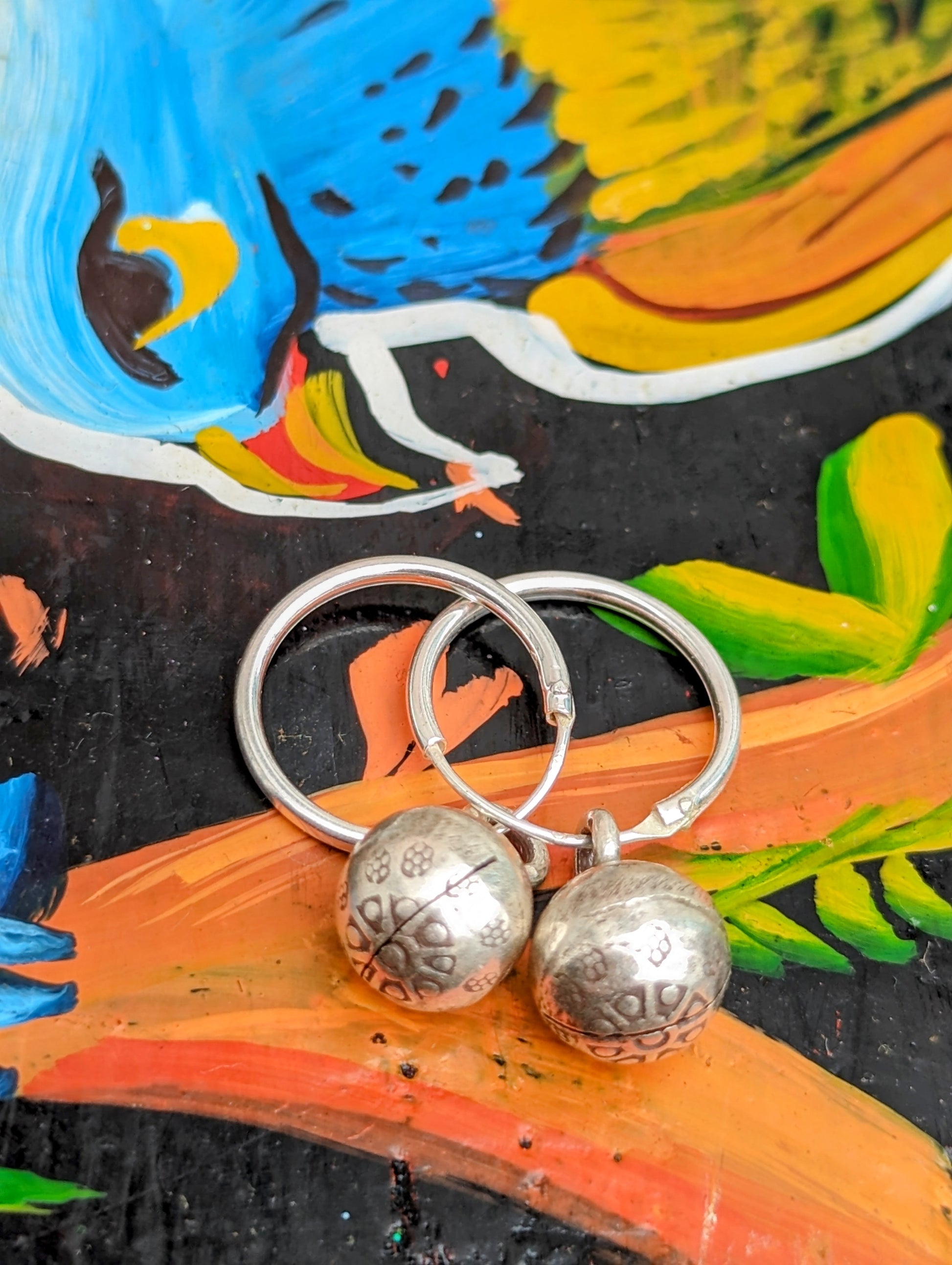 Handmade Burmese Karen tribe charms on sterling silver hoop earrings.