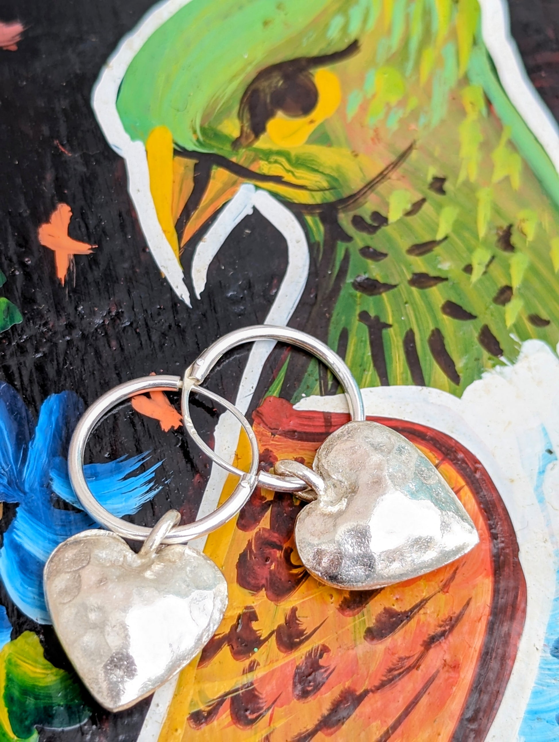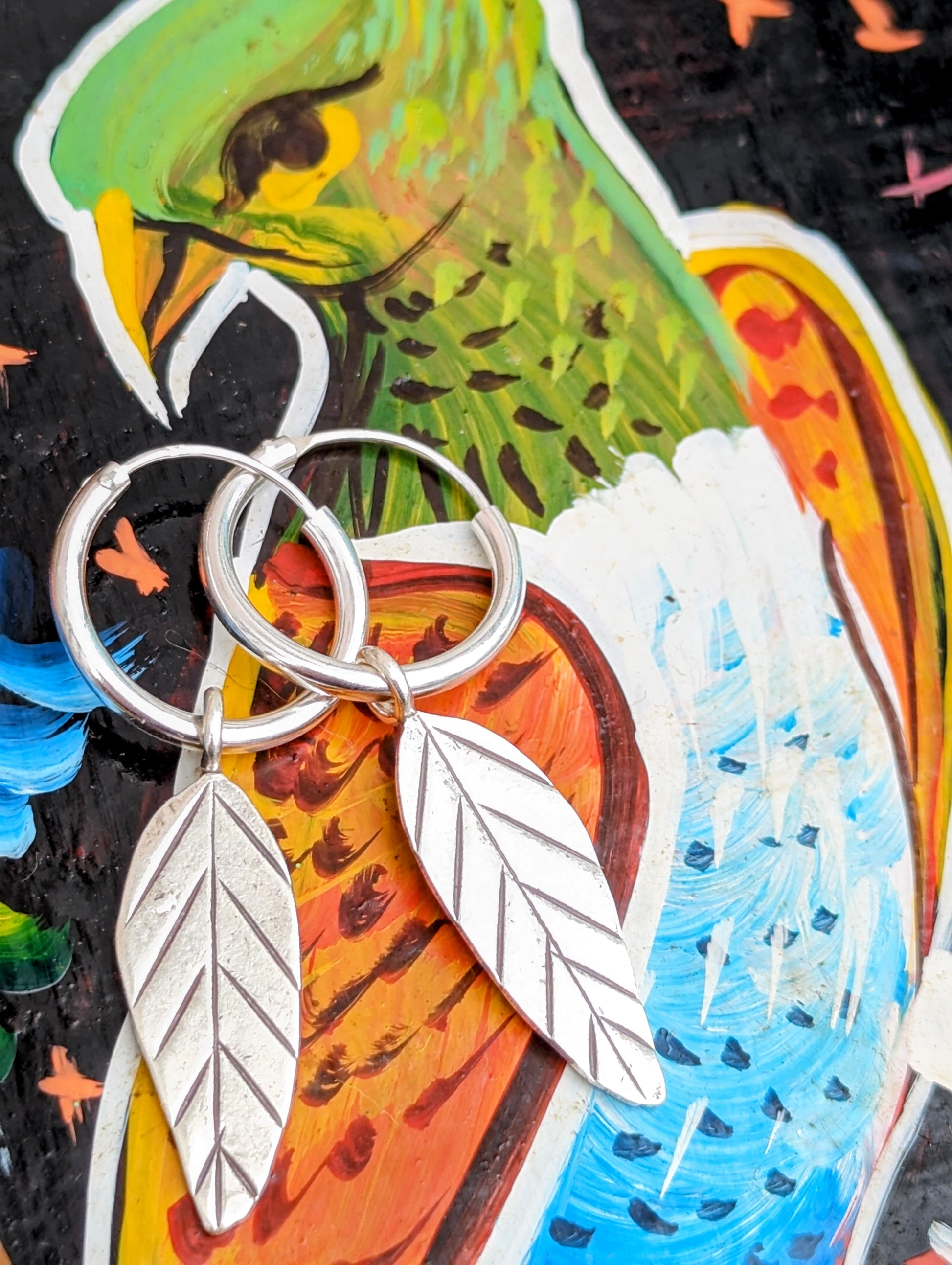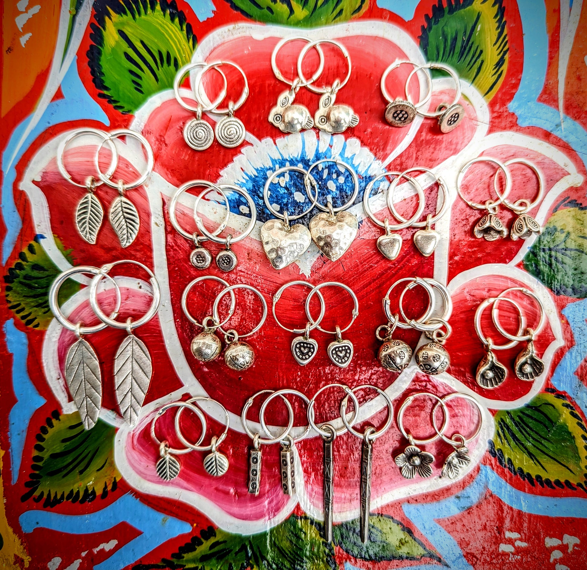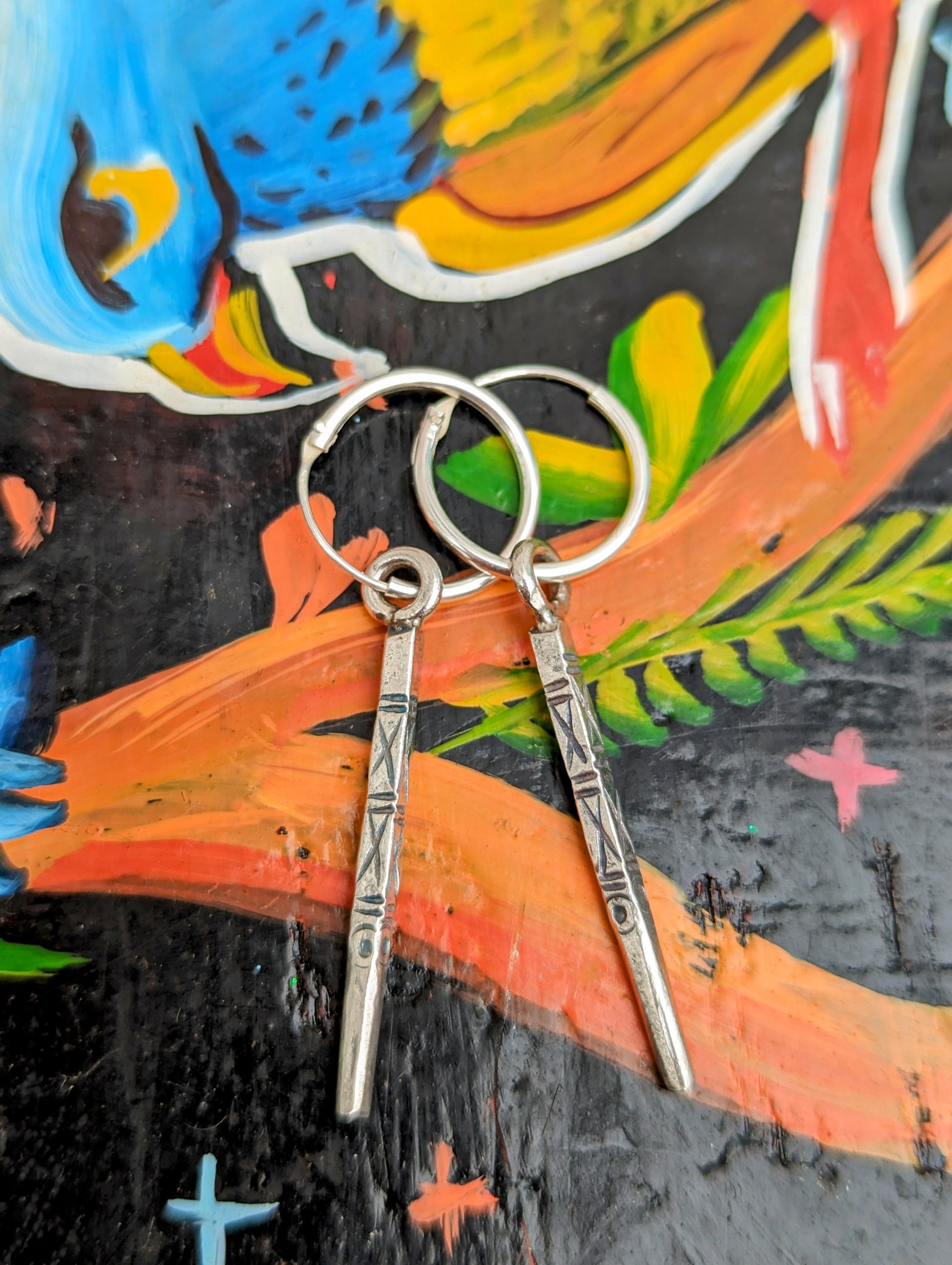 Handmade Burmese Karen tribe charms on sterling silver hoop earrings.