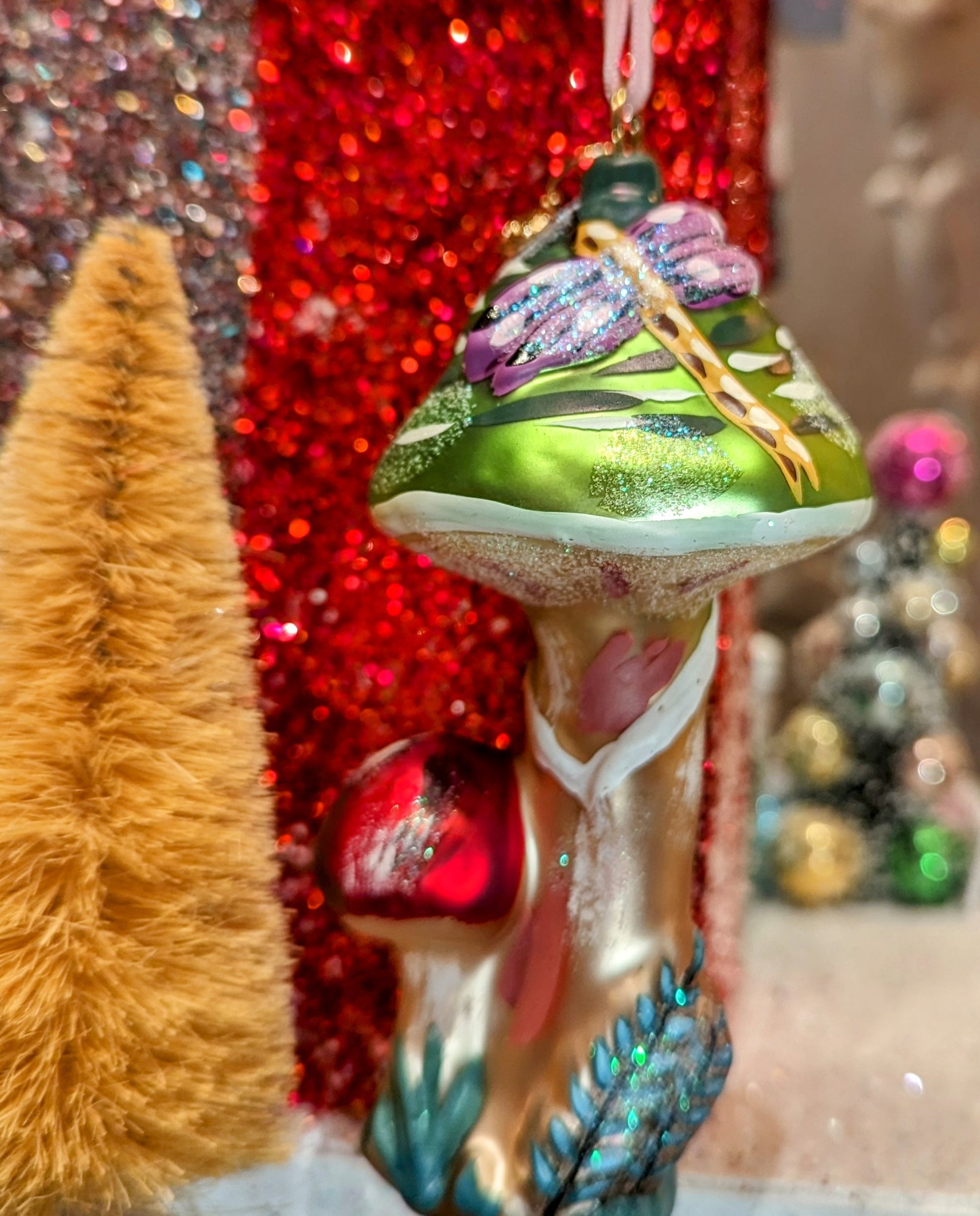 Gorgeous glass super wacky toadstools!!! All hand painted and hand finished with glitter! Beautiful detail from above and below & complete with cotton velvet ribbon..... Its all in the detail!