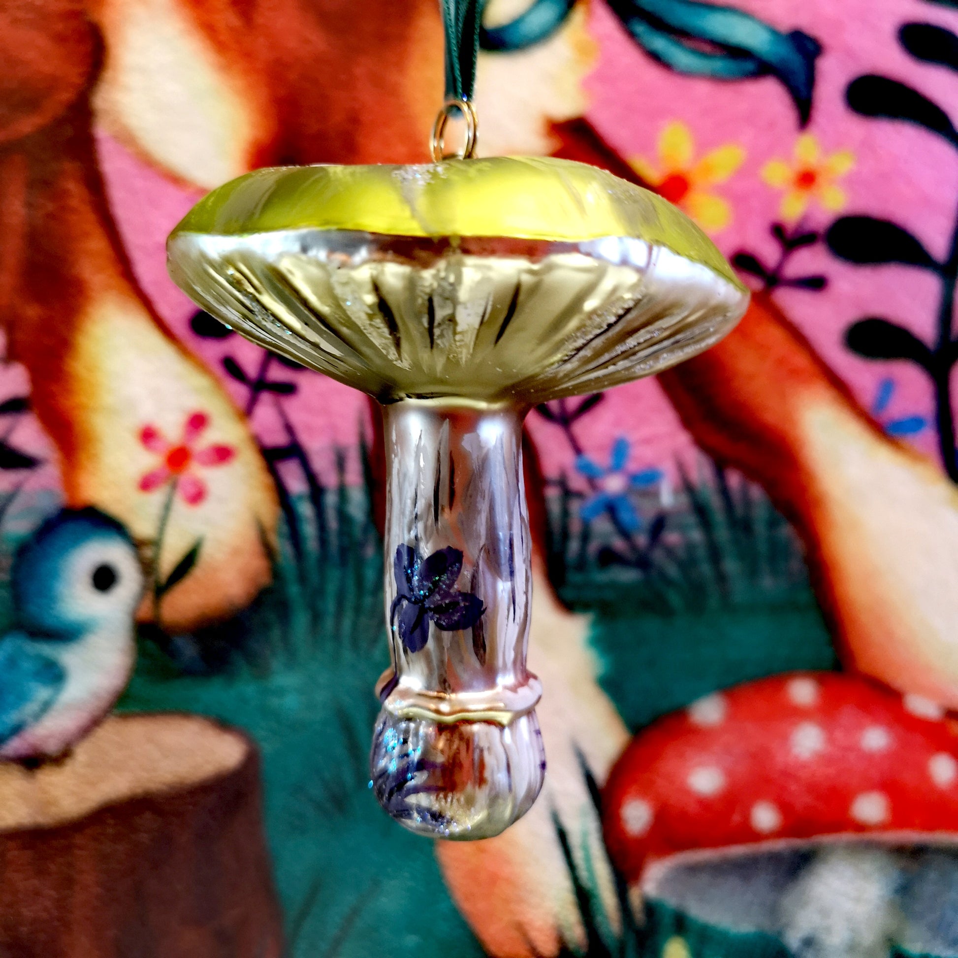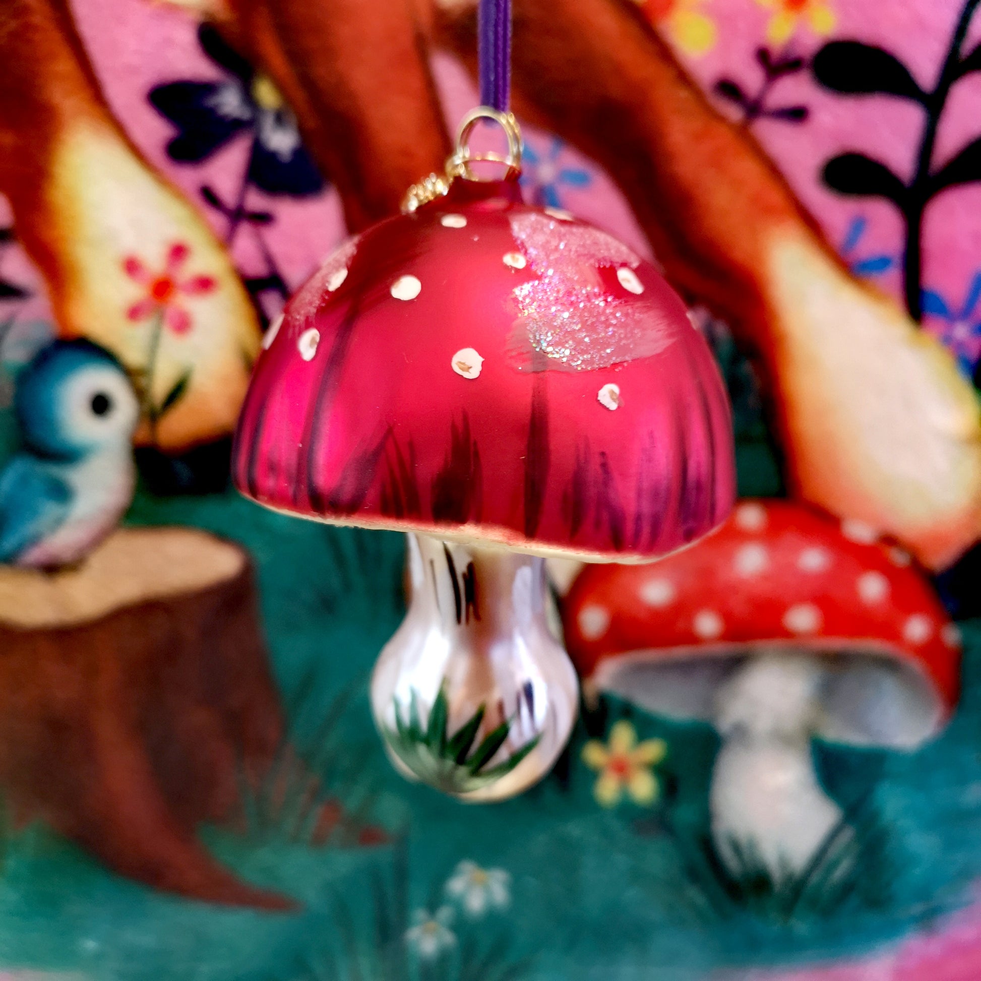 Gorgeous glass mushrooms in an array of colours!!! All hand painted and hand finished with glitter! Beautiful detail from above and below & complete with cotton velvet ribbon..... Its all in the detail!