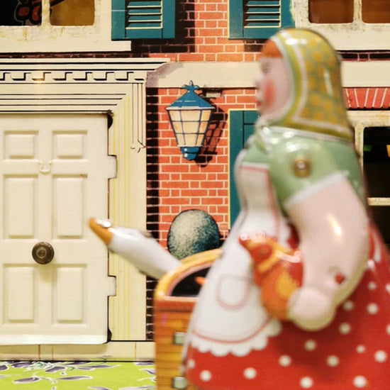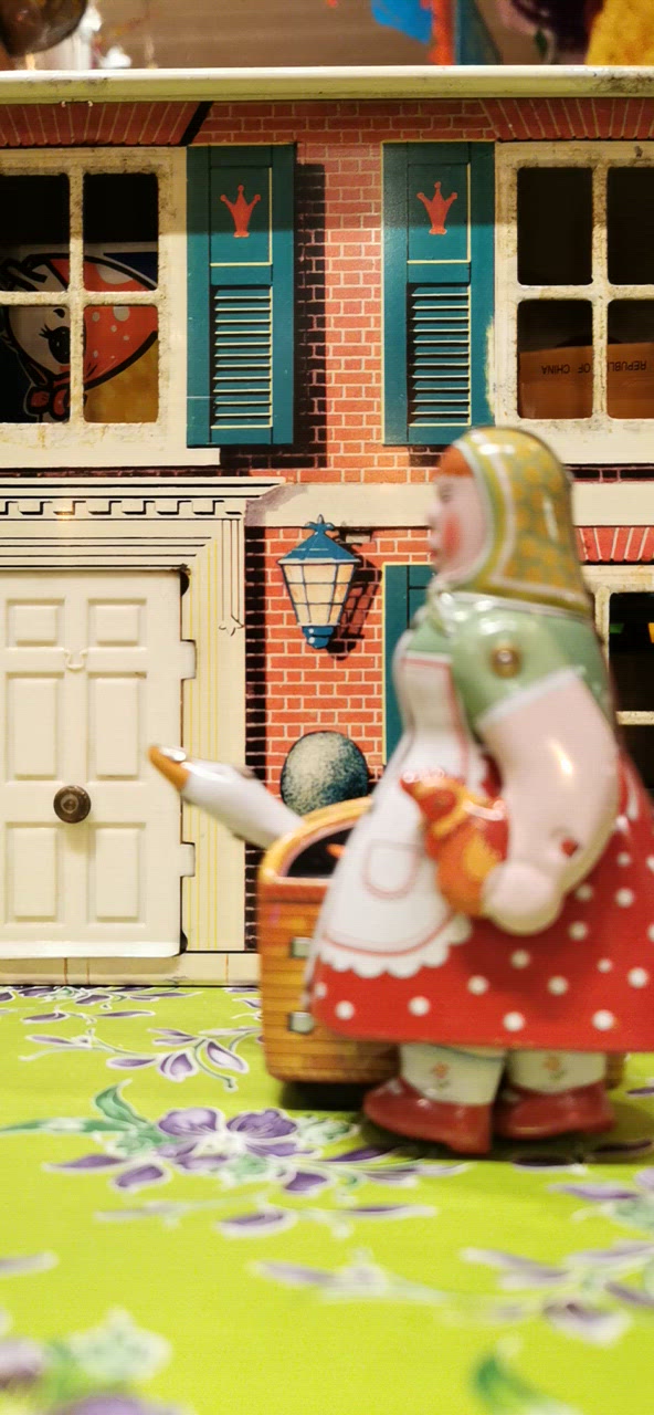 Fabulously attired lady with her chicken and goose trundling off to market!
