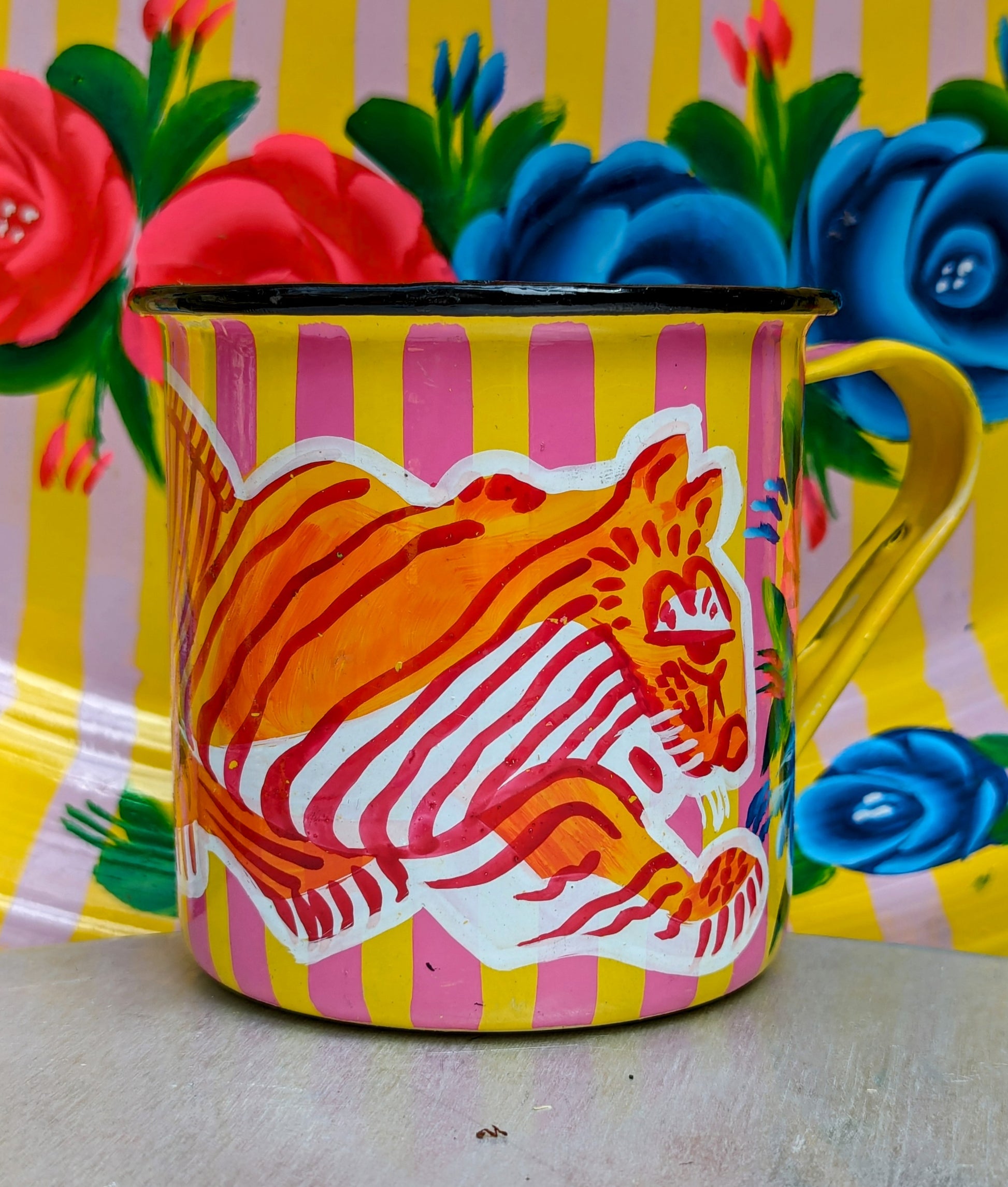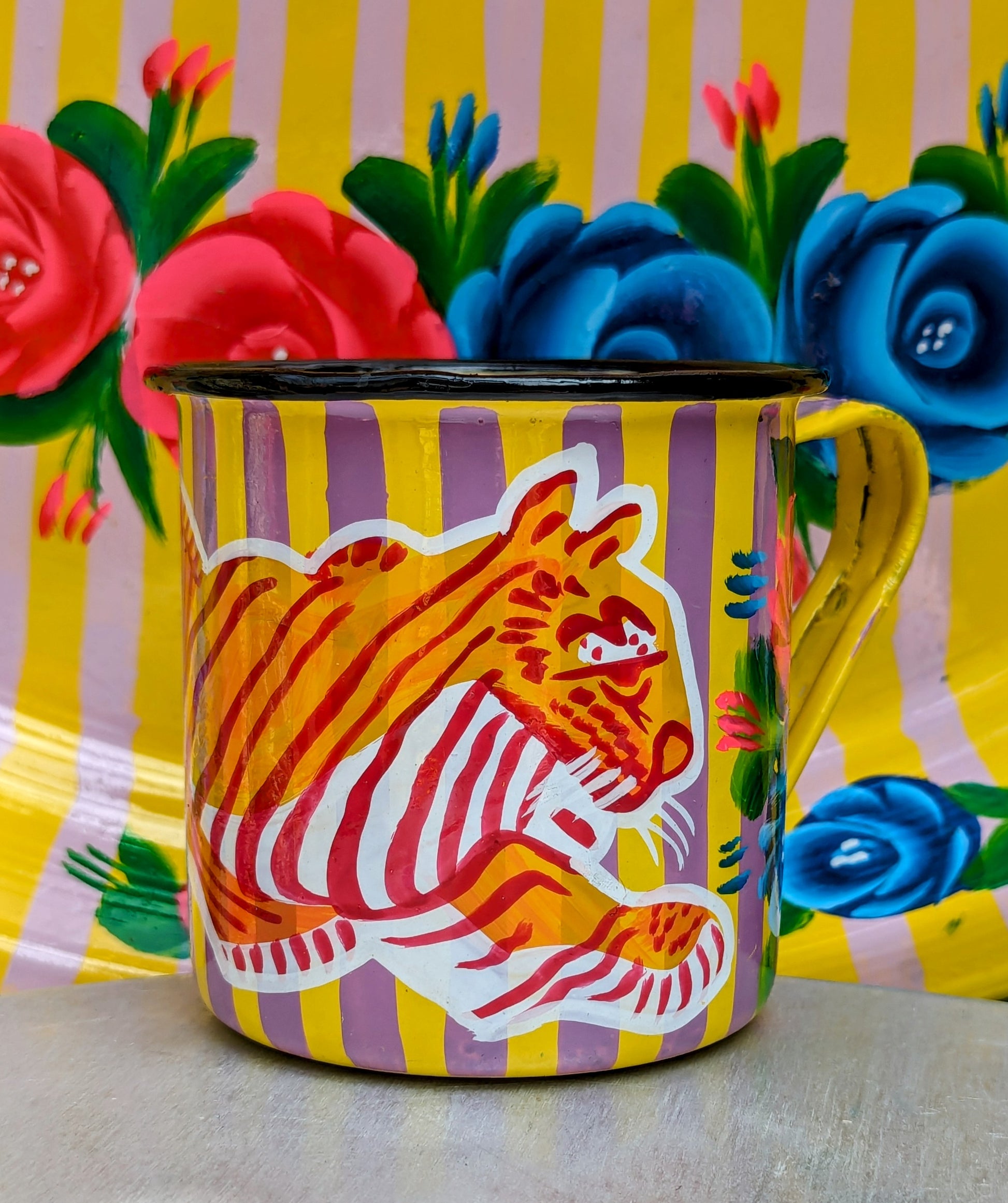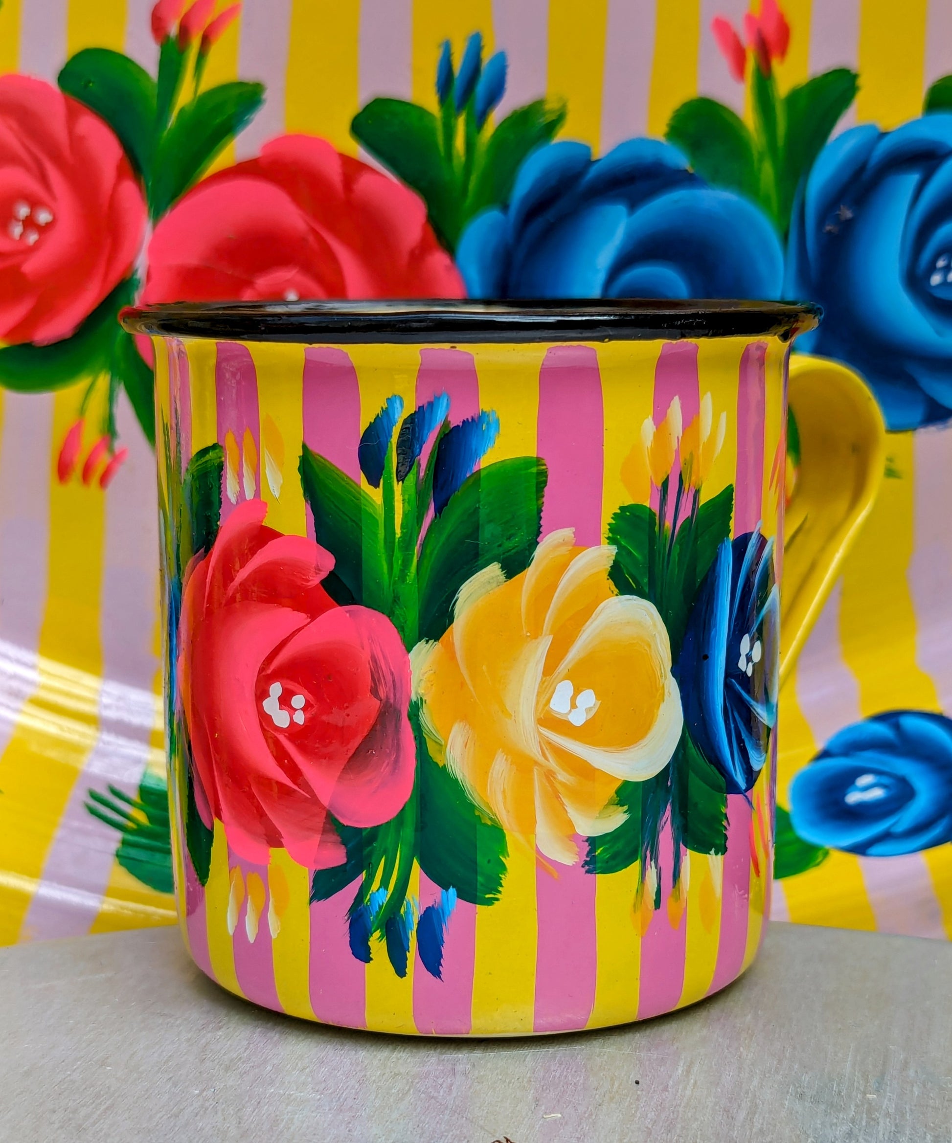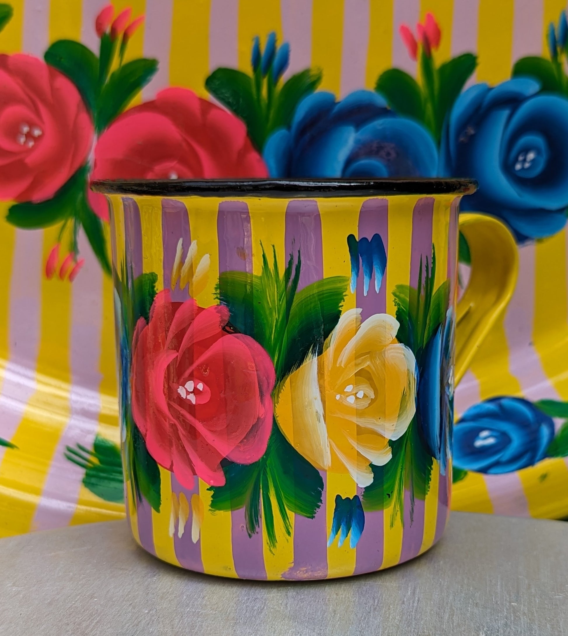 Painted truck art enamel mugs - yellow stripes