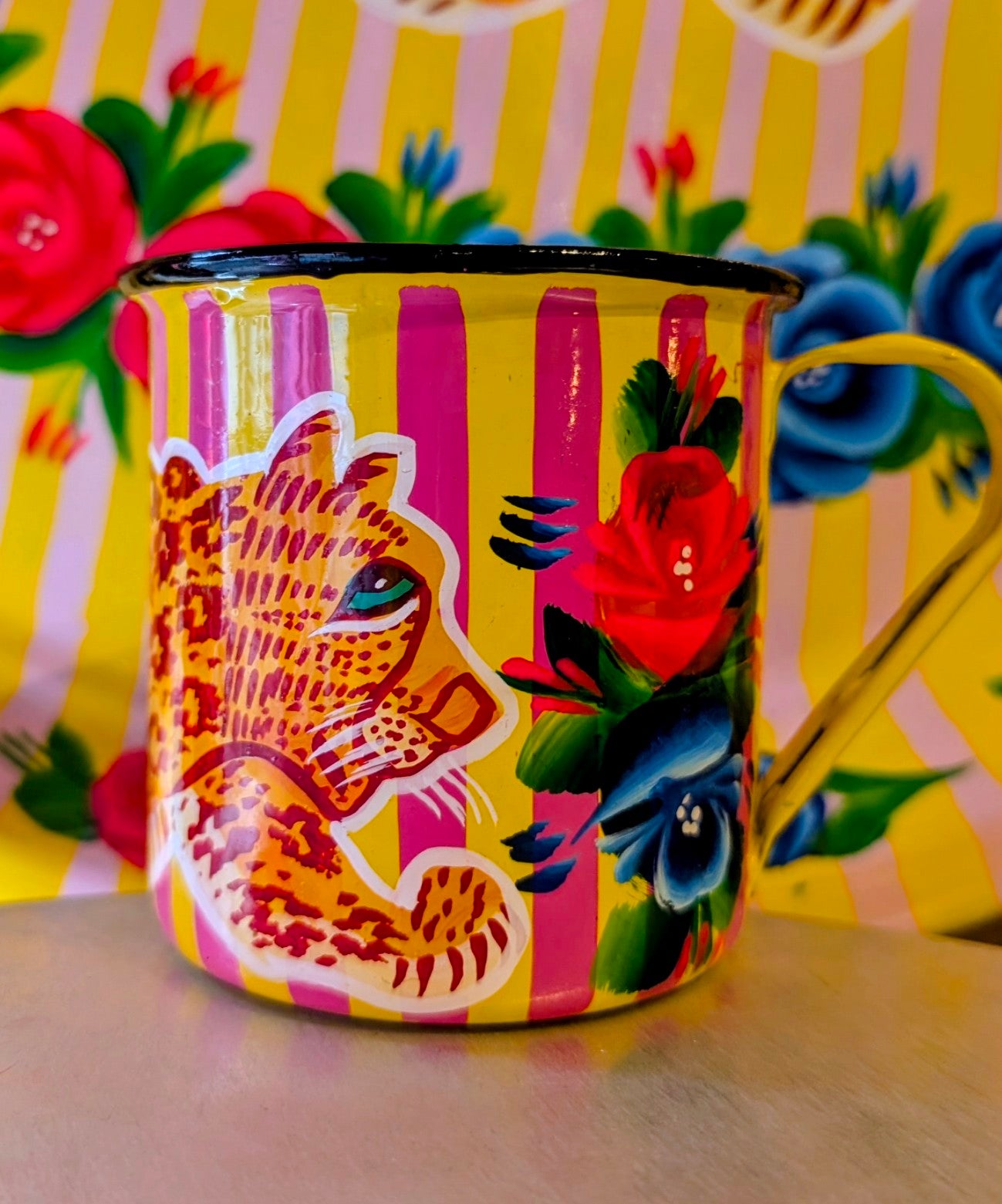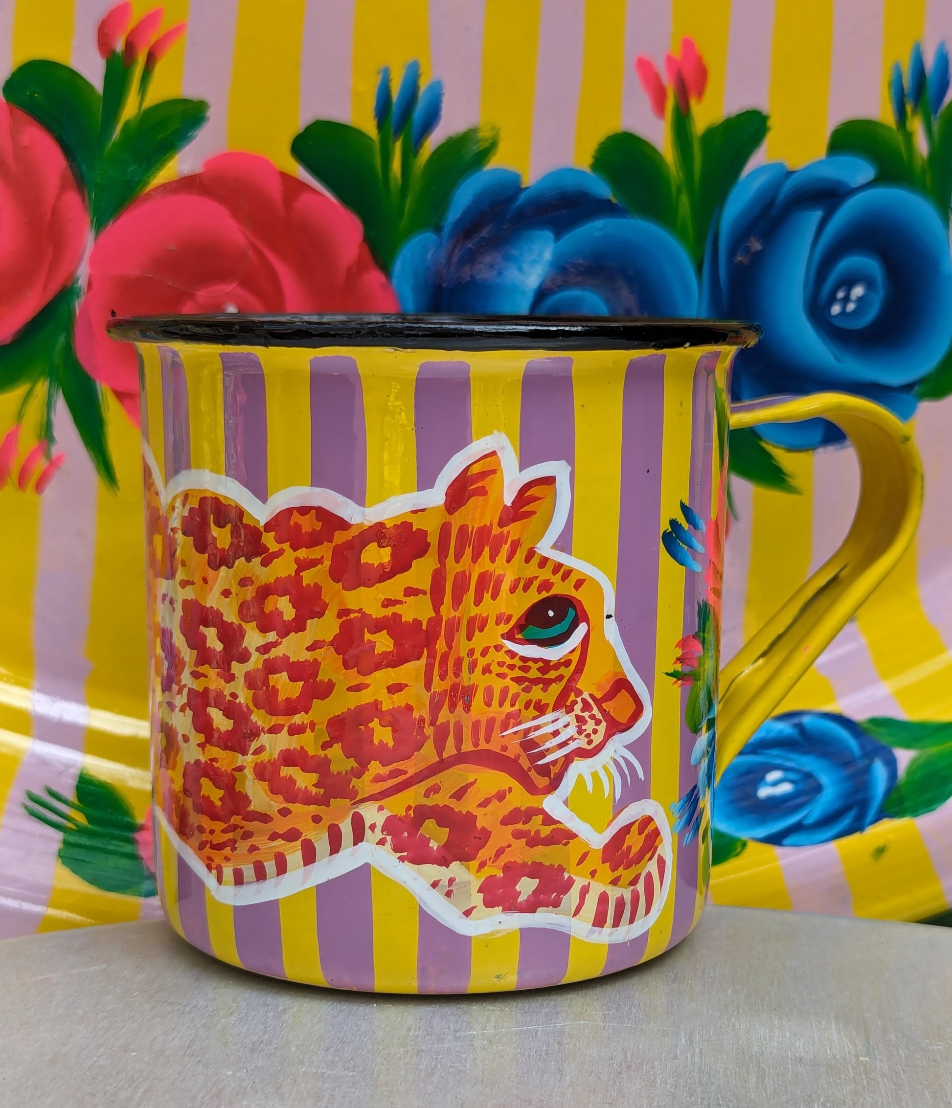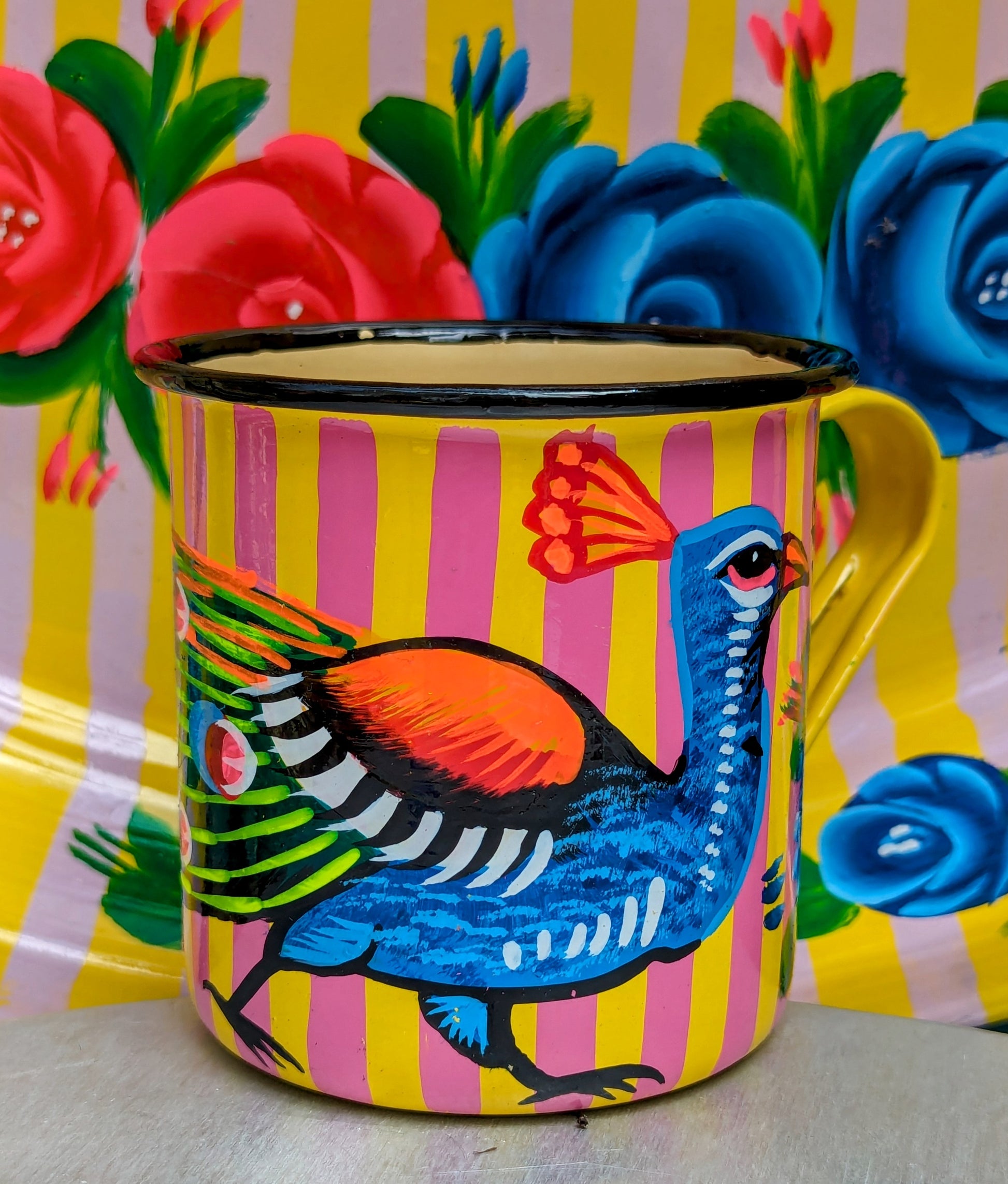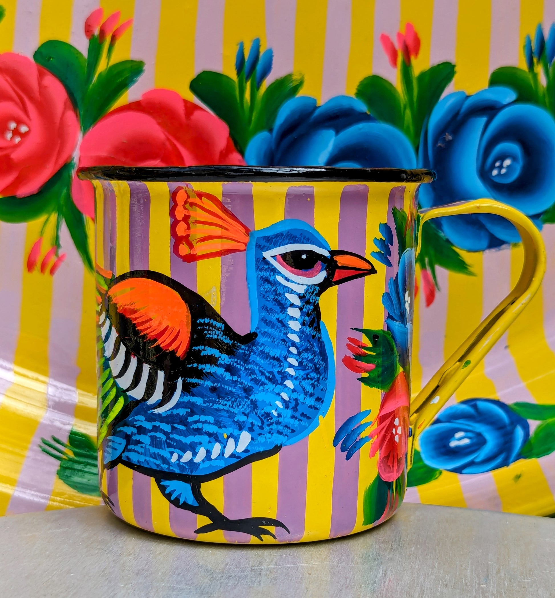 Handpainted in Pakistani by the artisans that paint the fabulously flamboyant trucks! These mugs are painted with heavy duty enamel paints onto deadstock enamelware. Suitable for light cool water washing only. Due to there handmade production, designs may vary and also have imperfections.