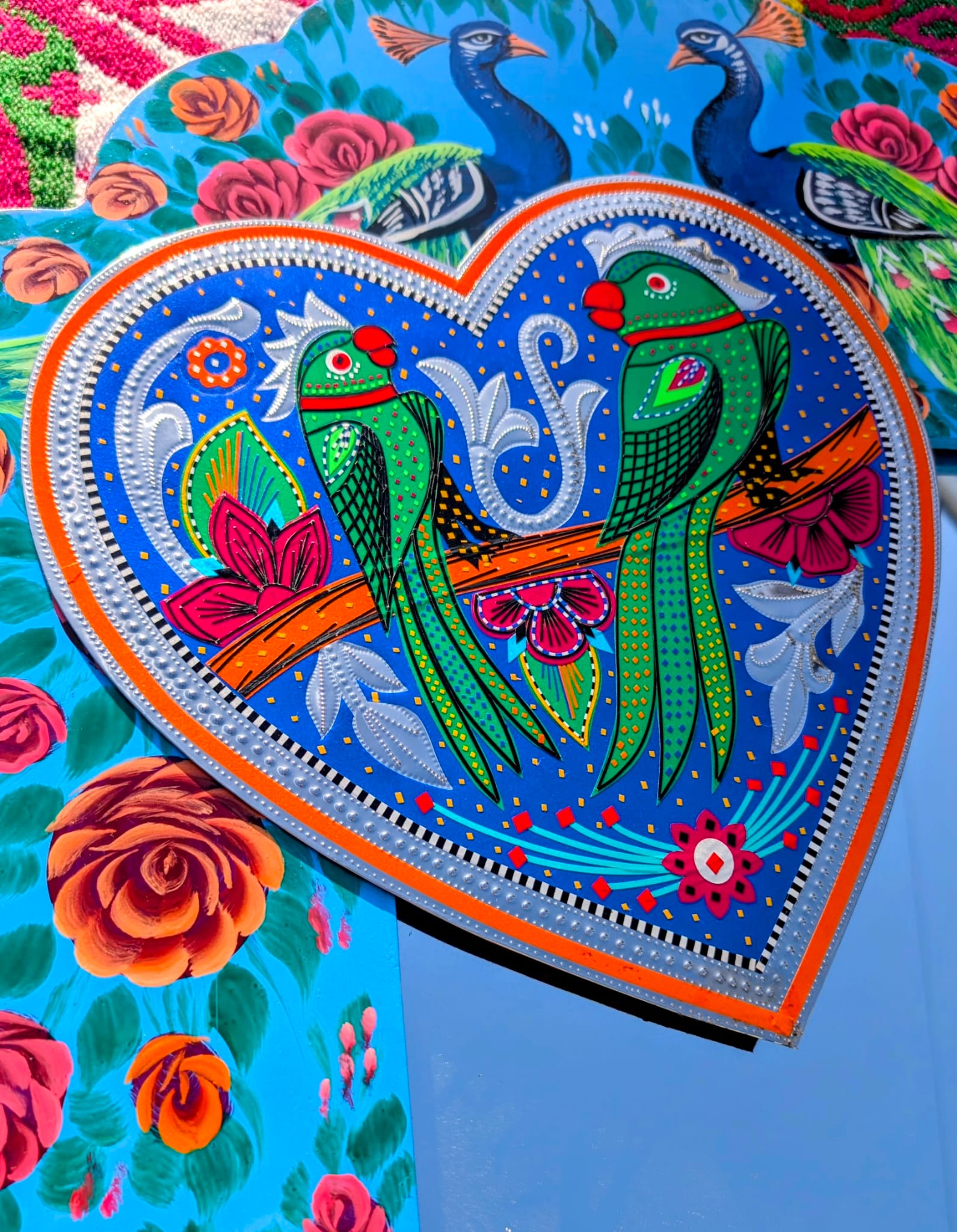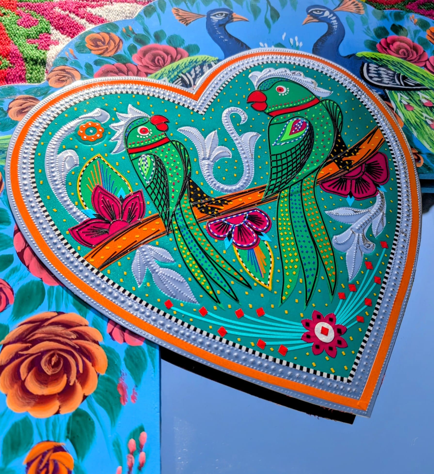 Stunning, sturdy metal love hearts, hand punched and decorated with true loving parakeets depicted in razor cut vinyl by the truck artists of Pakistan